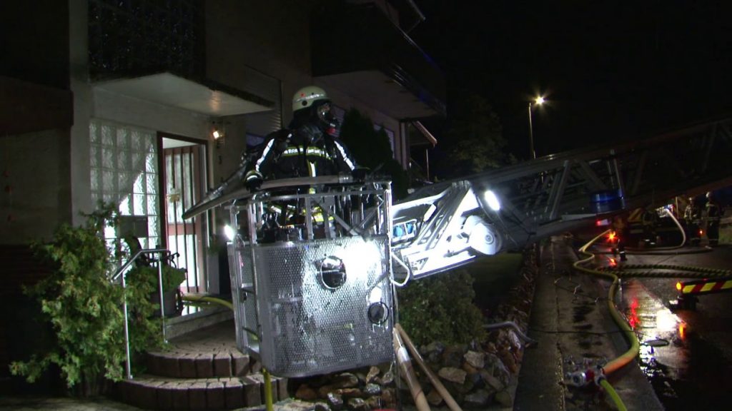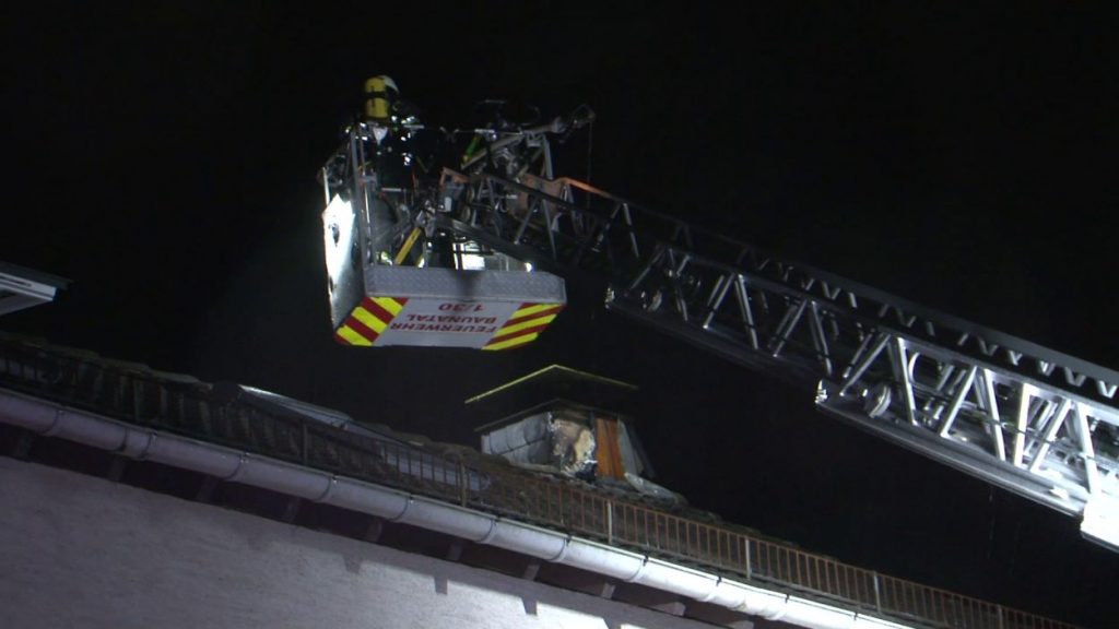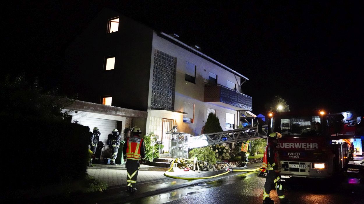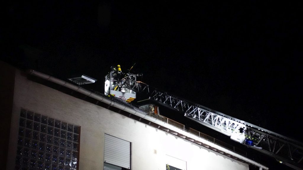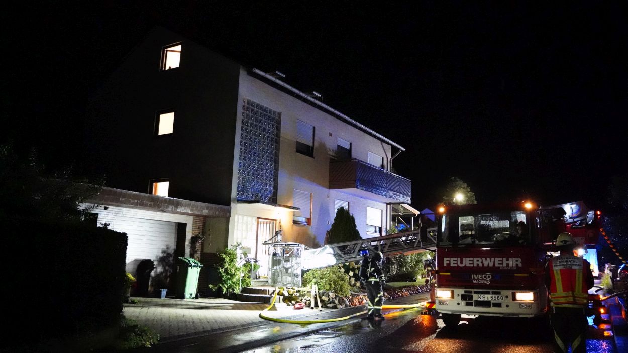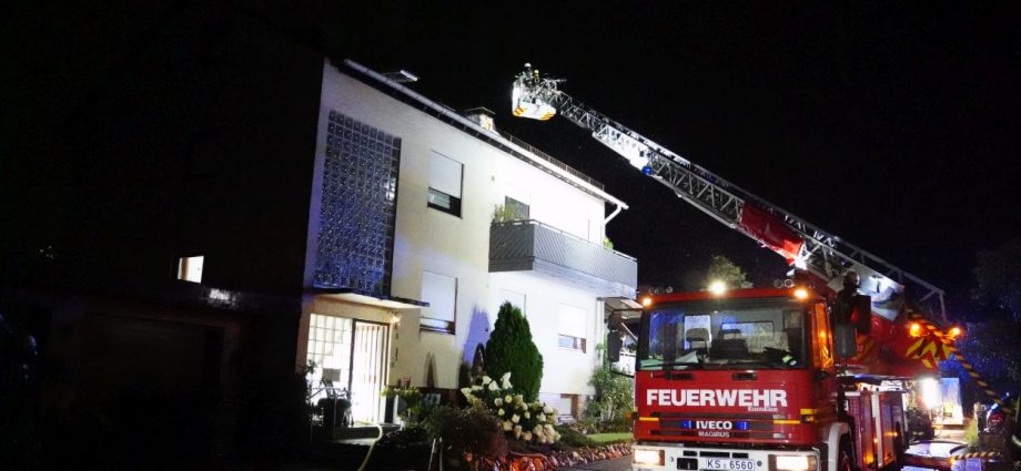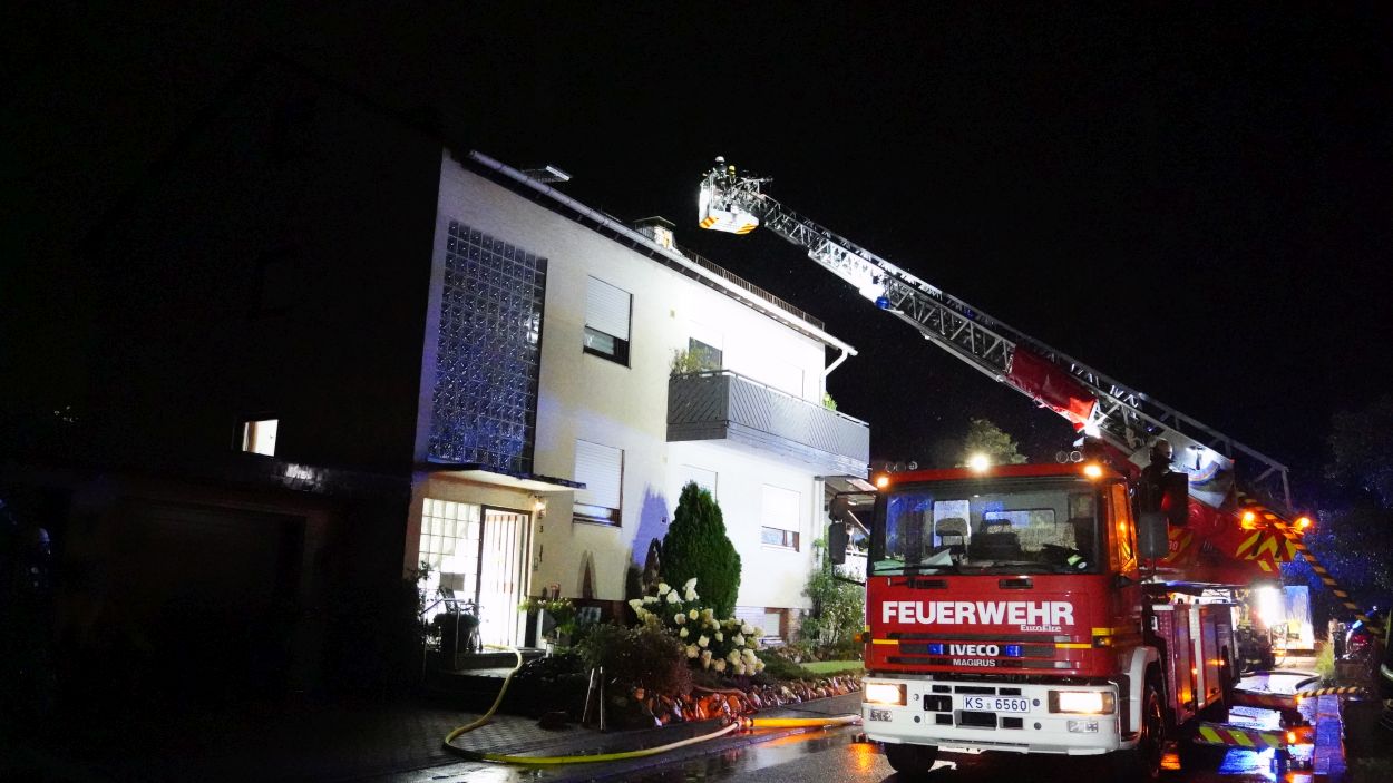 Baunatal – Ein kurzes, aber kräftiges Gewitter mit Starkregen zog in der Nacht auf Mittwoch über Nordhessen. Gegen 23 Uhr schlug dann ein Blitz in einen Dachstuhl eines Mehrfamilienhauses im Baunataler Ortsteil Großenritte ein. Als die alarmierte Feuerwehr am Wohnhaus eintraf, stand der Dachbereich in der Nähe des Schonsteines in Flammen. Über die Drehleiter konnte das Feuer schnell unter Kontrolle gebracht werden. Ein Trupp unter Atemschutz löschte die Glutnester im Dachbereich von innen. Die Wohnung im Dachgeschoss war verraucht und musste belüftet werden. Ein größerer Schaden konnte verhindert werden. Die drei Hausbewohner konnten das Gebäude rechtzeitig verlassen und blieben unverletzt.