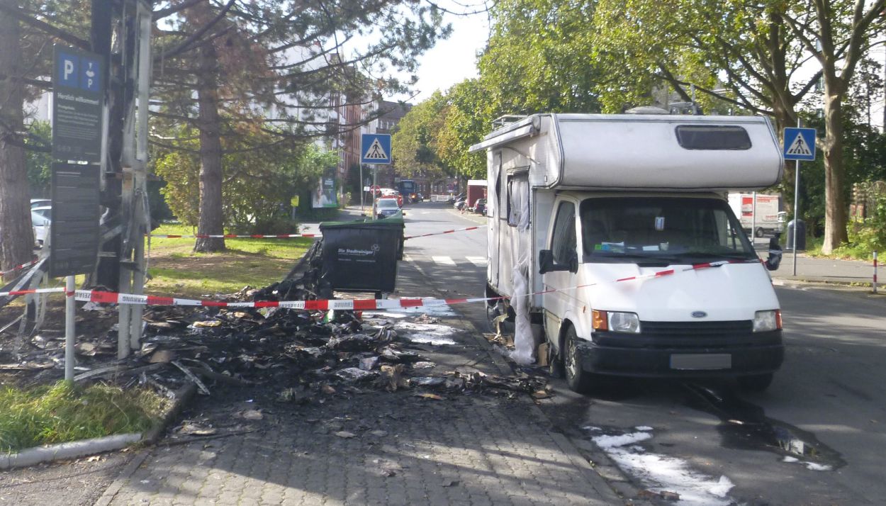 KasselNach einem Brand in der Nacht auf Montag im Kasseler Stadtteil Wesertor sucht die Polizei Zeugen. Die Feuerwehr und die Polizei wurden gegen 3 Uhr in der Straße Franzgraben alarmiert. Zunächst war ein Altpapiercontainer neben der Parkplatzeinfahrt eines Supermarktes in Brand geraten. Das Feuer griff im fortgesetzten Verlauf auf zwei weitere Mülltonnen, eine Werbetafel, einen Baum und ein am Straßenrand geparktes Wohnmobil über. Trotz der schnell eingeleiteten Löscharbeiten wurden die drei Container durch das Feuer völlig zerstört. Auch die Werbetafel brannte bis auf das Metallgestell nieder. Weiterhin wurden Teile des Wohnmobils durch die Hitzeentwicklung erheblich in Mitleidenschaft gezogen, wodurch es nicht mehr fahrbereit ist. Die Polizei geht von Brandstiftung aus. Aus diesem Grund bitten die Kriminalbeamten mögliche Zeugen, die verdächtigen Personen an der Brandstelle beobachtet haben und Täterhinweise geben können, sich unter Tel. 0561-9100 beim Polizeipräsidium Nordhessen zu melden.