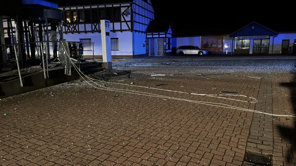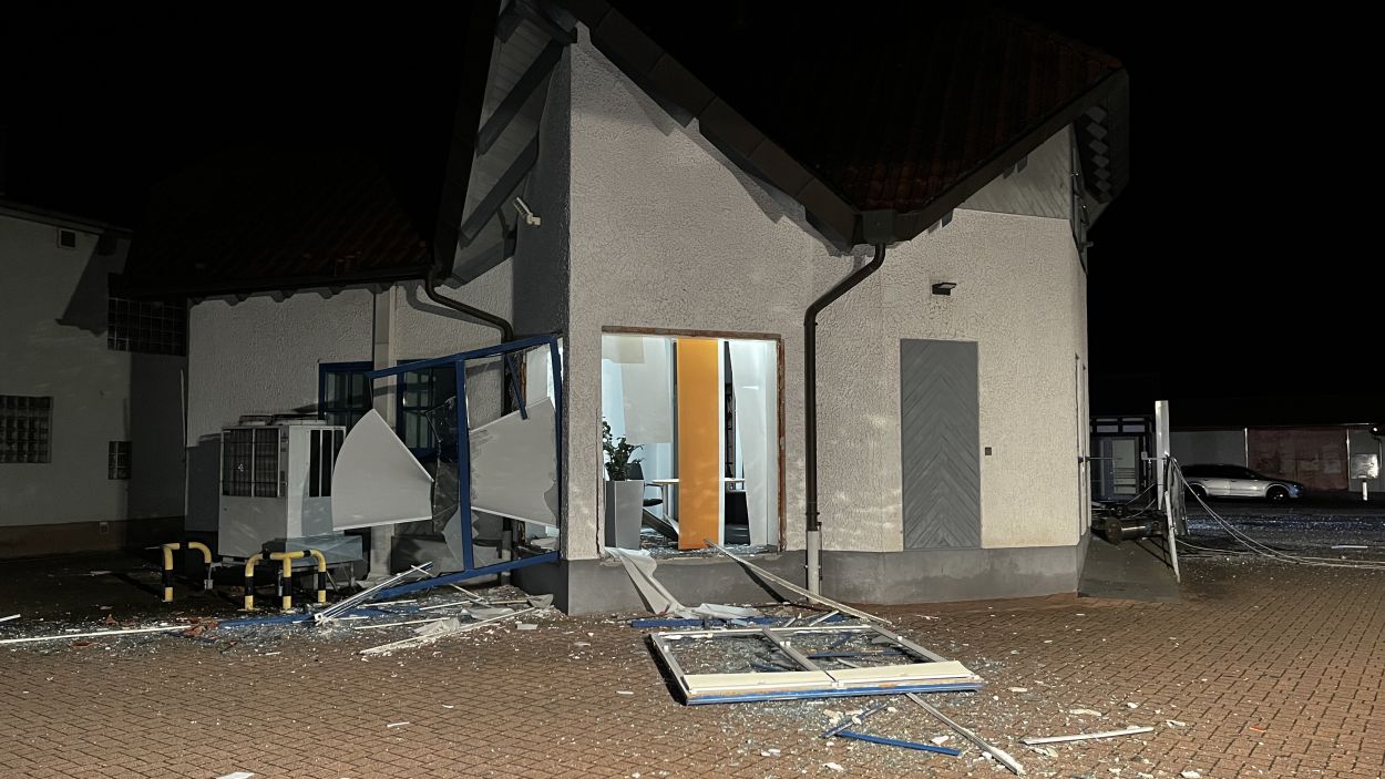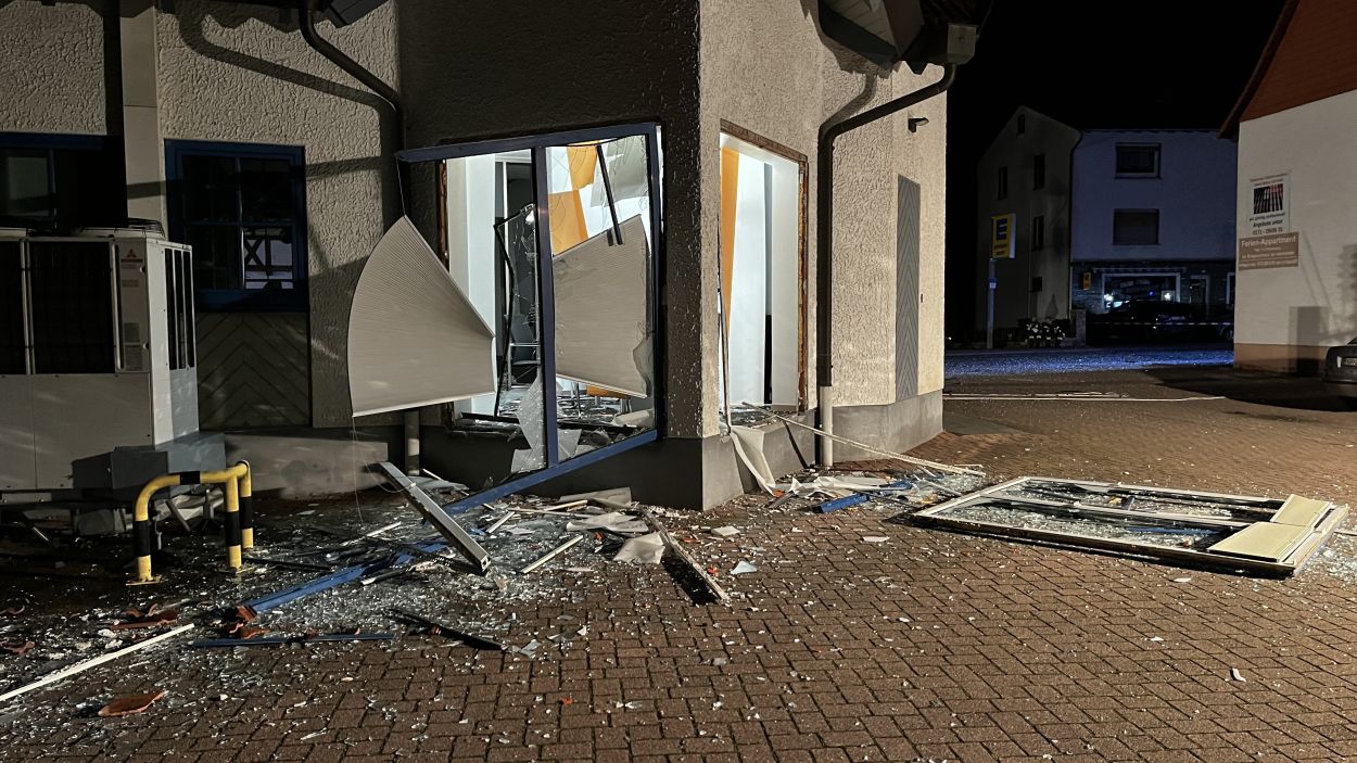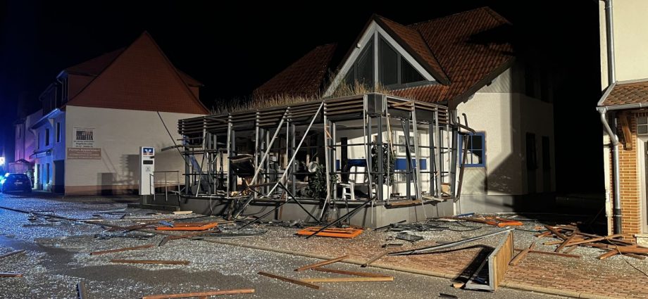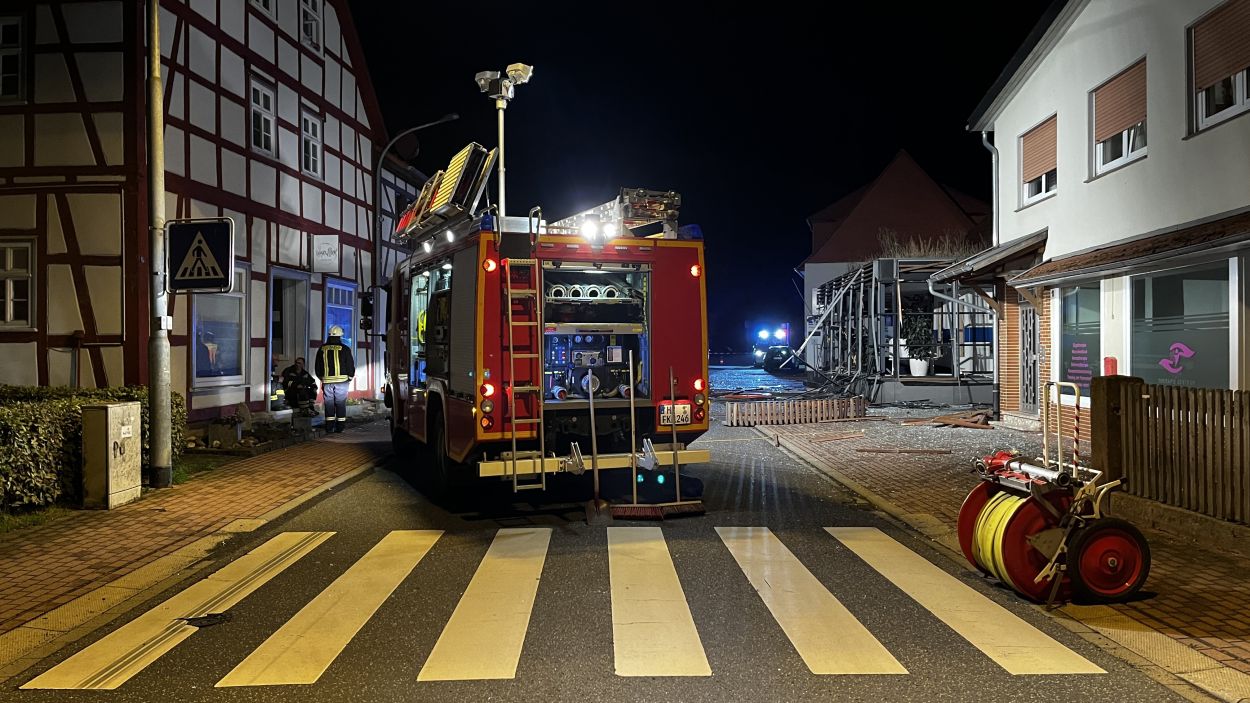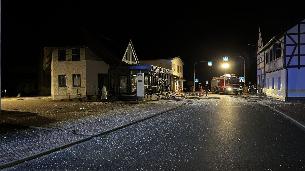 Es müssen heftige Explosionen gewesen sein, welche den kleinen Ort an der Autobahn 7 am frühen Freitagmorgen erschüttert haben. Anwohner berichteten von Insgesamt drei Explosionen. Die Hauptstraße im Bereich der Volksbank gleicht einem Trümmerfeld und ist übersäht von Glassplittern, Metall, Holzbalken und ganzen Fensterrahmen. Selbst an benachbarten Gebäuden gingen durch die Detonationen Scheiben zu Bruch. Das Bankgebäude selbst wurde im Inneren vollständig zerstört. Ob die Täter mit Gas oder anderweitigem Sprengstoff gearbeitet haben, konnte vor Ort nicht abschließend geklärt werden. Lediglich zwei lange Kabelstränge, welche aus dem Bankgebäude zu einer Hausecke führten, könnten zum Vorgehen einen ersten Hinweis geben. Die Polizei hat hierzu die Ermittlungen bereits aufgenommen Für die Anwohner war es ein großer Schreck. Mehrere von ihnen wurden durch die Explosionen aus dem Schlaf gerissen. Ein Anwohner konnte die Täter nach den Detonationen bei der Tat beobachten und die Polizei verständigen. Gefährlich schien auch die spätere Flucht gewesen zu sein. Nach Informationen von einem Augenzeugen rasten die Unbekannten in der Ortslage mit hoher Geschwindigkeit an ihm vorbei. Glücklicherweise konnte der Mann noch rechtzeitig zur Seite gehen. Ob und wieviel Geld die Täter letztendlich erbeutet haben, dazu konnte die Polizei vor Ort noch keine Angaben machen. Auch die Schadenshöhe am Gebäude muss erst noch durch einen Sachverständigen ermittelt werden. Neben der Polizei waren die Feuerwehrkameraden aus Remsfeld mit insgesamt 15 Einsatzkräften vor Ort. Ihr Einsatz beschränkte sich auf das absichern und ausleuchten der direkten Umgebung der Einsatzstelle. Verletzt wurde niemand. (mpu)