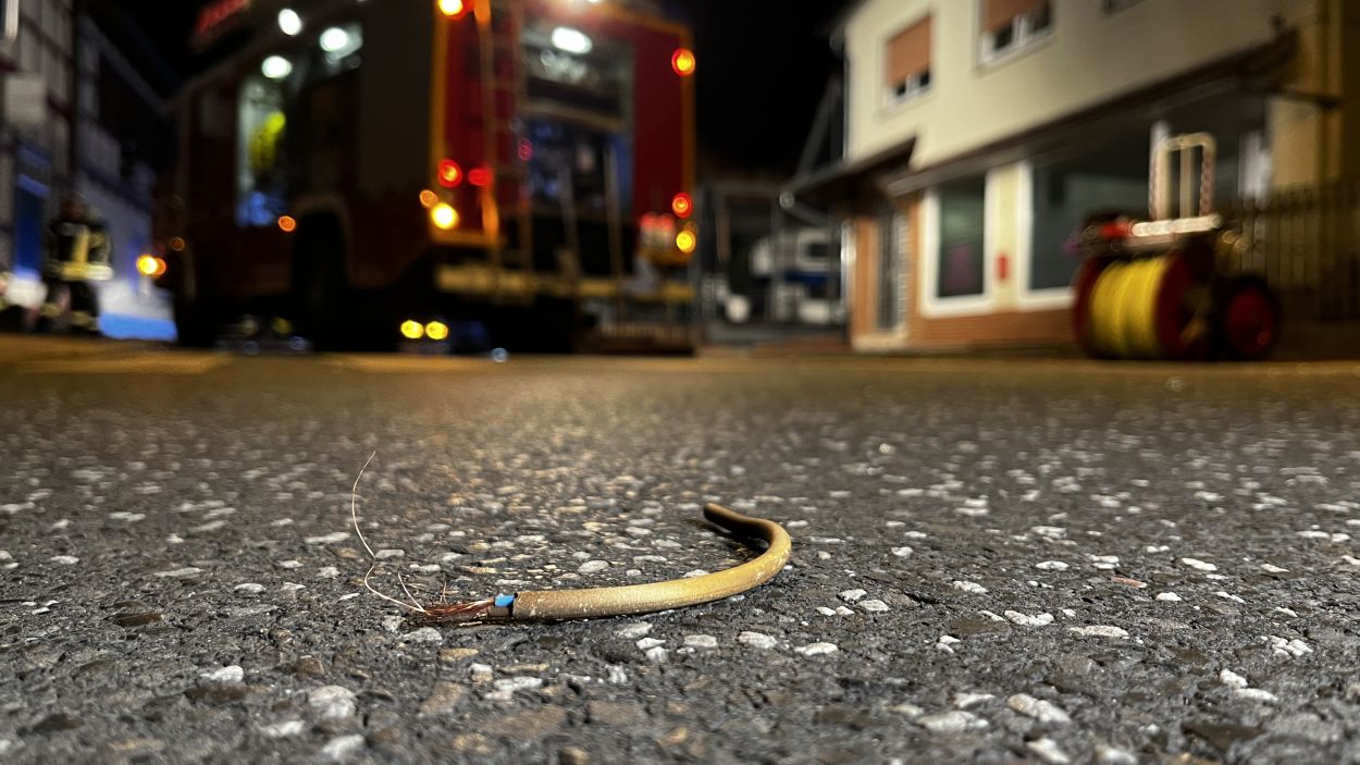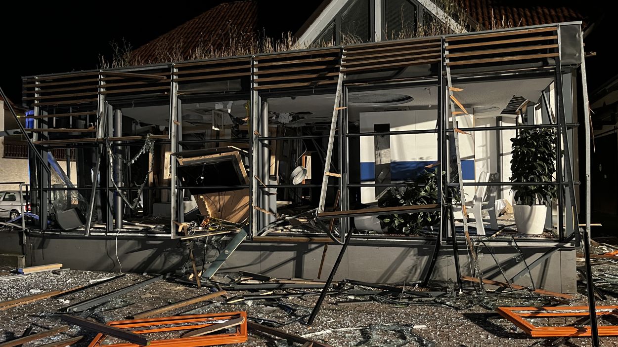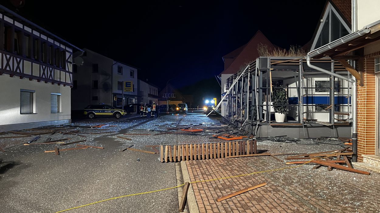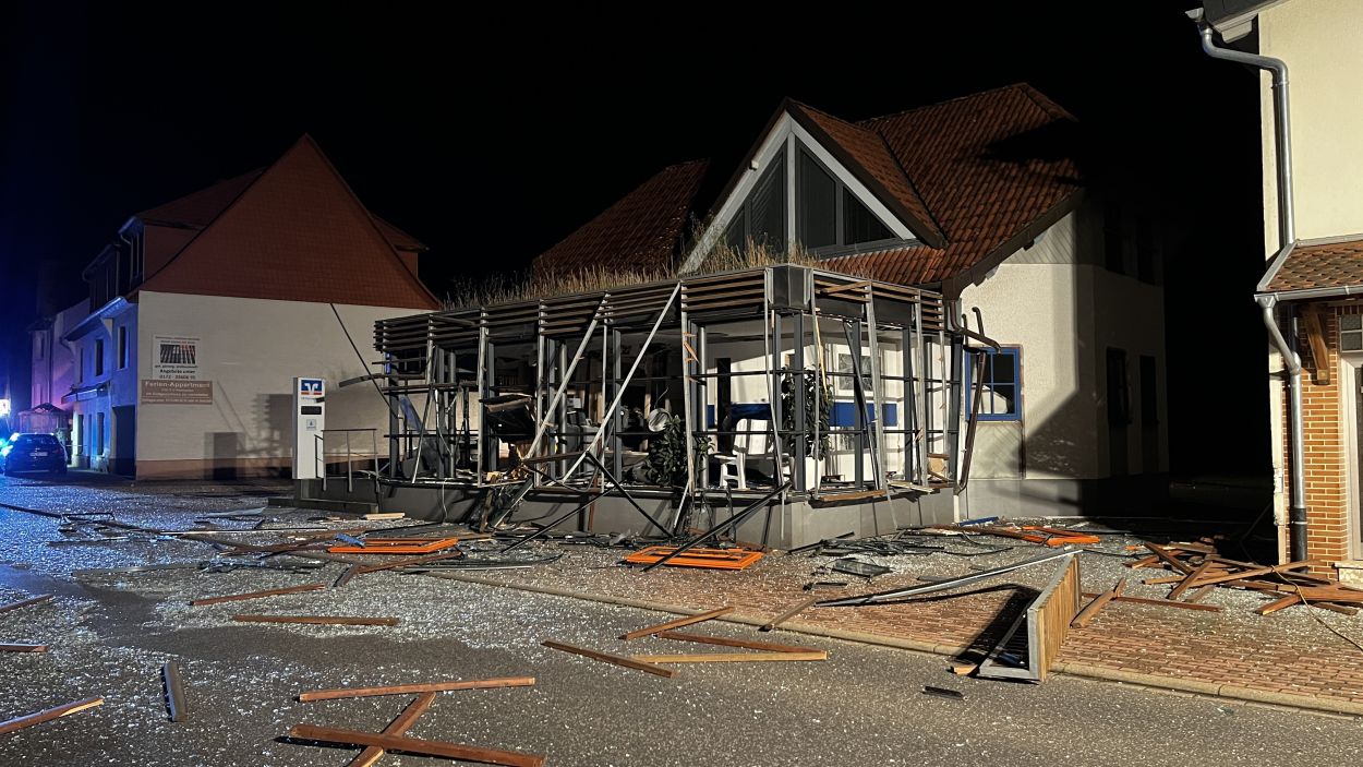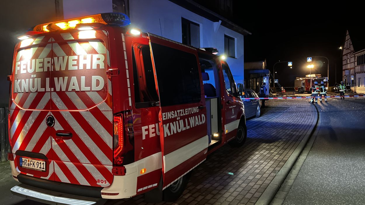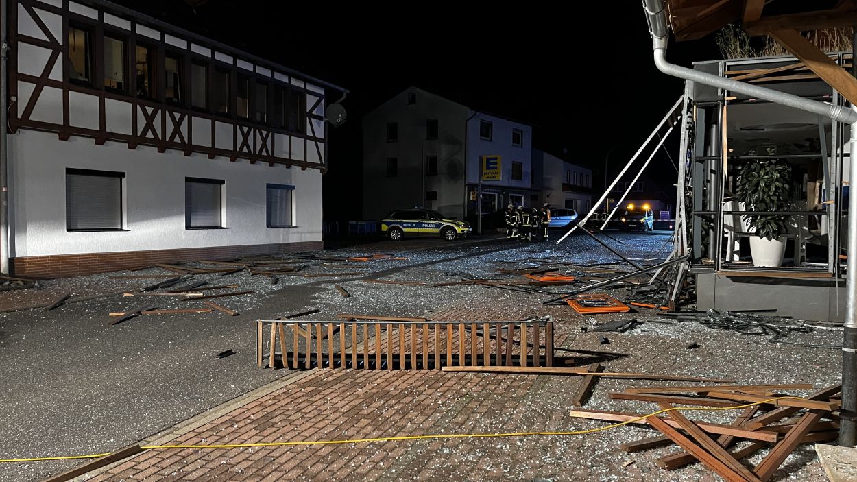 Es müssen heftige Explosionen gewesen sein, welche den kleinen Ort an der Autobahn 7 am frühen Freitagmorgen erschüttert haben. Anwohner berichteten von Insgesamt drei Explosionen. Die Hauptstraße im Bereich der Volksbank gleicht einem Trümmerfeld und ist übersäht von Glassplittern, Metall, Holzbalken und ganzen Fensterrahmen. Selbst an benachbarten Gebäuden gingen durch die Detonationen Scheiben zu Bruch. Das Bankgebäude selbst wurde im Inneren vollständig zerstört. Ob die Täter mit Gas oder anderweitigem Sprengstoff gearbeitet haben, konnte vor Ort nicht abschließend geklärt werden. Lediglich zwei lange Kabelstränge, welche aus dem Bankgebäude zu einer Hausecke führten, könnten zum Vorgehen einen ersten Hinweis geben. Die Polizei hat hierzu die Ermittlungen bereits aufgenommen Für die Anwohner war es ein großer Schreck. Mehrere von ihnen wurden durch die Explosionen aus dem Schlaf gerissen. Ein Anwohner konnte die Täter nach den Detonationen bei der Tat beobachten und die Polizei verständigen. Gefährlich schien auch die spätere Flucht gewesen zu sein. Nach Informationen von einem Augenzeugen rasten die Unbekannten in der Ortslage mit hoher Geschwindigkeit an ihm vorbei. Glücklicherweise konnte der Mann noch rechtzeitig zur Seite gehen. Ob und wieviel Geld die Täter letztendlich erbeutet haben, dazu konnte die Polizei vor Ort noch keine Angaben machen. Auch die Schadenshöhe am Gebäude muss erst noch durch einen Sachverständigen ermittelt werden. Neben der Polizei waren die Feuerwehrkameraden aus Remsfeld mit insgesamt 15 Einsatzkräften vor Ort. Ihr Einsatz beschränkte sich auf das absichern und ausleuchten der direkten Umgebung der Einsatzstelle. Verletzt wurde niemand. (mpu)