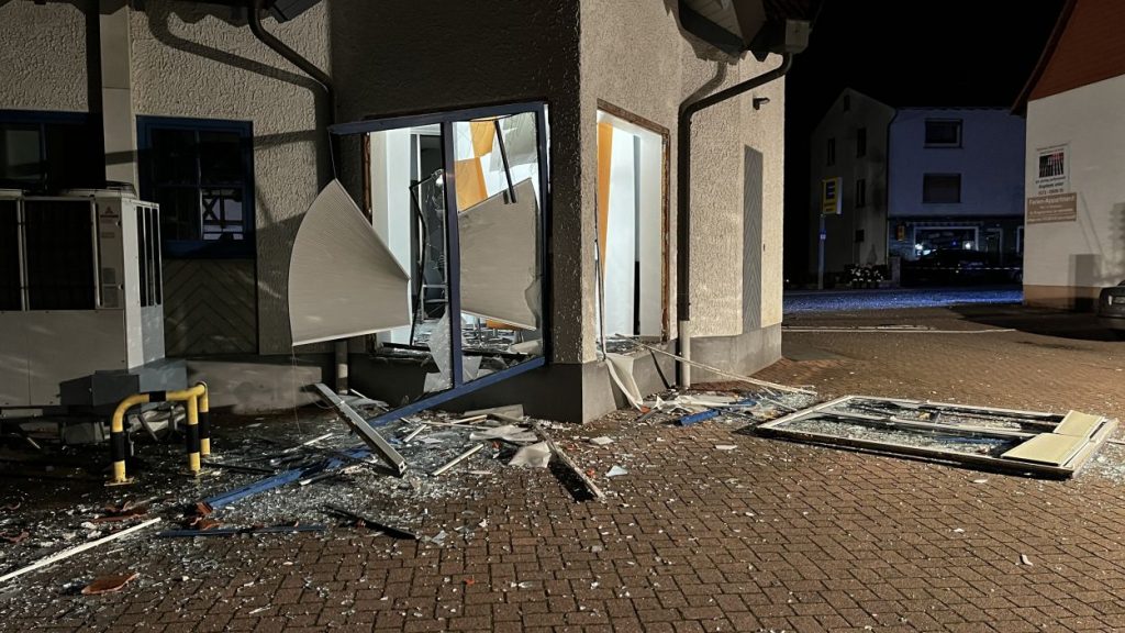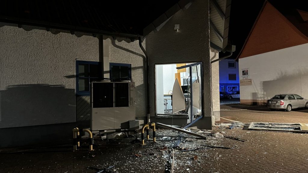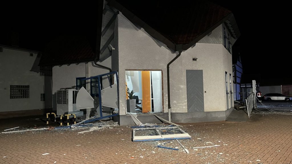 Knüllwald – Großer Schreck am frühen Morgen in Knüllwald-Remsfeld. In mitten der Ortslage sprengten unbekannte Täter am Freitagmorgen einen Geldautomaten der Volksbank. Dabei wurde das Bankgebäude im Inneren nahezu vollständig zerstört. Auch von einem Wintergarten ähnlichen Vorbau steht nur noch das Gerippe.
