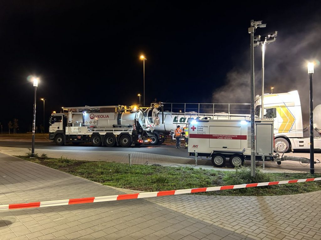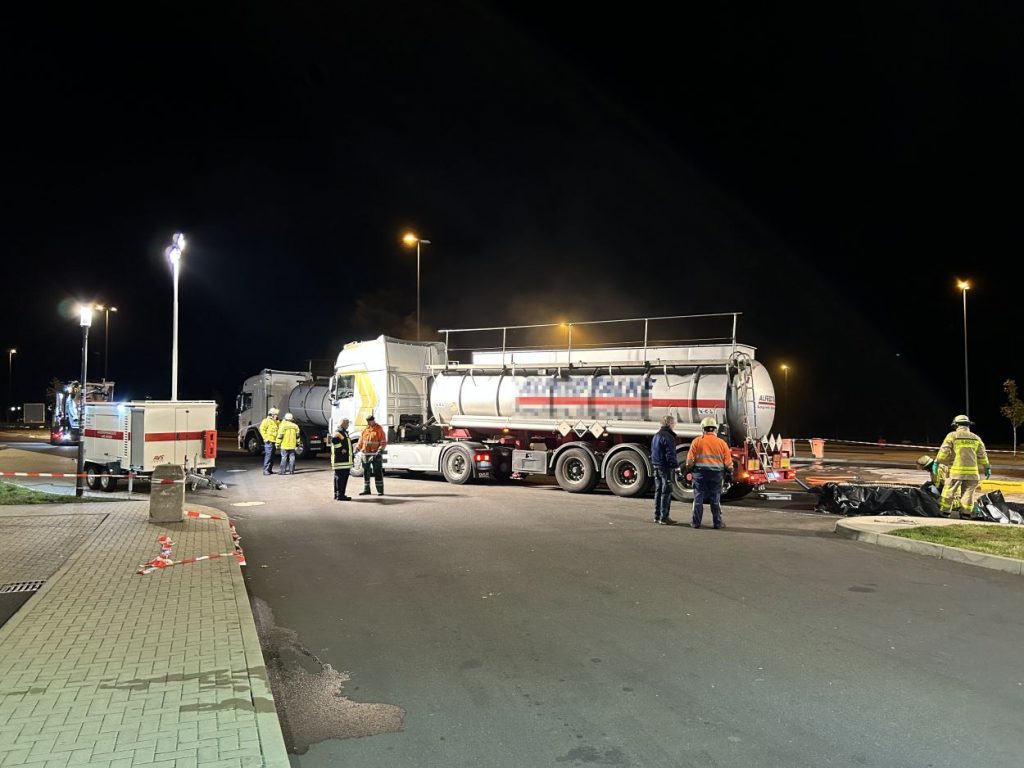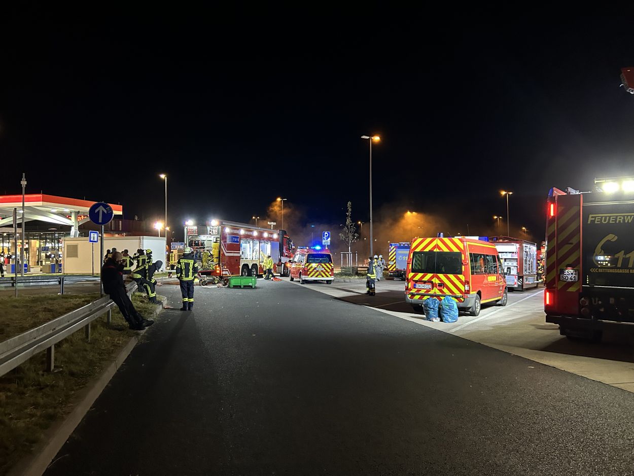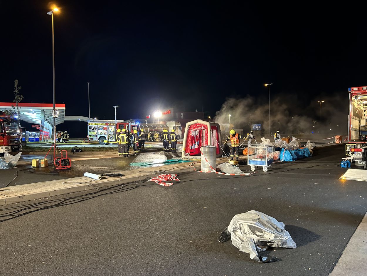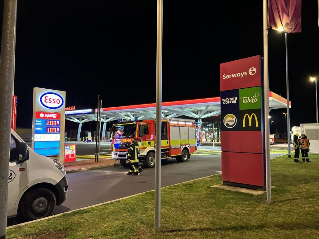 Herleshausen – Am Montag gegen 14:10 Uhr, wurde Feuerwehr und Polizei über einen Gefahrgutaustritt aus einem Lkw-Auflieger an der Tank- und Rastanlage Werratal-Süd an der A 4 in Richtung Osten informiert. Nach derzeitigem Ermittlungsstand befand sich ein Tanklastzug mit 25 Tonnen Salzsäure auf der Rastanlage, als ein Austritt der Ladung aus dem Auflieger durch den Fahrer festgestellt wurde. Dieser verständigte umgehend die Feuerwehr, welche mit einem Großaufgebot vor Ort kam. Die Feuerwehr konnte das Leck nicht abdichten und musste die Flüssigkeit auffangen und wieder zurück in den havarierten Tank pumpen, bis ein Ersatztankauflieger vor Ort war. Für das Umpumpen wurde die Werkfeuerwehr Infraserv aus Frankfurt Höchst angefordert. Rund 100 Einsatzkräfte aus Hessen und Thüringen waren bis in die Nacht im Einsatz. Glücklicherweise wurde durch den Vorfall niemand verletzt. Die Tank- und Rastanlage musste komplett gesperrt. Die Ursache für den Gefahrgutaustritt sowie die etwaige Schadenshöhe ist derzeit noch nicht bekannt. Eine Gefahr für die Bevölkerung bestand nicht.
