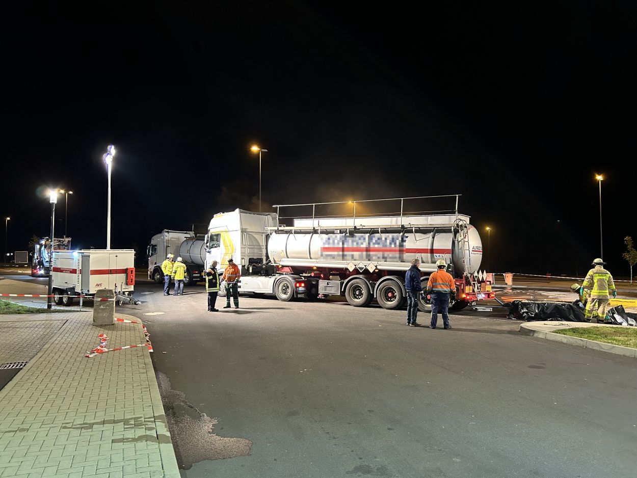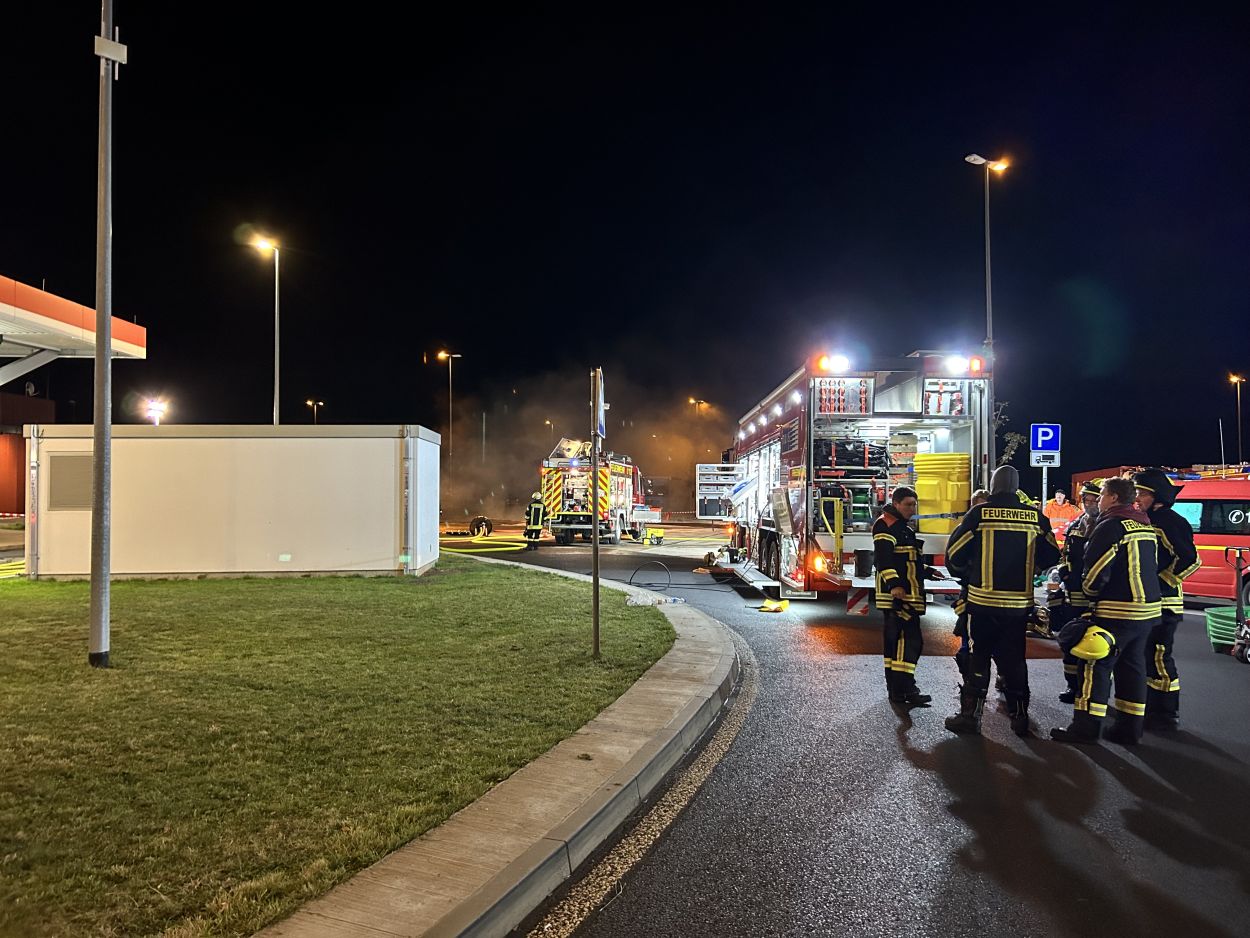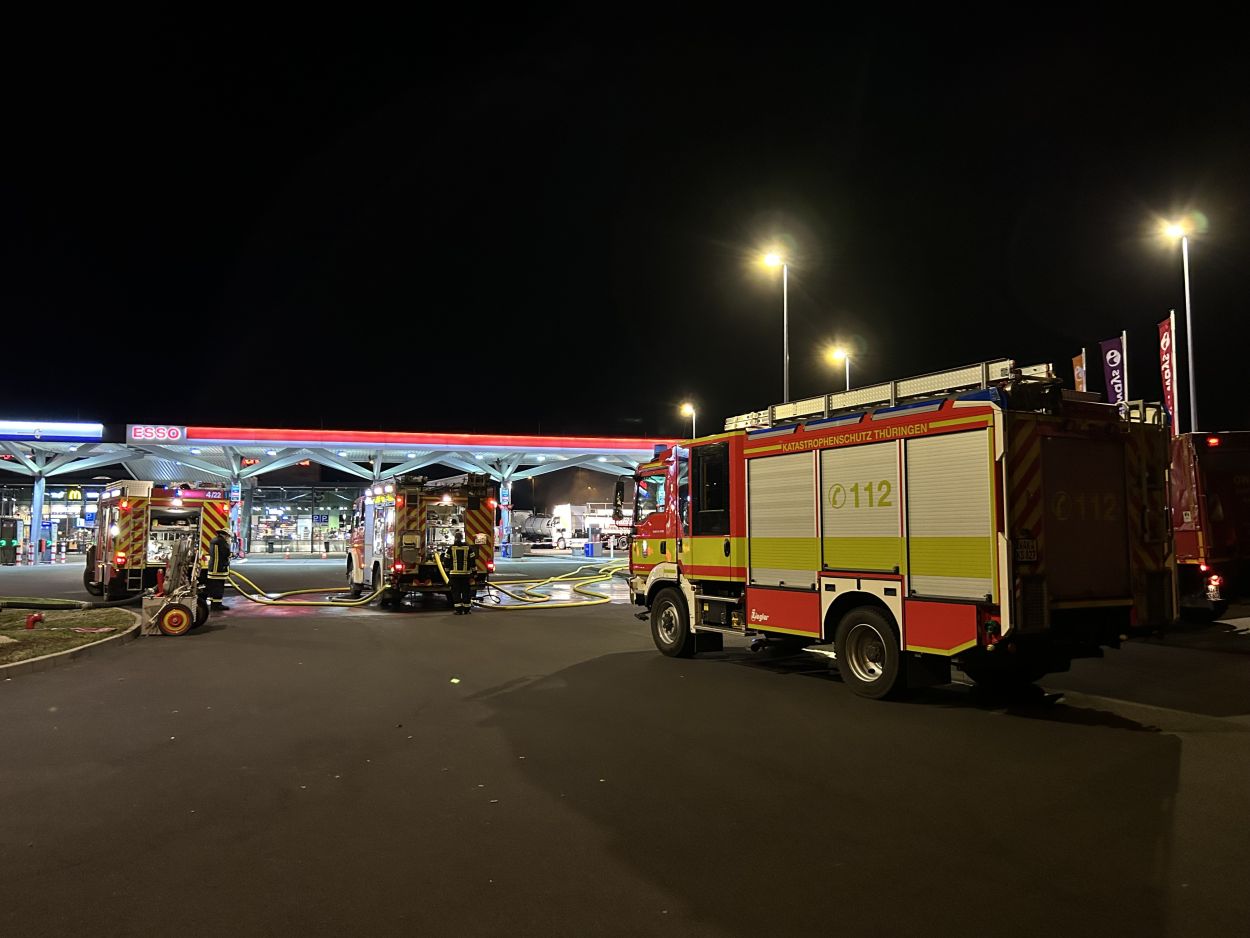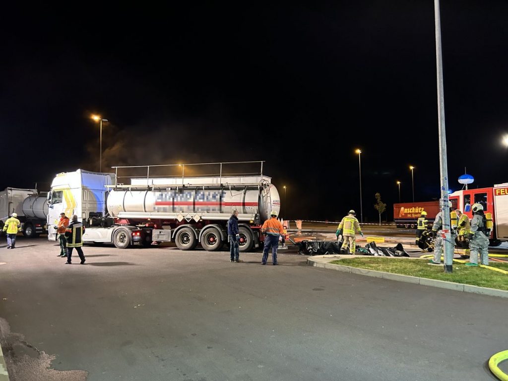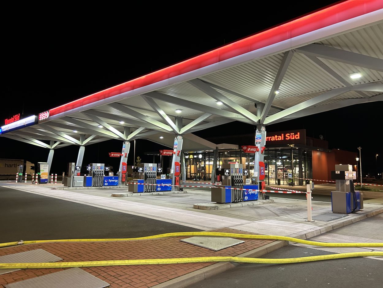 Herleshausen – Am Montag gegen 14:10 Uhr, wurde Feuerwehr und Polizei über einen Gefahrgutaustritt aus einem Lkw-Auflieger an der Tank- und Rastanlage Werratal-Süd an der A 4 in Richtung Osten informiert. Nach derzeitigem Ermittlungsstand befand sich ein Tanklastzug mit 25 Tonnen Salzsäure auf der Rastanlage, als ein Austritt der Ladung aus dem Auflieger durch den Fahrer festgestellt wurde. Dieser verständigte umgehend die Feuerwehr, welche mit einem Großaufgebot vor Ort kam. Die Feuerwehr konnte das Leck nicht abdichten und musste die Flüssigkeit auffangen und wieder zurück in den havarierten Tank pumpen, bis ein Ersatztankauflieger vor Ort war. Für das Umpumpen wurde die Werkfeuerwehr Infraserv aus Frankfurt Höchst angefordert. Rund 100 Einsatzkräfte aus Hessen und Thüringen waren bis in die Nacht im Einsatz. Glücklicherweise wurde durch den Vorfall niemand verletzt. Die Tank- und Rastanlage musste komplett gesperrt. Die Ursache für den Gefahrgutaustritt sowie die etwaige Schadenshöhe ist derzeit noch nicht bekannt. Eine Gefahr für die Bevölkerung bestand nicht.