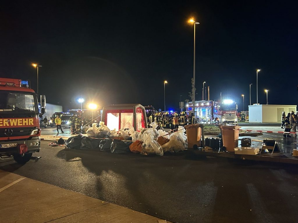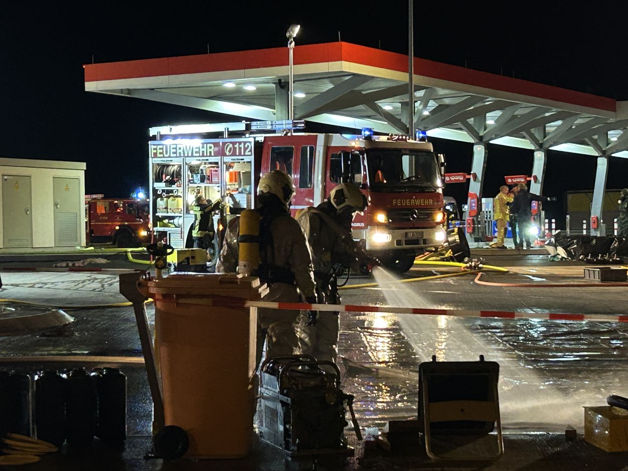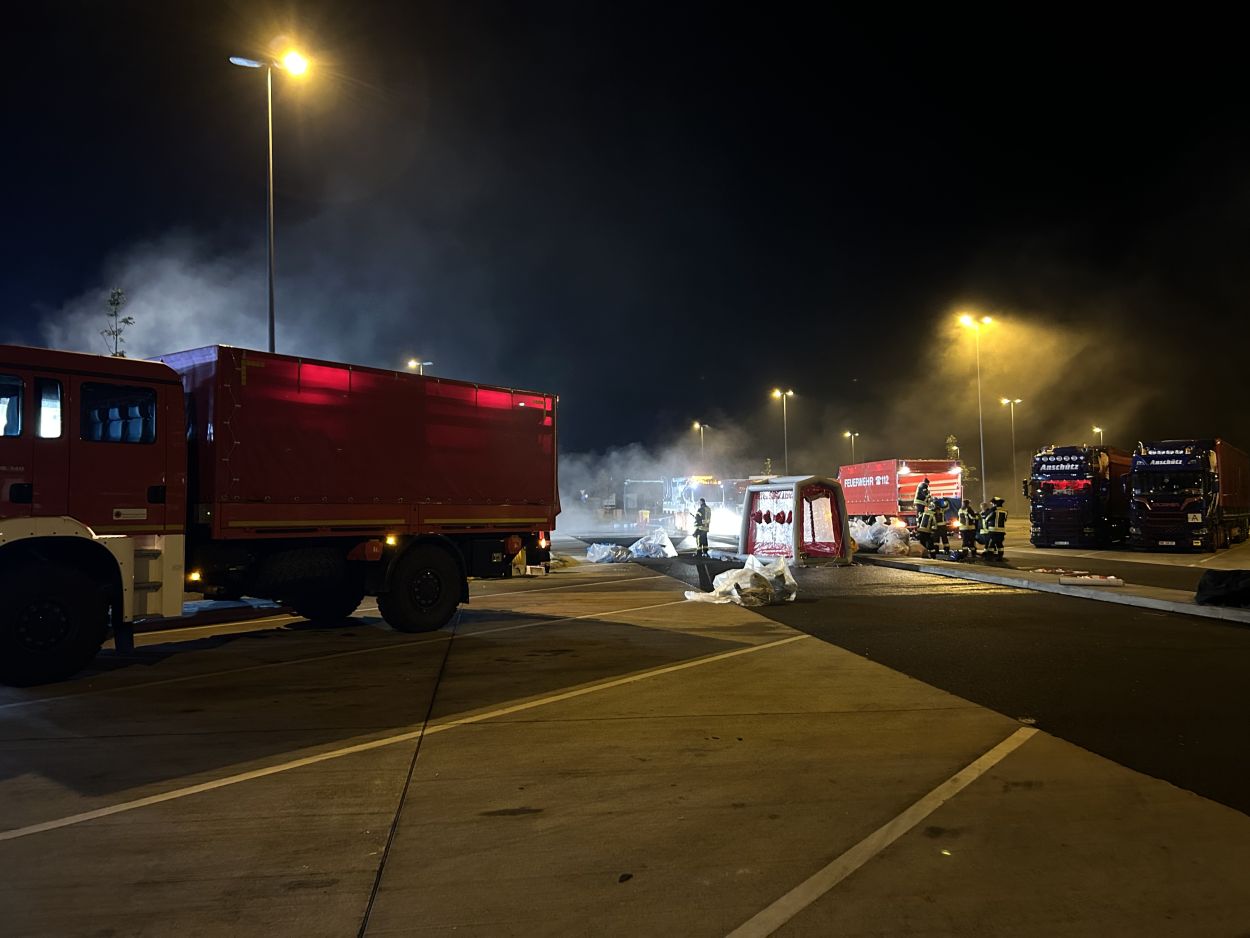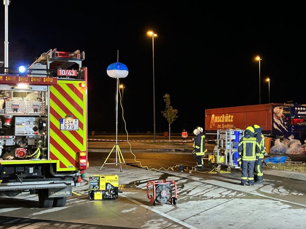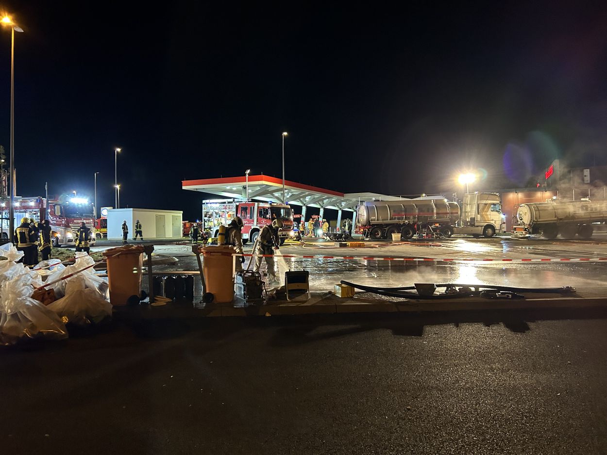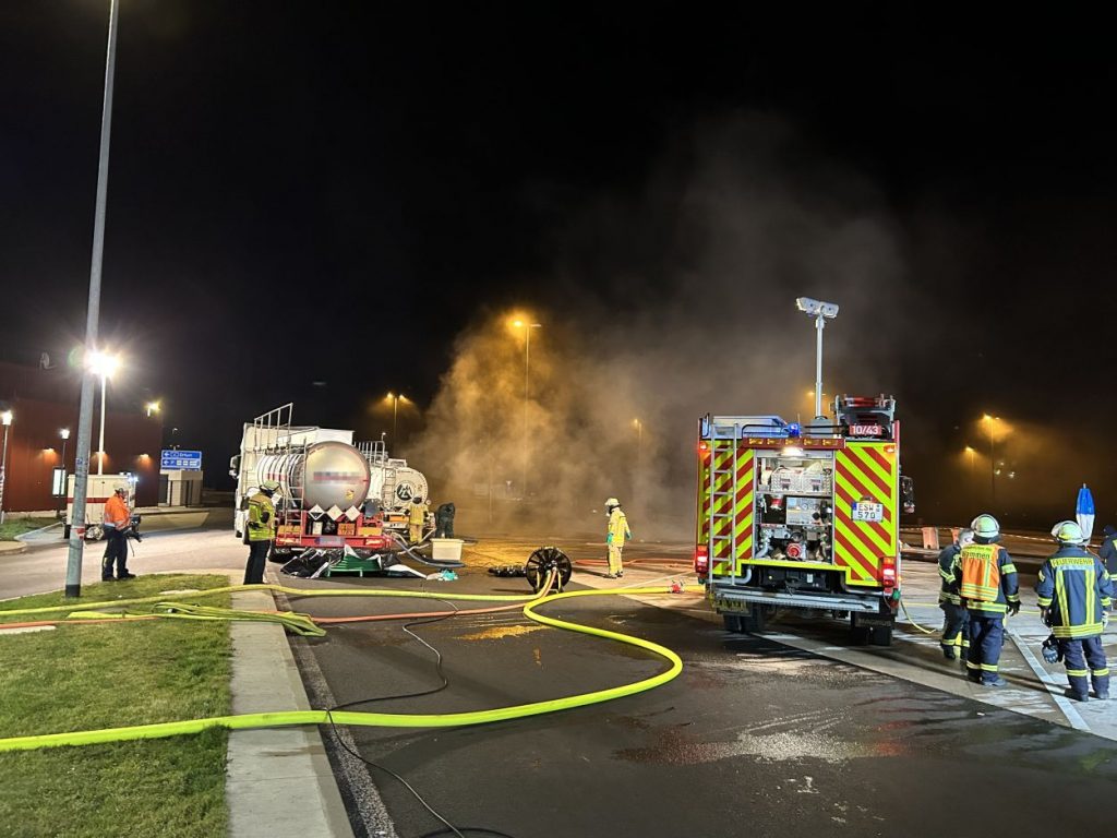 Herleshausen – Am Montag gegen 14:10 Uhr, wurde Feuerwehr und Polizei über einen Gefahrgutaustritt aus einem Lkw-Auflieger an der Tank- und Rastanlage Werratal-Süd an der A 4 in Richtung Osten informiert. Nach derzeitigem Ermittlungsstand befand sich ein Tanklastzug mit 25 Tonnen Salzsäure auf der Rastanlage, als ein Austritt der Ladung aus dem Auflieger durch den Fahrer festgestellt wurde. Dieser verständigte umgehend die Feuerwehr, welche mit einem Großaufgebot vor Ort kam. Die Feuerwehr konnte das Leck nicht abdichten und musste die Flüssigkeit auffangen und wieder zurück in den havarierten Tank pumpen, bis ein Ersatztankauflieger vor Ort war. Für das Umpumpen wurde die Werkfeuerwehr Infraserv aus Frankfurt Höchst angefordert. Rund 100 Einsatzkräfte aus Hessen und Thüringen waren bis in die Nacht im Einsatz. Glücklicherweise wurde durch den Vorfall niemand verletzt. Die Tank- und Rastanlage musste komplett gesperrt. Die Ursache für den Gefahrgutaustritt sowie die etwaige Schadenshöhe ist derzeit noch nicht bekannt. Eine Gefahr für die Bevölkerung bestand nicht.