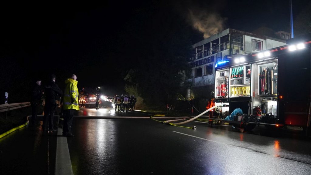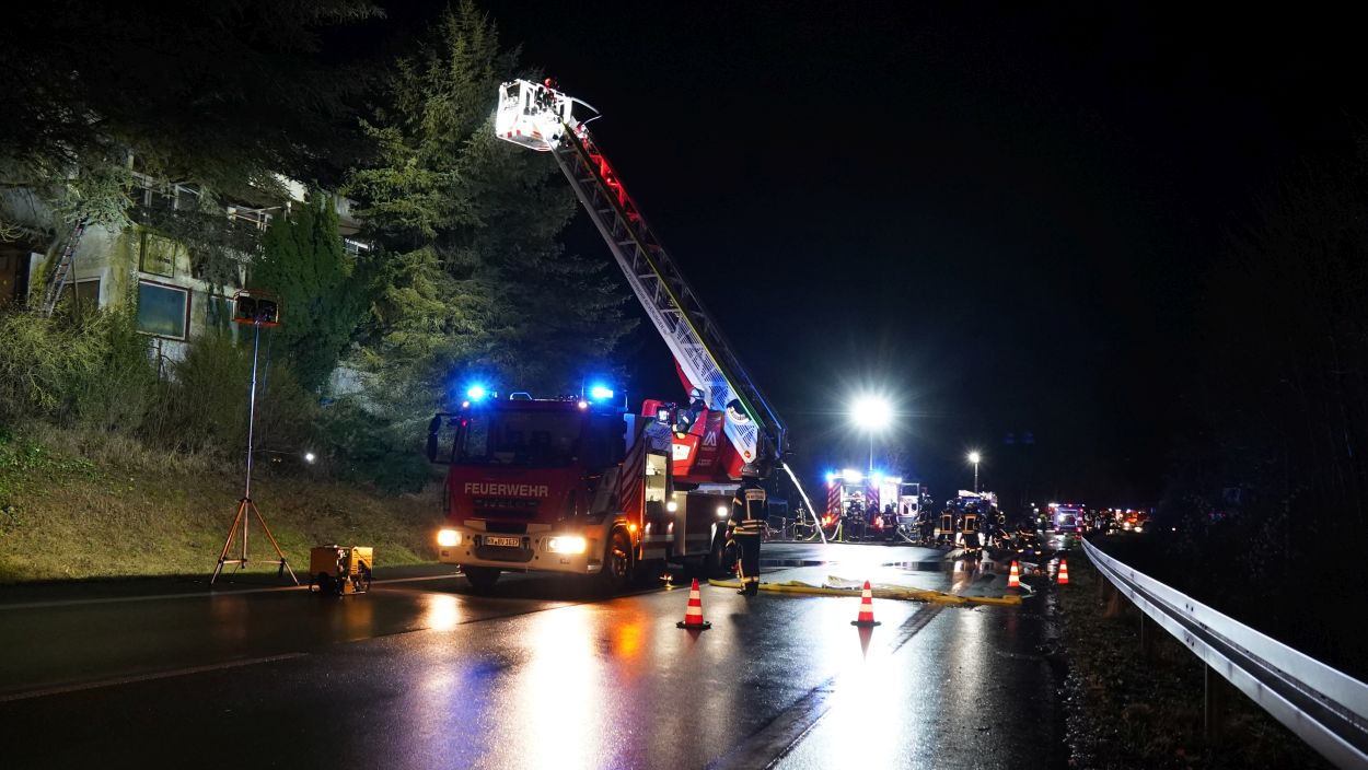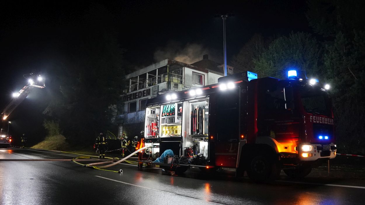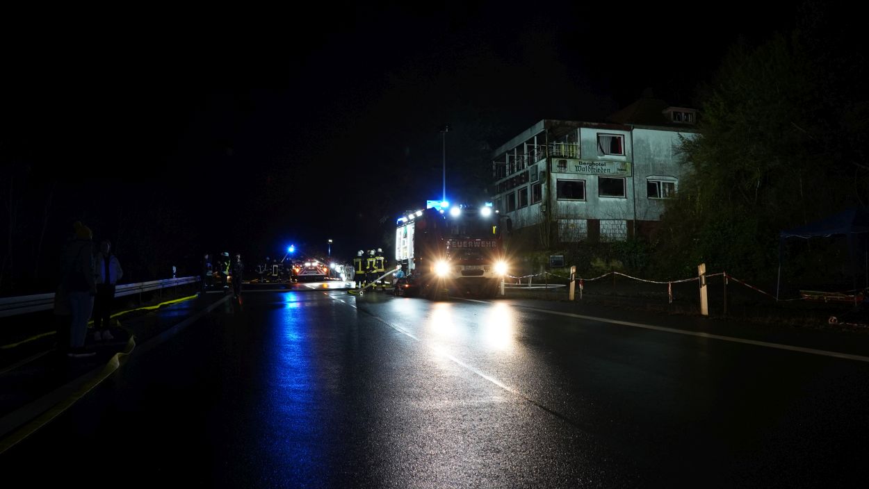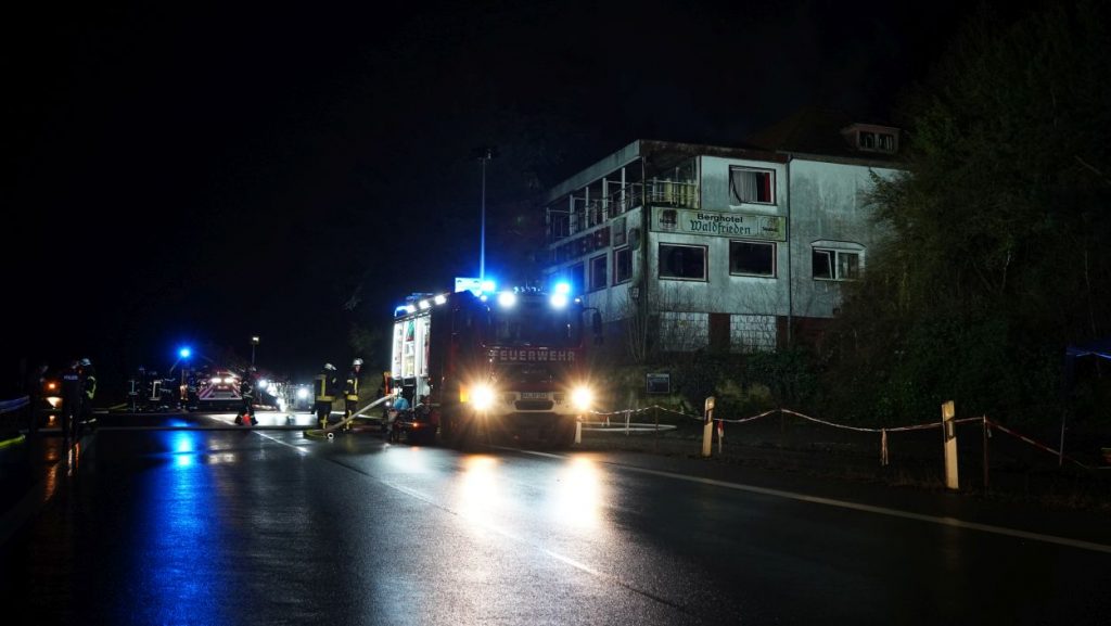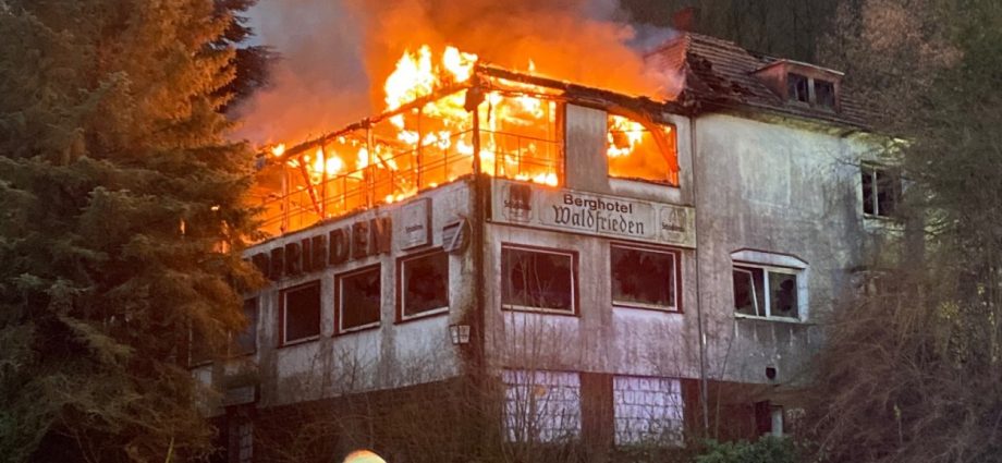 Beverungen – Am Mittwoch gegen 17 Uhr brannte das leerstehende Hotel Waldfrieden an der B83 zwischen Beverungen und Bad Karlshafen. Bei der Ankunft der Einsatzkräfte schlugen bereits die Flammen aus der Hotelruine. Sofort wurde eine umfassende Brandbekämpfung an Vorder- und Rückseite des Gebäudes eingeleitet. Zur Sicherstellung der Wasserversorgung wurde eine Verbindung zur Weser hergestellt. Insgesamt waren 95 Einsatzkräfte vor Ort mehrere Stunden im Einsatz.