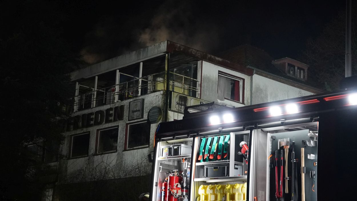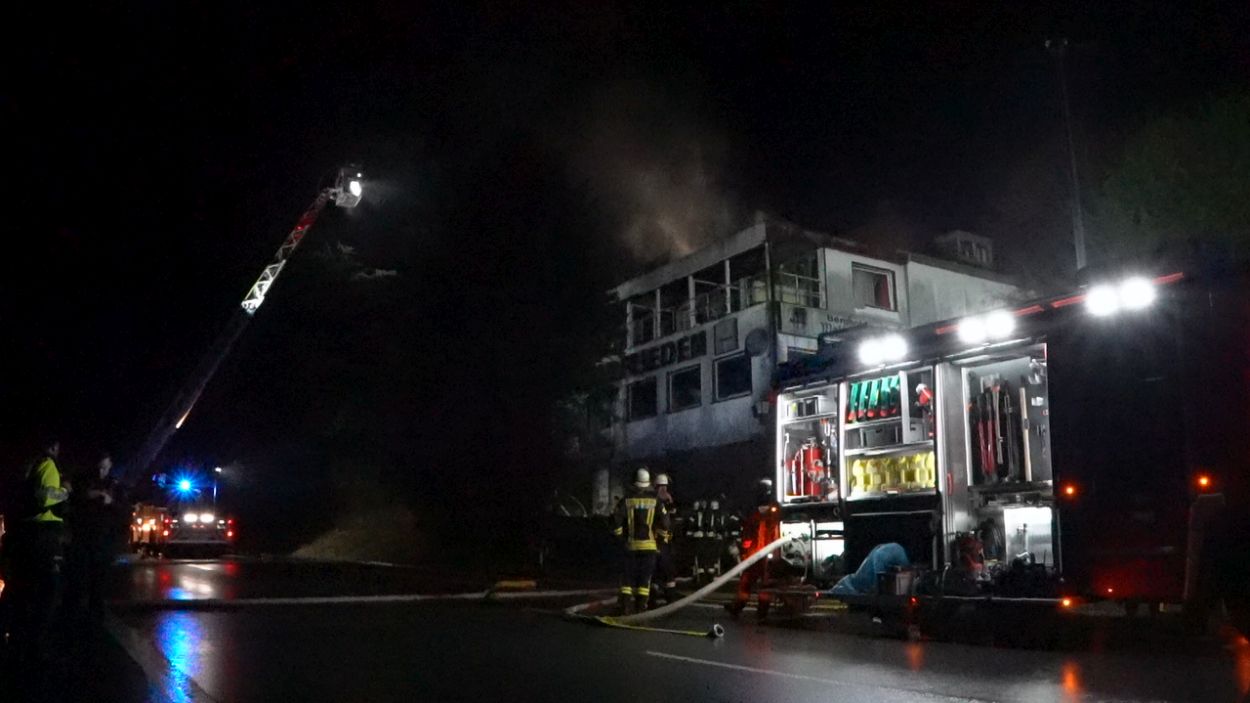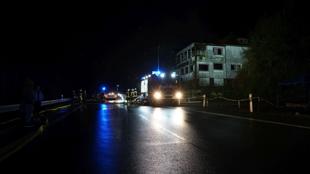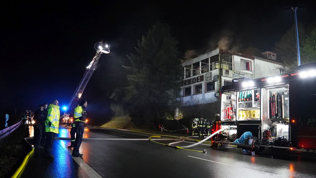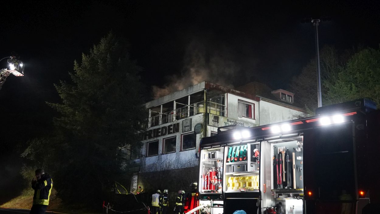 Beverungen – Am Mittwoch gegen 17 Uhr brannte das leerstehende Hotel Waldfrieden an der B83 zwischen Beverungen und Bad Karlshafen. Bei der Ankunft der Einsatzkräfte schlugen bereits die Flammen aus der Hotelruine. Sofort wurde eine umfassende Brandbekämpfung an Vorder- und Rückseite des Gebäudes eingeleitet. Zur Sicherstellung der Wasserversorgung wurde eine Verbindung zur Weser hergestellt. Insgesamt waren 95 Einsatzkräfte vor Ort mehrere Stunden im Einsatz.