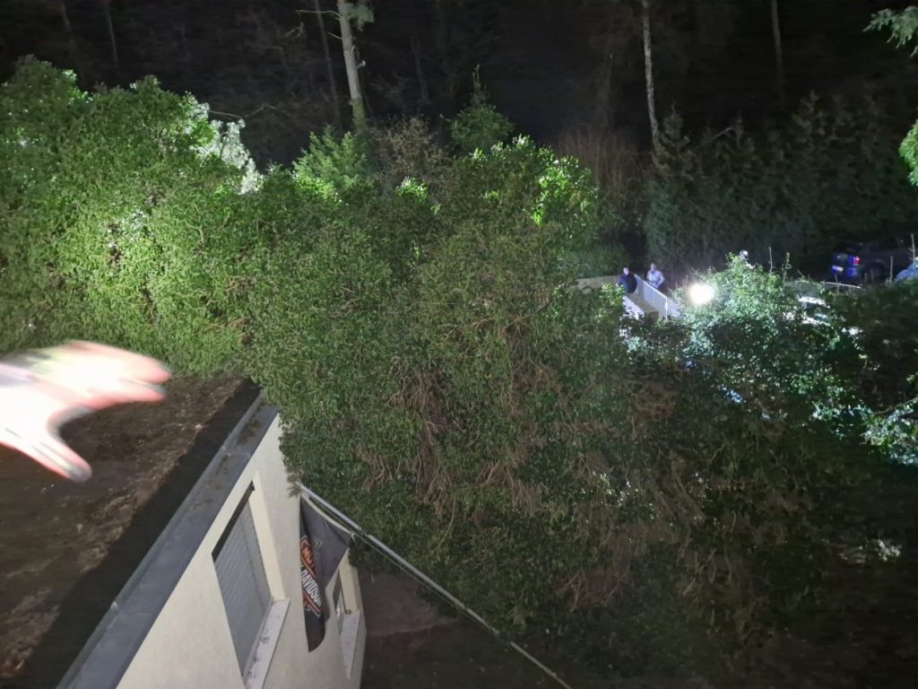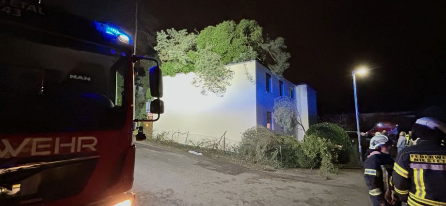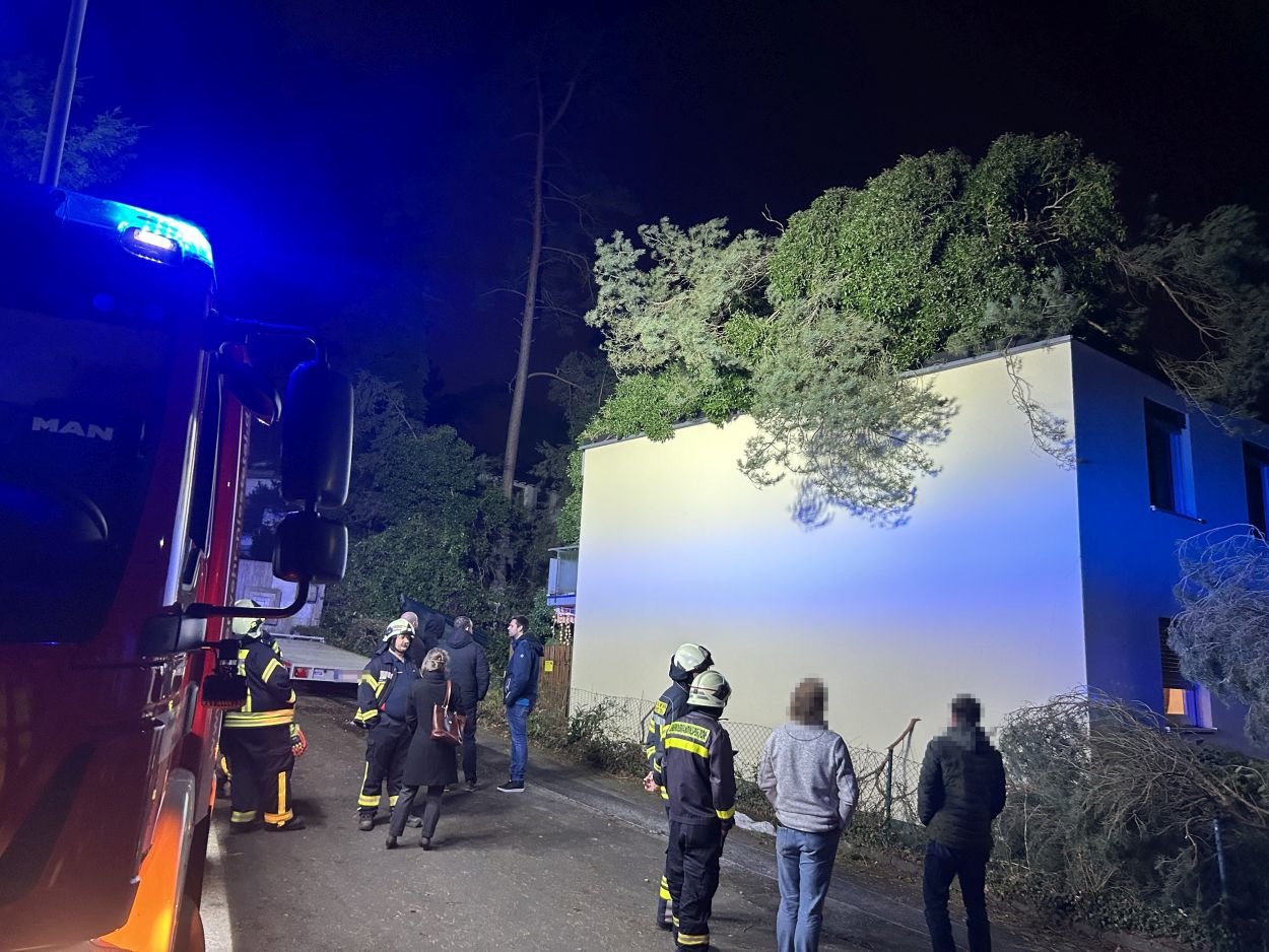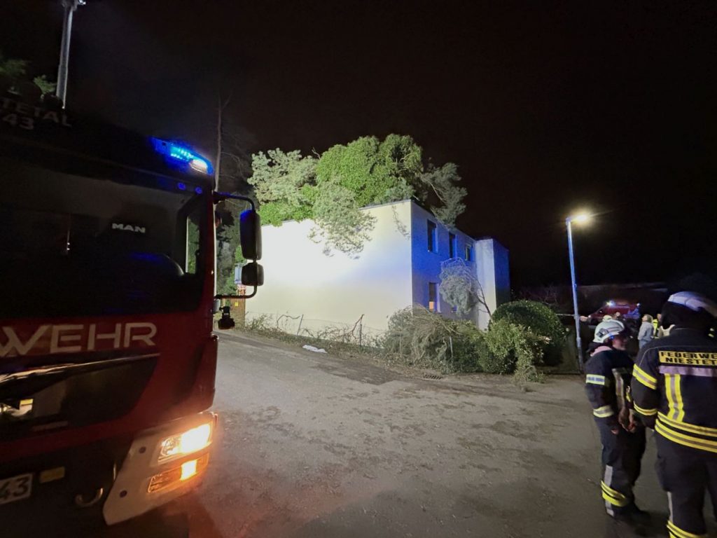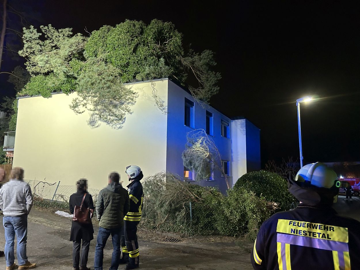 Niestetal – Am Mittwochabend kurz nach 18:00 Uhr wurde die Feuerwehr Niestetal in die Straße „Am Liethberg“ alarmiert, dort soll aufgrund des Sturmtiefs Jitka ein 25 Meter hoher Baum auf ein Wohnhaus gestürzt sein. Als die ersten Einsatzkräfte am Einsatzort eintrafen, bestätigte sich die Meldung. Der Baum lag über die komplette Gebäudebreite auf dem Dach. Auf der gegenüberliegenden Seite des Hauses brach die Baumspitze und kam im Straßenbereich zum Liegen. Die Berufsfeuerwehr Kassel wurde nachgefordert, um die Gefahrenabwehr zu besprechen und ob die Feuerwehr mit einem Kranwagen tätig werden muss, um das Haus von der Last des Baumes zu entlasten. Nach ausgiebiger Erkundung der Feuerwehr wurde beschlossen, dass es eine sehr statische Lage ist und der Baum auch bei weiterem Wind nicht weiter rutschen kann. In Absprache mit der Berufsfeuerwehr Kassel wurde entschieden, den Einsatz abzubrechen. Die Eigentümer des Hauses wurden informiert, dass sie eine private Firma beauftragen müssen, um den Baum zu beseitigen. Die Feuerwehr konnte die Einsatzstelle ohne weitere Tätigkeit verlassen. Der Einsatz war nach rund 90 Minuten beendet. Im Anschluss wurde die Einsatzstelle an die jeweiligen Eigentümer übergeben. Im Einsatz war die Freiwillige Feuerwehr Niestetal mit 15 Einsatzkräften, die Berufsfeuerwehr aus Kassel und die Polizei.