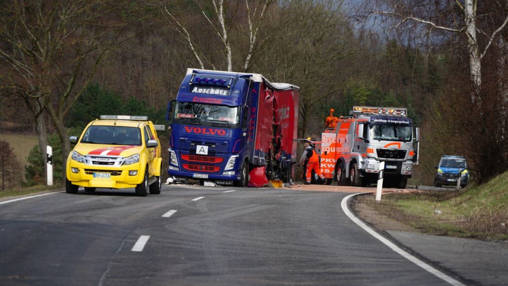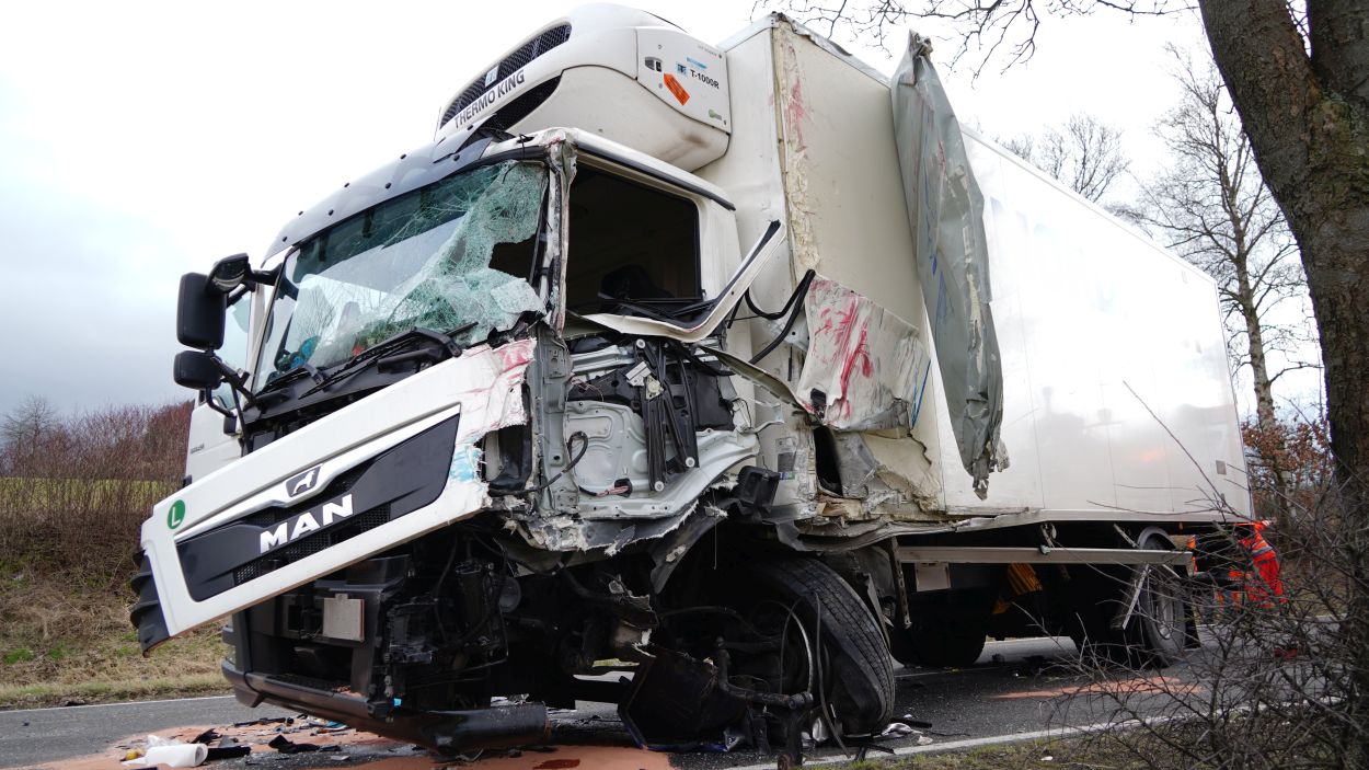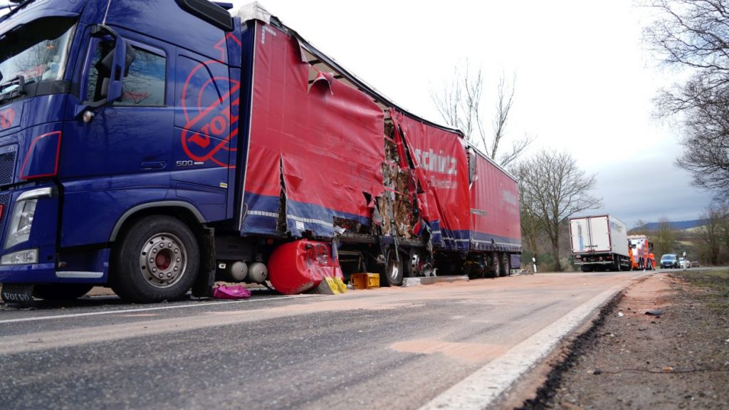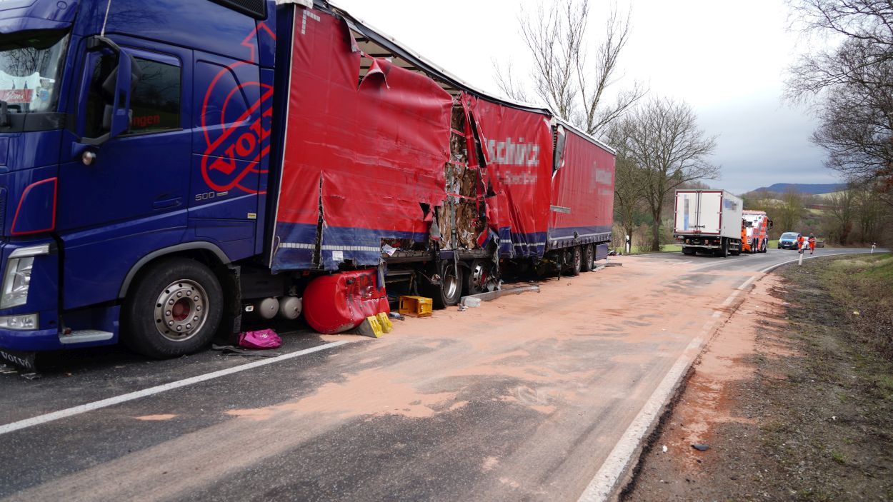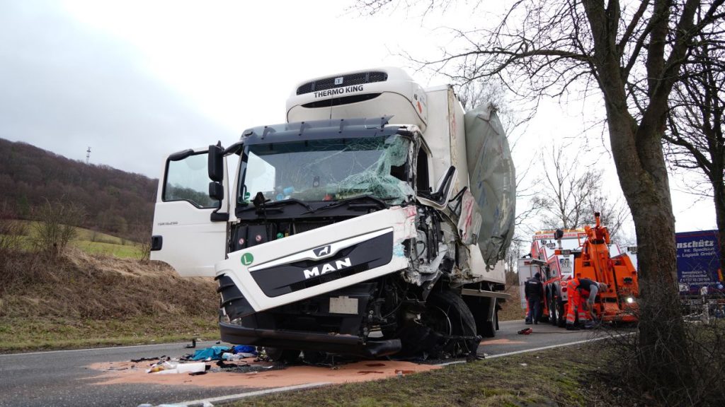 Sontra – Auf der B400 zwischen Sontra-Ulfen und Blinde Mühle kam es am Mittwochmorgen zu einem schweren LKW-Unfall. Nach bisherigen Informationen befuhr ein 47-jähriger LKW-Fahrer gegen 7 Uhr die Bundesstraße von Herleshausen nach Eschwege. Aus bislang noch unbekannten Gründen fuhr er kurz vor Ulfen nach links in den Gegenverkehr und streifte zwei entgegen kommende LKW sowie ein PKW. Der 47-jährige LKW-Fahrer wurde schwer verletzt und musste in ein Krankenhaus eingeliefert werden. Die anderen Unfallbeteiligten blieben wie durch ein Wunder nahezu unverletzt. Die Bergungsarbeiten werden voraussichtlich noch bis in den späten Nachmittag andauern.