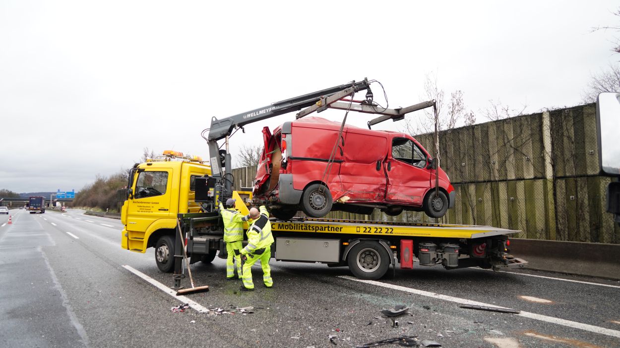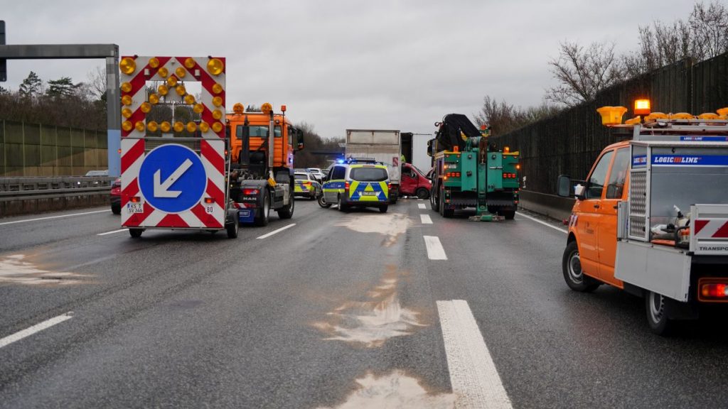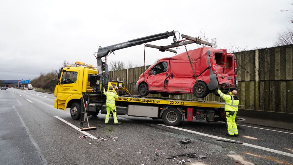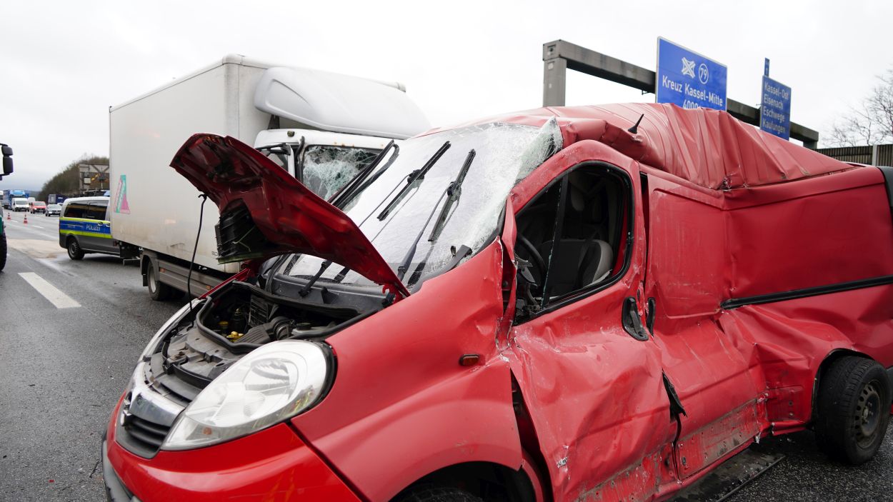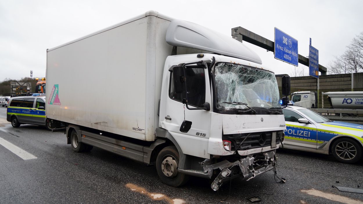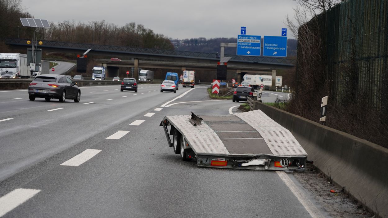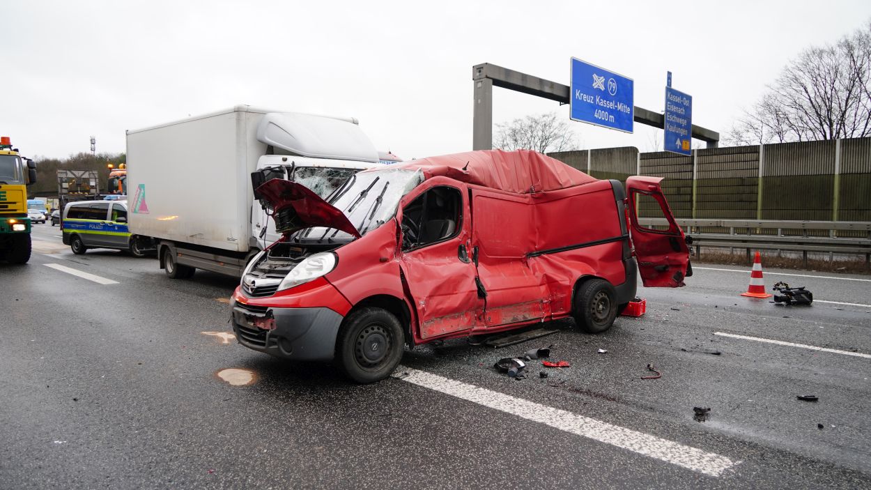 Kassel – Auf der A7 zwischen Kassel-Ost und Kassel-Nord kam es am Donnerstagmorgen zu einem schweren Verkehrsunfall. Wegen eines Rückstaus hatte gegen 08.45 Uhr ein 49-jähriger seinen Sattelzug auf dem rechten Fahrstreifen anhalten müssen. Ein nachfolgender 23-Jähriger erkannte dies rechtzeitig und stoppte seinen Transporter mit Anhänger. Dies erkannte jedoch der von hinten kommende 35-jährige Lkw-Fahrer zu spät und war offenbar ungebremst auf den stehenden Anhänger aufgefahren. Durch die Wucht des Aufpralls wurde der PKW-Anhänger abgerissen und auf die beiden linken Fahrstreifen geschleudert, während der Transporter sich drehte und zwischen den beiden Lkw zum Stehen kam. Ein vierter Beteiligter, ein weiterer 35-jähriger Lkw-Fahrer, der auf dem Verzögerungsstreifen der Anschlussstelle unterwegs war, kollidierte anschließend noch mit der Front des stehenden Kastenwagens, blieb aber wie der 49-jährige Fahrer unverletzt. Der Fahrer des Transporters sowie der auffahrende LKW-Fahrer wurde verletzt und in ein Krankenhaus transportiert. Lebensgefahr besteht für die beiden Männer nicht. Nach den Rettungsarbeiten konnte der Verkehr an der Unfallstelle vorbeigeleitet werden. Im Einsatz war auch die Berufsfeuerwehr mit Kran und der Rettungshubschrauber Christoph 7. Gegen 11.30 Uhr war die Unfallstelle geräumt.
