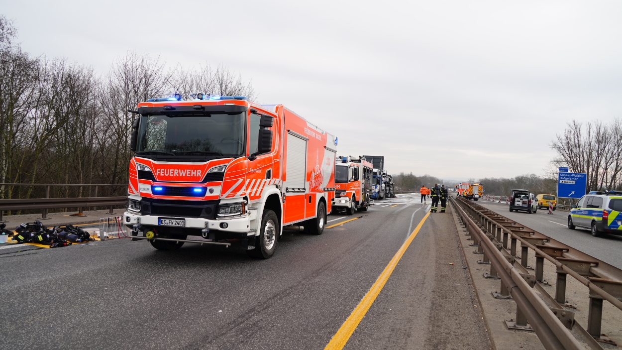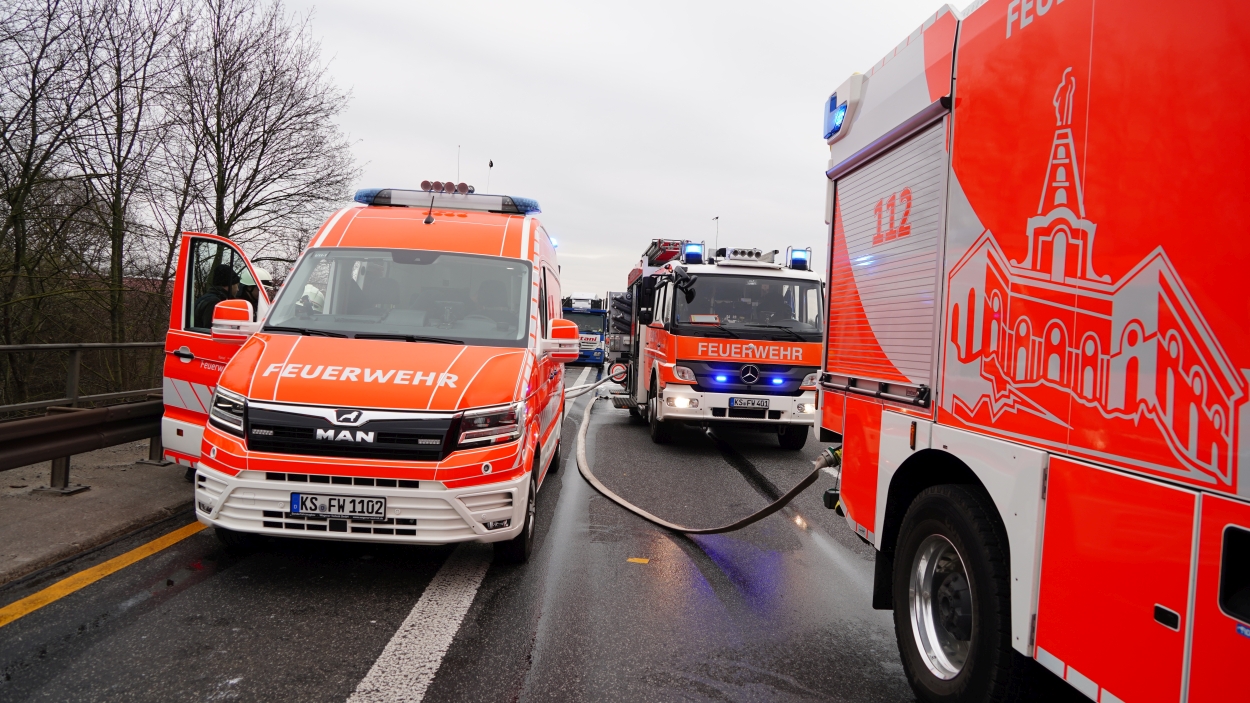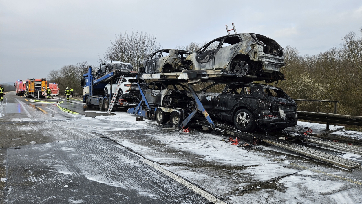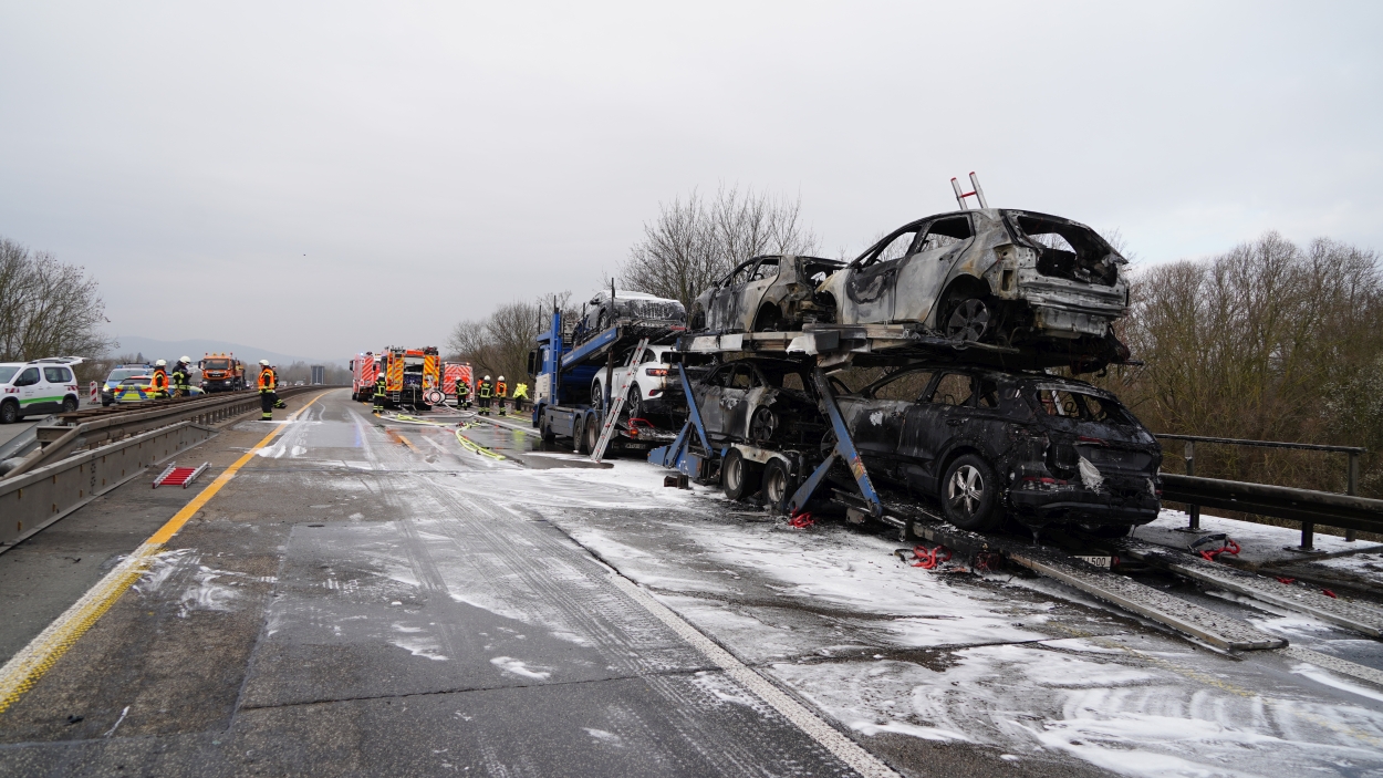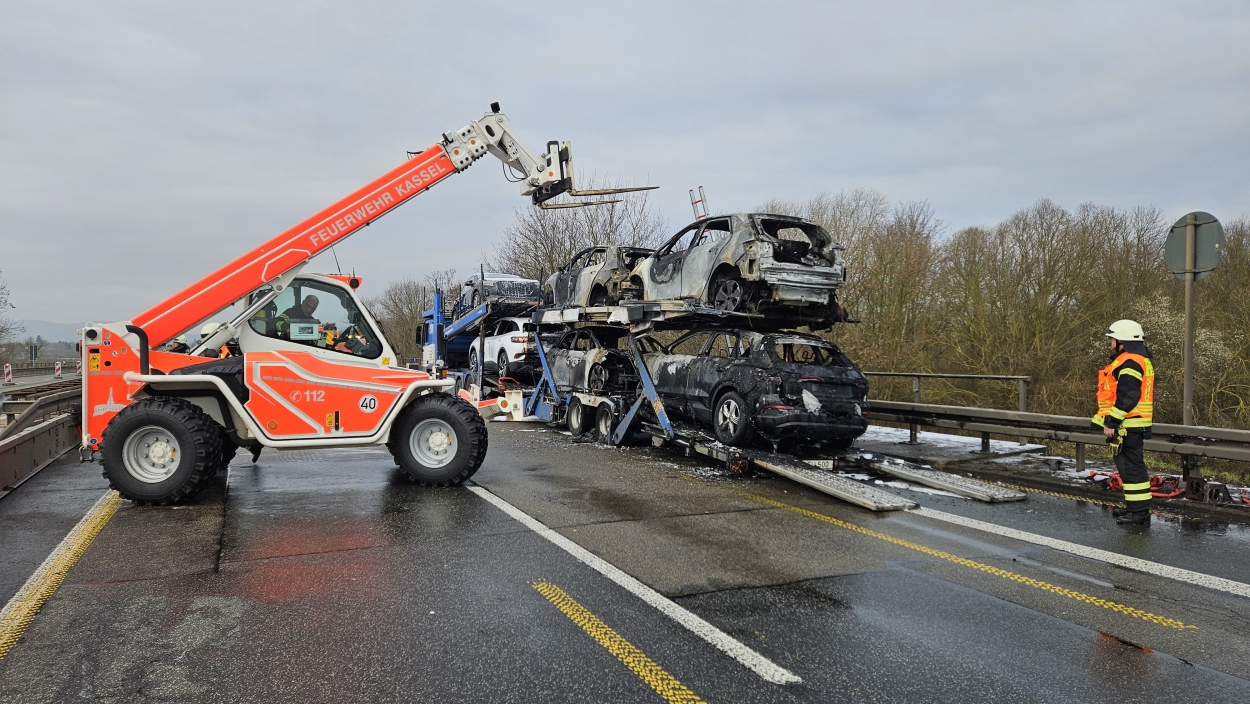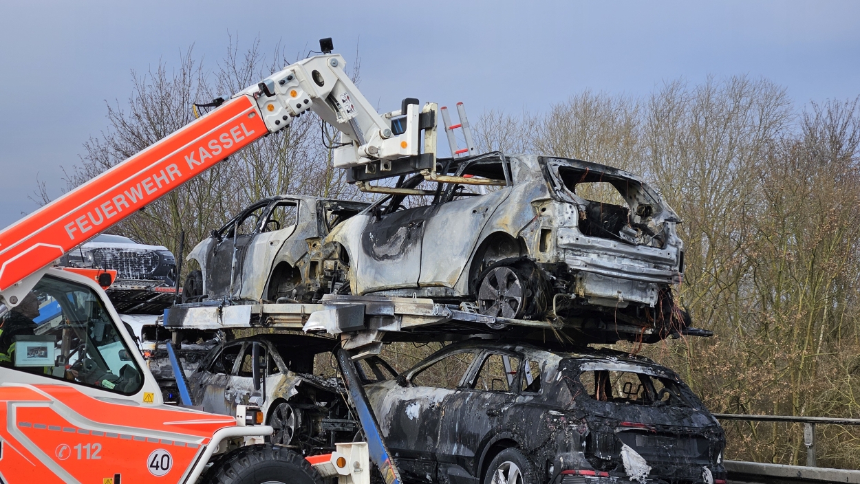 Kassel – Auf der A49 bei Kassel kam es am Freitagmorgen zu einem LKW-Brand. Ein Autotransporter beladen mit sechs Elektrofahrzeugen war gegen 08.30 Uhr auf der A49 von Lohfelden kommend in Fahrtrichtung Schwalmstadt unterwegs. In Höhe der Kasseler Messehallen bemerkte der Fahrer im Rückspiegel Flammen am Reifen des Auflieger und steuerte sein LKW direkt auf den Standstreifen. Der Fahrer versuchte noch, das Feuer zu löschen, was ihm allerdings nicht mehr gelangte. Innerhalb weniger Minuten standen vier Elektrofahrzeuge im Vollbrand. Zwei weitere wurden stark beschädigt. Die alarmierte Berufsfeuerwehr Kassel konnte das Feuer schnell unter Kontrolle bringen. Mithilfe eines Teleskoplader von der Feuerwehr wurden die Elektrofahrzeuge vom Autotransporter kontrolliert entladen und nach weiteren Glutnestern abgesucht. Die Autobahn musste für die Lösch- und Bergungsarbeiten mehrere Stunden voll gesperrt werden was zu einem Verkehrschaos in Kassel führte. Der Sachschaden wird von der Polizei auf 300.000 Euro geschätzt. Verletzt wurde niemand.