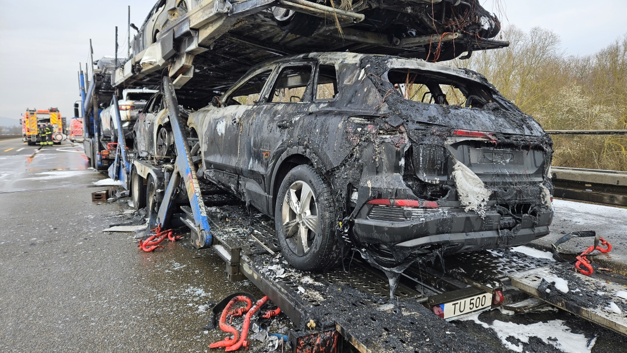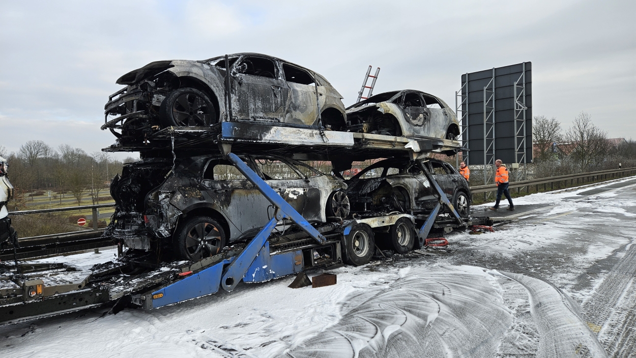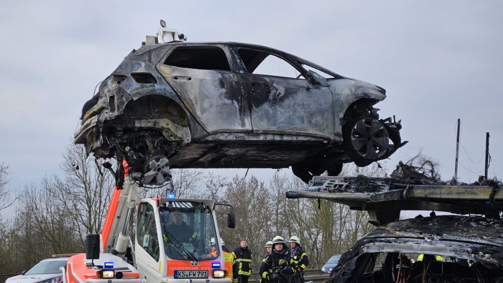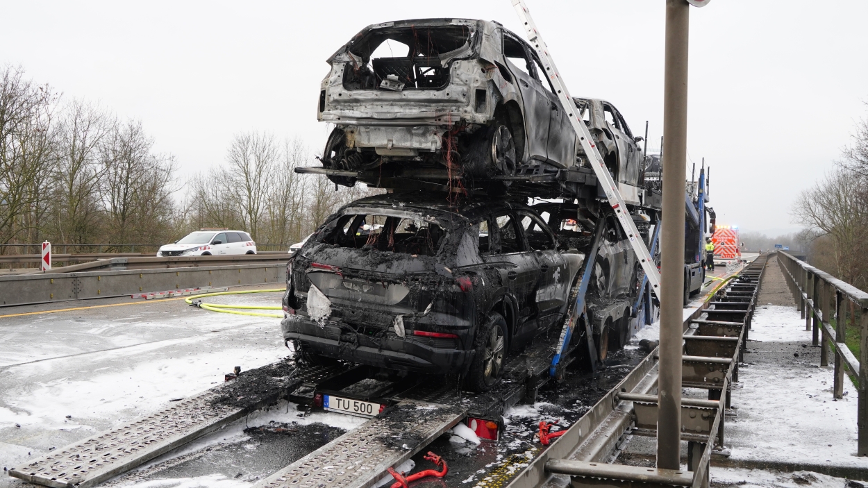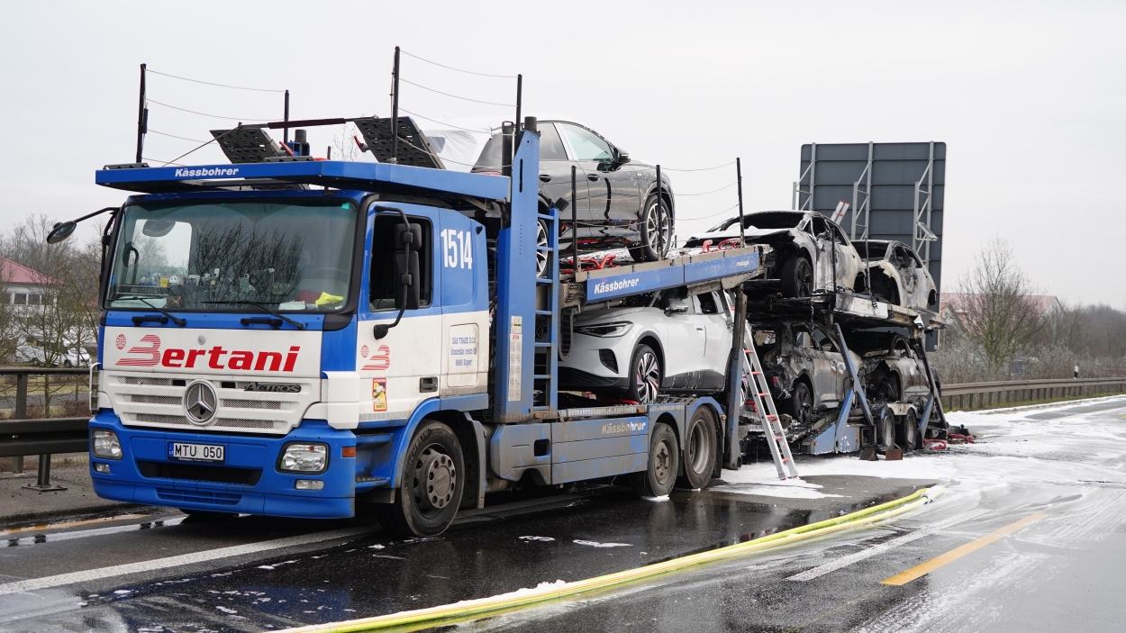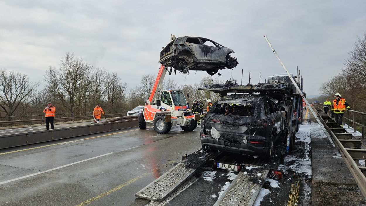Kassel – Auf der A49 bei Kassel kam es am Freitagmorgen zu einem LKW-Brand. Ein Autotransporter beladen mit sechs Elektrofahrzeugen war gegen 08.30 Uhr auf der A49 von Lohfelden kommend in Fahrtrichtung Schwalmstadt unterwegs. In Höhe der Kasseler Messehallen bemerkte der Fahrer im Rückspiegel Flammen am Reifen des Auflieger und steuerte sein LKW direkt auf den Standstreifen. Der Fahrer versuchte noch, das Feuer zu löschen, was ihm allerdings nicht mehr gelangte. Innerhalb weniger Minuten standen vier Elektrofahrzeuge im Vollbrand. Zwei weitere wurden stark beschädigt. Die alarmierte Berufsfeuerwehr Kassel konnte das Feuer schnell unter Kontrolle bringen. Mithilfe eines Teleskoplader von der Feuerwehr wurden die Elektrofahrzeuge vom Autotransporter kontrolliert entladen und nach weiteren Glutnestern abgesucht. Die Autobahn musste für die Lösch- und Bergungsarbeiten mehrere Stunden voll gesperrt werden was zu einem Verkehrschaos in Kassel führte. Der Sachschaden wird von der Polizei auf 300.000 Euro geschätzt. Verletzt wurde niemand.