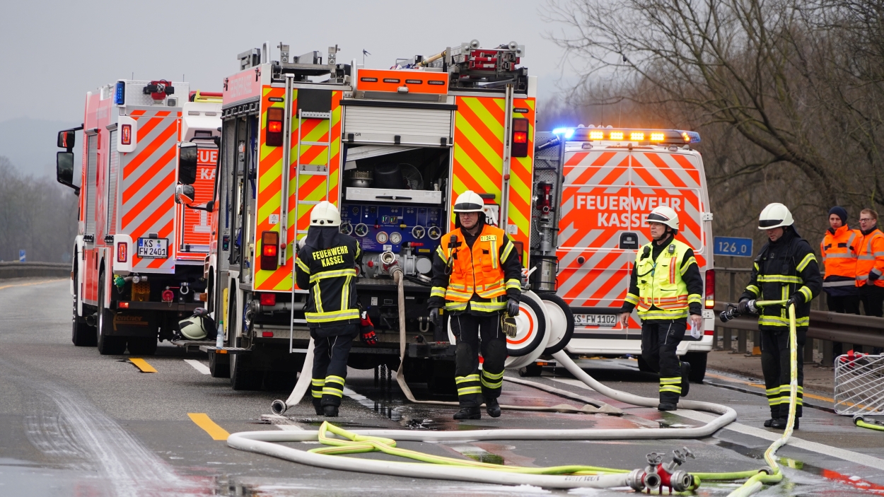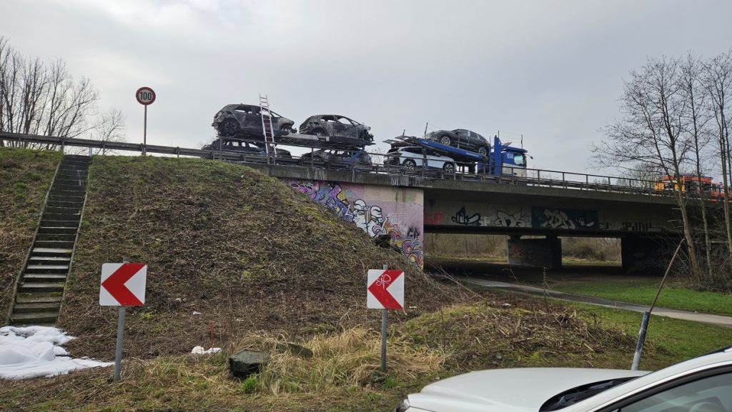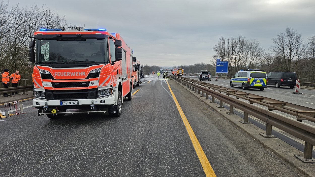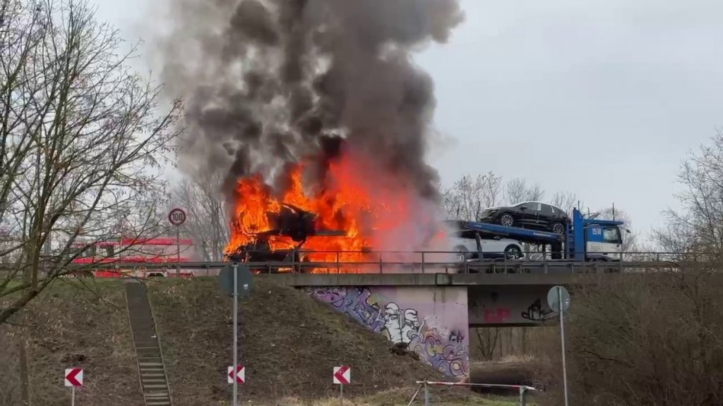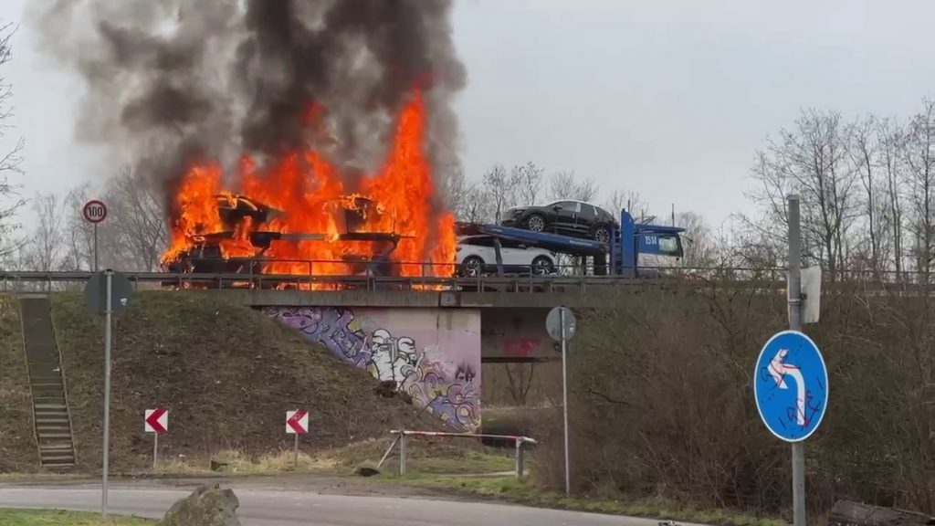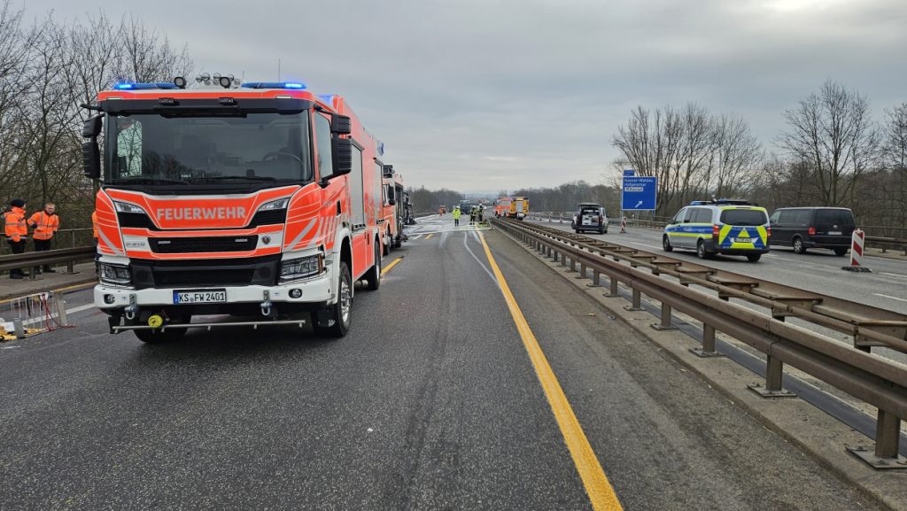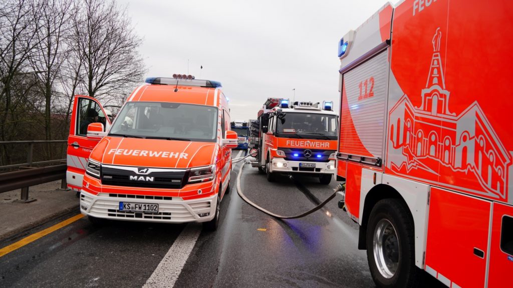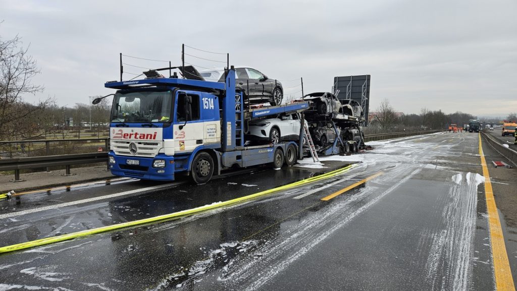 Kassel – Auf der A49 bei Kassel kam es am Freitagmorgen zu einem LKW-Brand. Ein Autotransporter beladen mit sechs Elektrofahrzeugen war gegen 08.30 Uhr auf der A49 von Lohfelden kommend in Fahrtrichtung Schwalmstadt unterwegs. In Höhe der Kasseler Messehallen bemerkte der Fahrer im Rückspiegel Flammen am Reifen des Auflieger und steuerte sein LKW direkt auf den Standstreifen. Der Fahrer versuchte noch, das Feuer zu löschen, was ihm allerdings nicht mehr gelangte. Innerhalb weniger Minuten standen vier Elektrofahrzeuge im Vollbrand. Zwei weitere wurden stark beschädigt. Die alarmierte Berufsfeuerwehr Kassel konnte das Feuer schnell unter Kontrolle bringen. Mithilfe eines Teleskoplader von der Feuerwehr wurden die Elektrofahrzeuge vom Autotransporter kontrolliert entladen und nach weiteren Glutnestern abgesucht. Die Autobahn musste für die Lösch- und Bergungsarbeiten mehrere Stunden voll gesperrt werden was zu einem Verkehrschaos in Kassel führte. Der Sachschaden wird von der Polizei auf 300.000 Euro geschätzt. Verletzt wurde niemand.