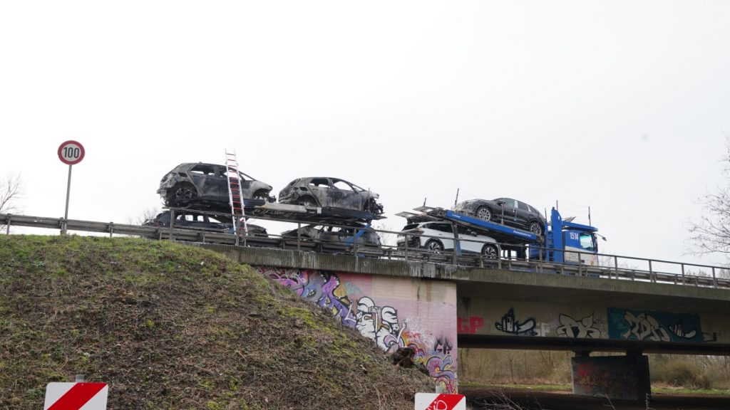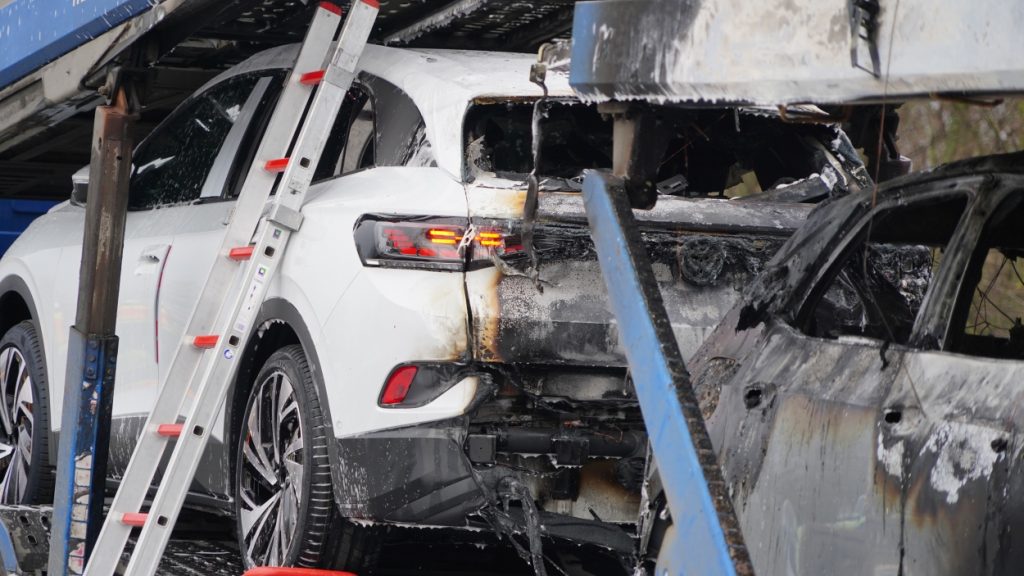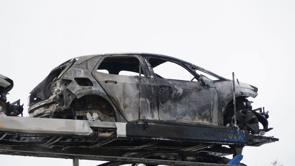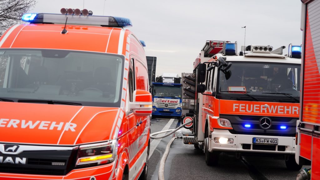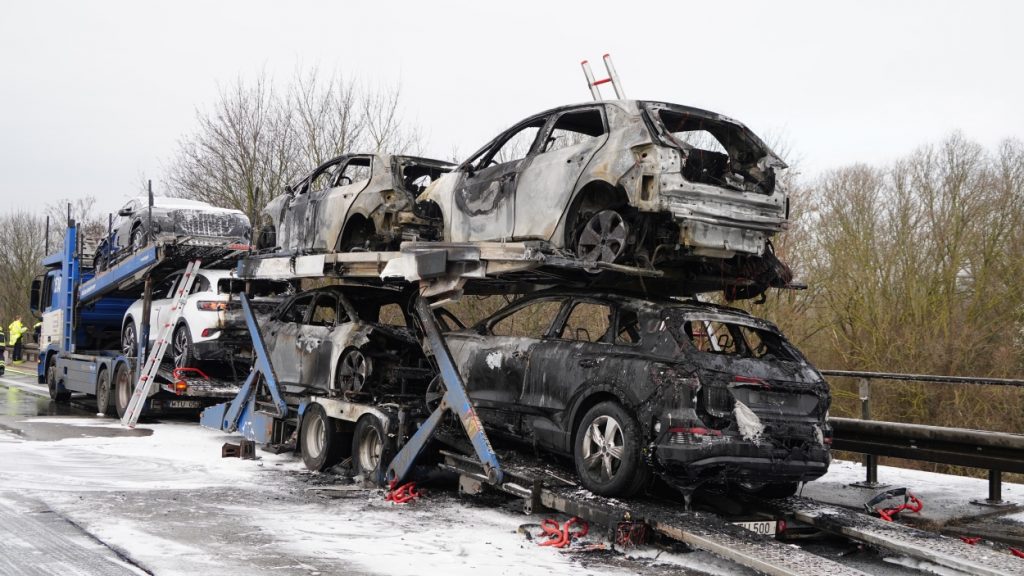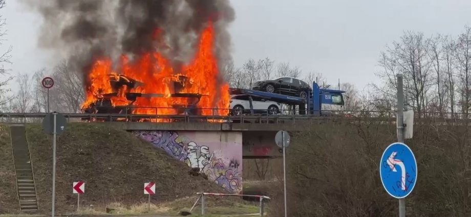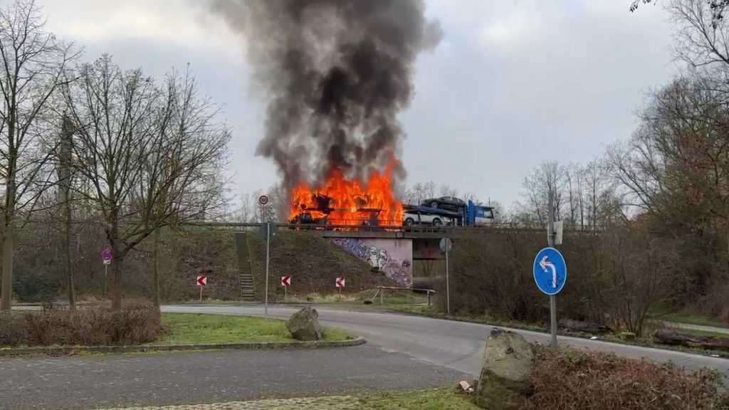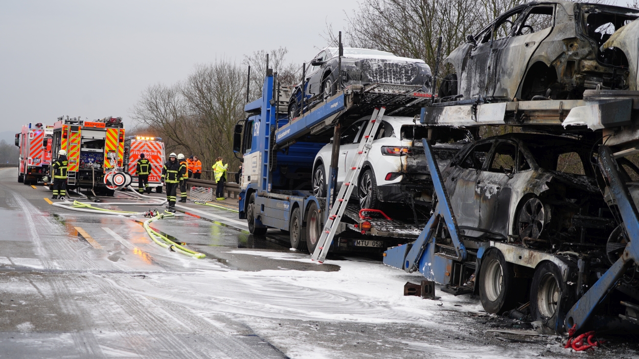 Kassel – Auf der A49 bei Kassel kam es am Freitagmorgen zu einem LKW-Brand. Ein Autotransporter beladen mit sechs Elektrofahrzeugen war gegen 08.30 Uhr auf der A49 von Lohfelden kommend in Fahrtrichtung Schwalmstadt unterwegs. In Höhe der Kasseler Messehallen bemerkte der Fahrer im Rückspiegel Flammen am Reifen des Auflieger und steuerte sein LKW direkt auf den Standstreifen. Der Fahrer versuchte noch, das Feuer zu löschen, was ihm allerdings nicht mehr gelangte. Innerhalb weniger Minuten standen vier Elektrofahrzeuge im Vollbrand. Zwei weitere wurden stark beschädigt. Die alarmierte Berufsfeuerwehr Kassel konnte das Feuer schnell unter Kontrolle bringen. Mithilfe eines Teleskoplader von der Feuerwehr wurden die Elektrofahrzeuge vom Autotransporter kontrolliert entladen und nach weiteren Glutnestern abgesucht. Die Autobahn musste für die Lösch- und Bergungsarbeiten mehrere Stunden voll gesperrt werden was zu einem Verkehrschaos in Kassel führte. Der Sachschaden wird von der Polizei auf 300.000 Euro geschätzt. Verletzt wurde niemand.