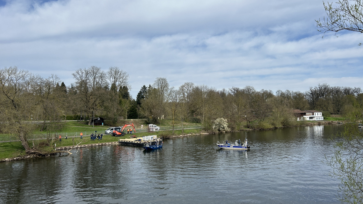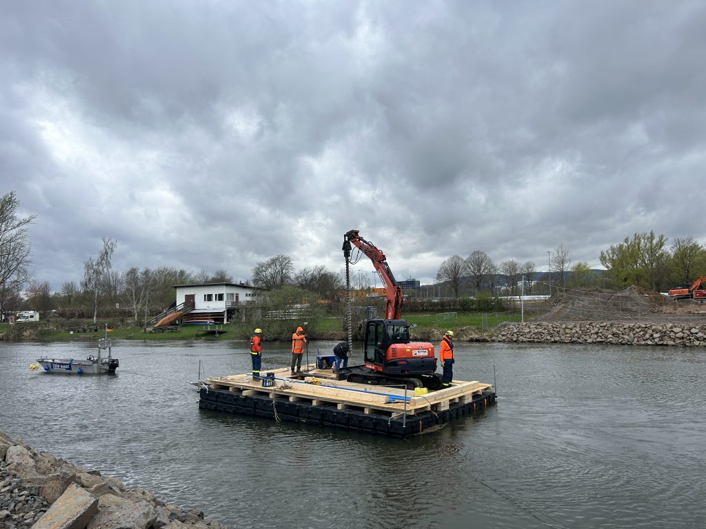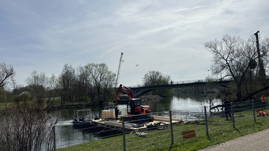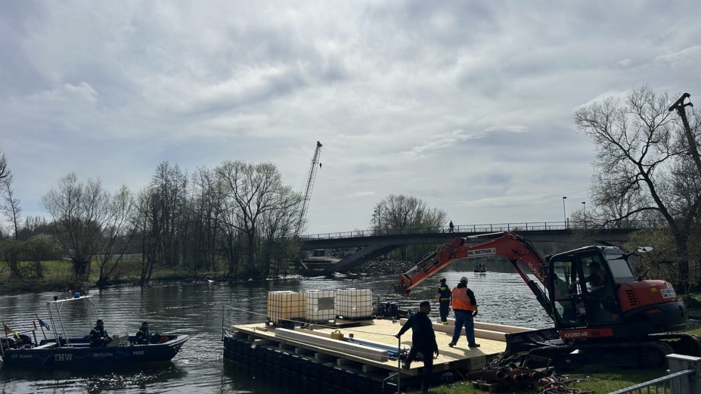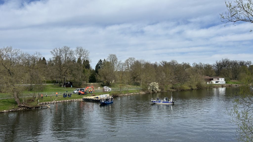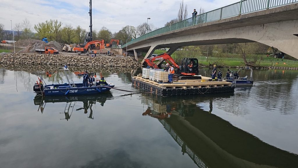 Kassel – seit dem Montagvormittag ist das THW OV Kassel für den Neubau der Damaschkebrücke im Einsatz, die Stadt Kassel beauftragte das THW, um eine Fachfirma vor Ort zu unterstützen, die seit dem heutigen Donnerstagvormittag Sondierungsarbeiten in der Fulda macht. Mit rund 20 Einsatzkräften ist das THW täglich vor Ort. Am Mittwochmittag wurde ein rund 10 Tonnen schwerer Bagger für die Sondierungsarbeiten auf eine Plattform gestellt, die durch das THW aufgebaut und gesichert wurde. Auch während der Sondierungsarbeiten ist das THW weiterhin für die Fachfirma da und unterstützt bei der Sicherung sowie bei der Umsetzung der Plattform auf dem Wasser. Mit mehreren Drahtseilen wird die Plattform in allen Richtungen gesichert. Die Sondierungsarbeiten in der Fulda sind ein wichtiger Bestandteil für den Neubau der Damaschkebrücke. Der Einsatz wird für die Fachfirma sowie für das THW noch einige Tage andauern.