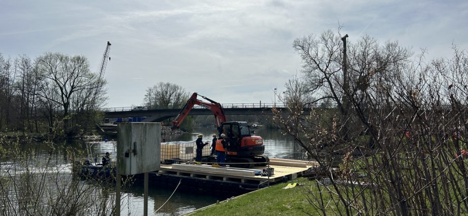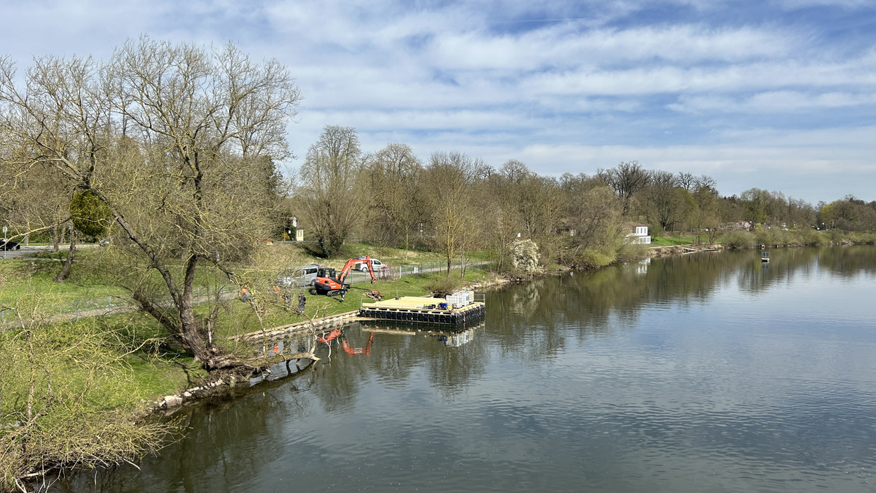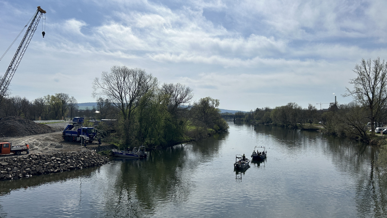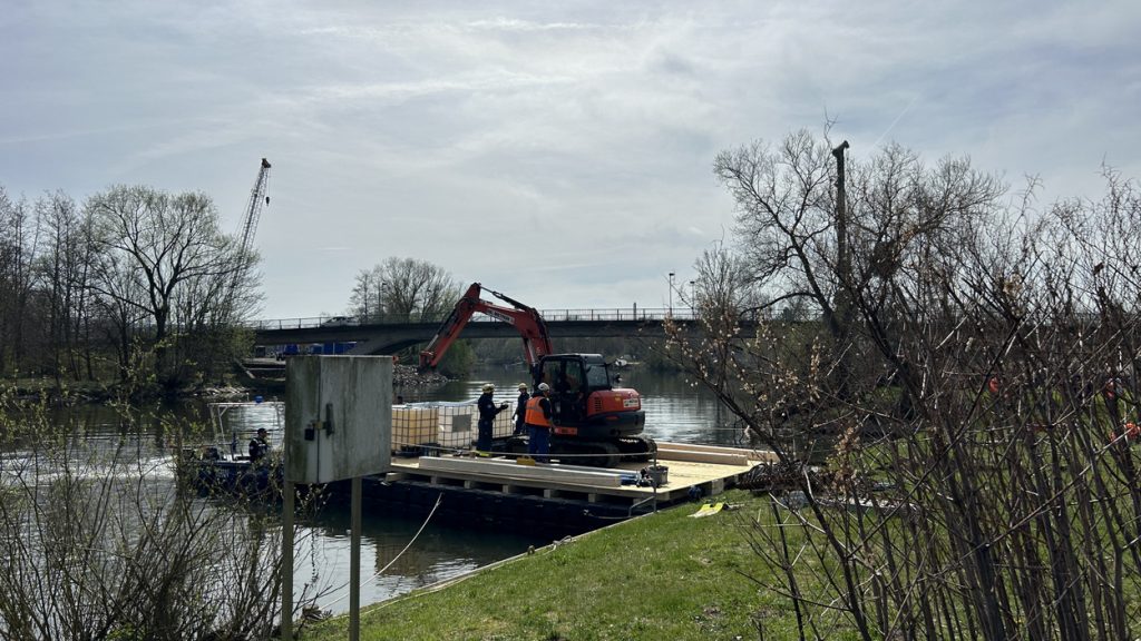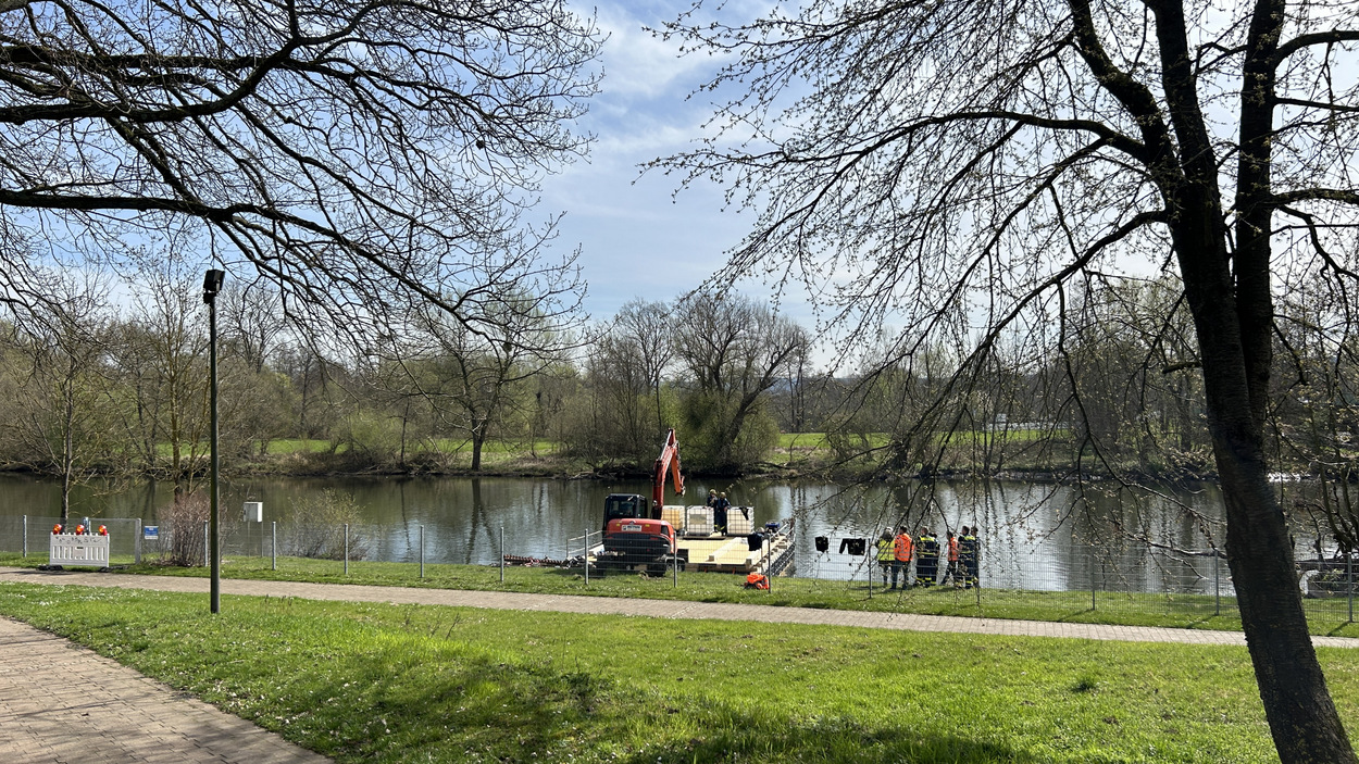 Kassel – seit dem Montagvormittag ist das THW OV Kassel für den Neubau der Damaschkebrücke im Einsatz, die Stadt Kassel beauftragte das THW, um eine Fachfirma vor Ort zu unterstützen, die seit dem heutigen Donnerstagvormittag Sondierungsarbeiten in der Fulda macht. Mit rund 20 Einsatzkräften ist das THW täglich vor Ort. Am Mittwochmittag wurde ein rund 10 Tonnen schwerer Bagger für die Sondierungsarbeiten auf eine Plattform gestellt, die durch das THW aufgebaut und gesichert wurde. Auch während der Sondierungsarbeiten ist das THW weiterhin für die Fachfirma da und unterstützt bei der Sicherung sowie bei der Umsetzung der Plattform auf dem Wasser. Mit mehreren Drahtseilen wird die Plattform in allen Richtungen gesichert. Die Sondierungsarbeiten in der Fulda sind ein wichtiger Bestandteil für den Neubau der Damaschkebrücke. Der Einsatz wird für die Fachfirma sowie für das THW noch einige Tage andauern.
