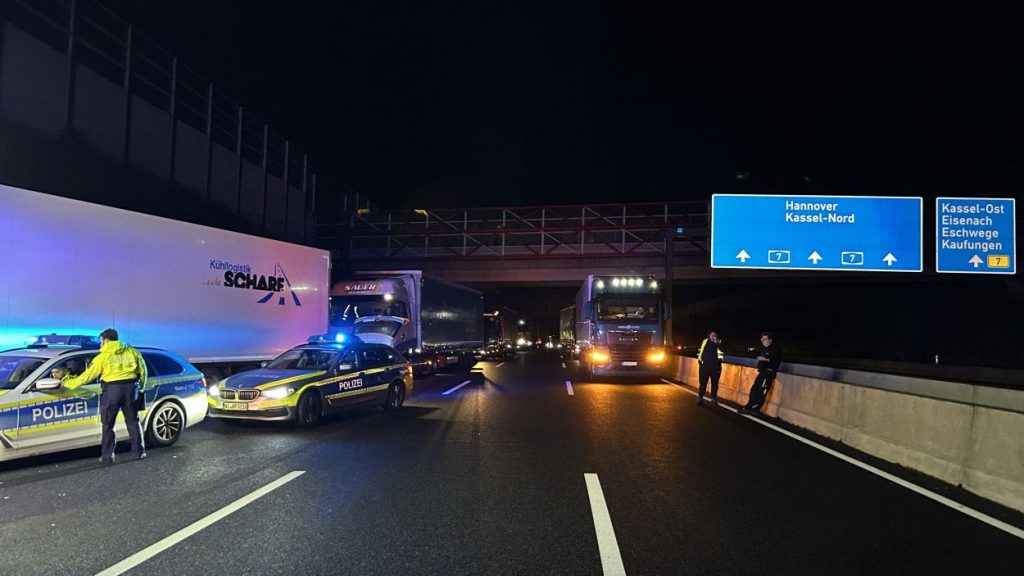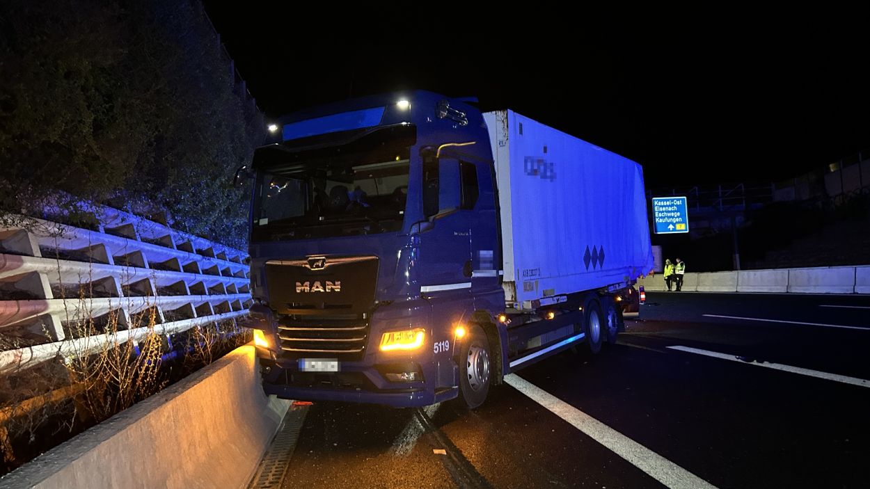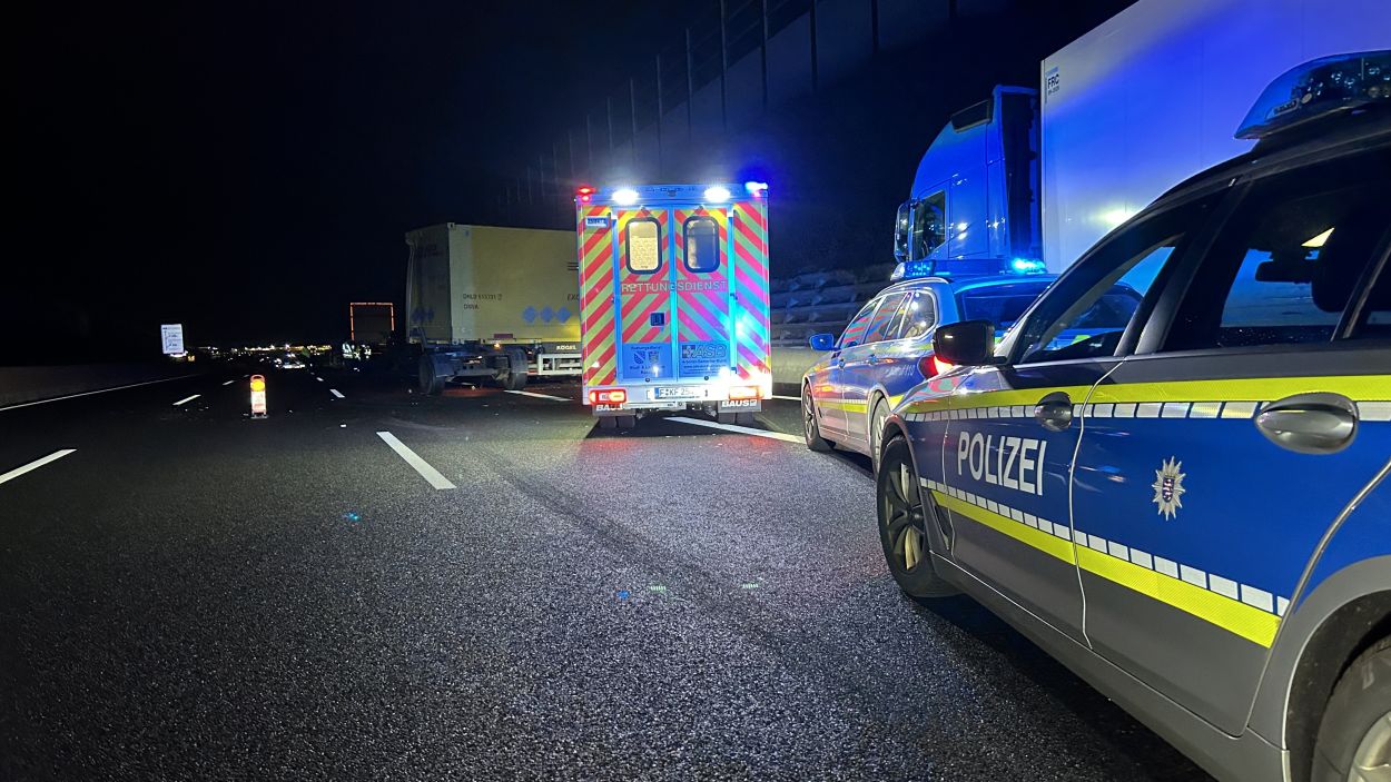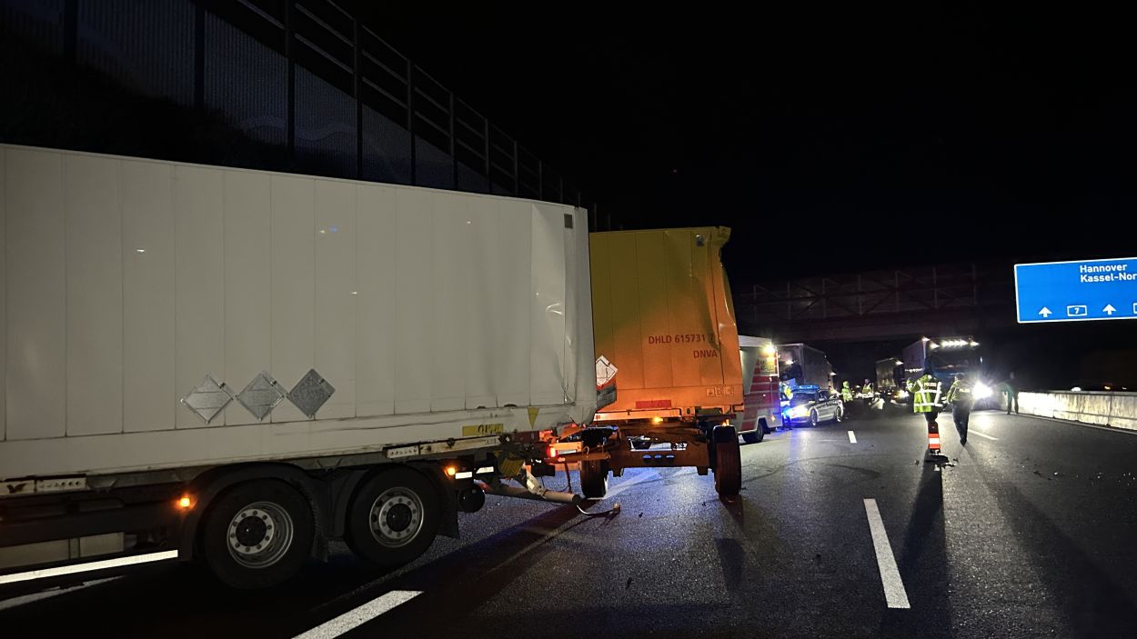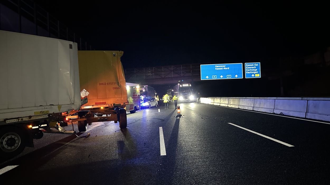 Kassel – Auf der A7 zwischen Kassel Ost und Kassel Mitte kam es am Dienstagabend zu einem schweren LKW-Unfall. Nach derzeitigem Ermittlungsstand war ein 57-jährige Mann mit seinem Gliederzug gegen 21.30 Uhr auf der Autobahn in Fahrtrichtung Süd mit einer Panne auf dem zweiten von vier Fahrstreifen liegengeblieben und offenbar in der Absicht ausgestiegen, seinen Lkw durch Aufstellen von Warnmaterial abzusichern. Ein nachfolgender 52-jähriger Gliederzug-Fahrer erkannte den Pannen-Lkw nicht rechtzeitig und wich noch nach rechts aus, stieß aber gegen den stehenden Lkw-Anhänger. Durch den Aufprall wurde der auffahrende Gliederzug auf die rechte Betonschutzwand geschoben und der Auflieger stürzte um. Der 57-Jährige wurde mutmaßlich von den umher schleudernden Fahrzeugen getroffen und erlitt dabei so schwere Verletzungen, dass für ihn jede Hilfe zu spät kam. Ein nachfolgender 50-jähriger Wohnmobilfahrer aus Witzenhausen konnten nicht mehr ausweichen und stieß an der Unfallstelle mit einem der Lkw zusammen. Aufgrund der Rettungs- und Bergungsarbeiten war die A 7 in Richtung Süd bis 3:30 Uhr voll gesperrt. Gegen 9:00 Uhr konnten nach den letzten Aufräumarbeiten alle Fahrstreifen wieder für den Verkehr freigegeben werden.