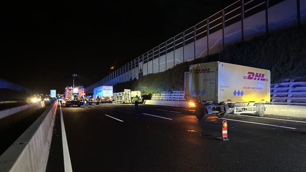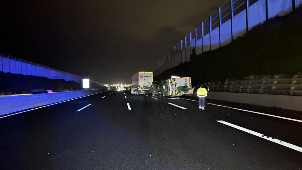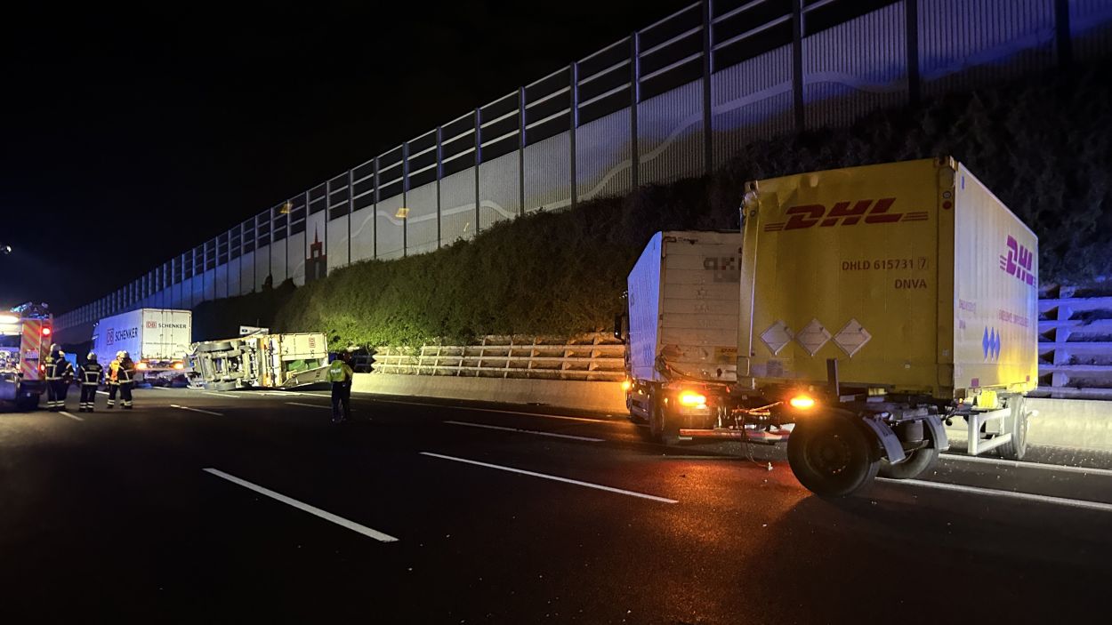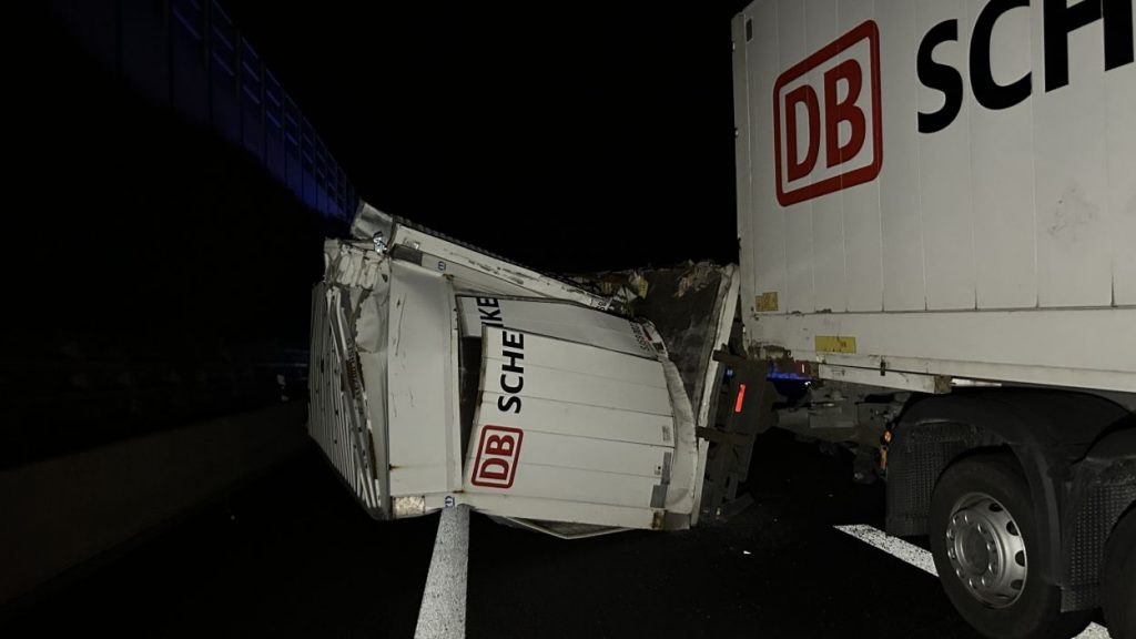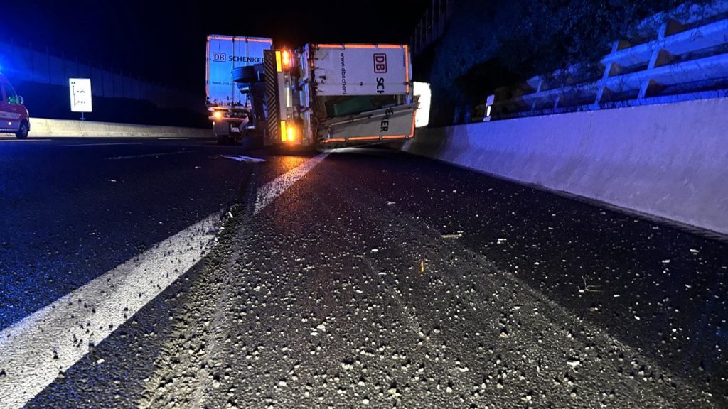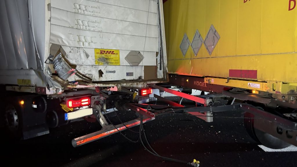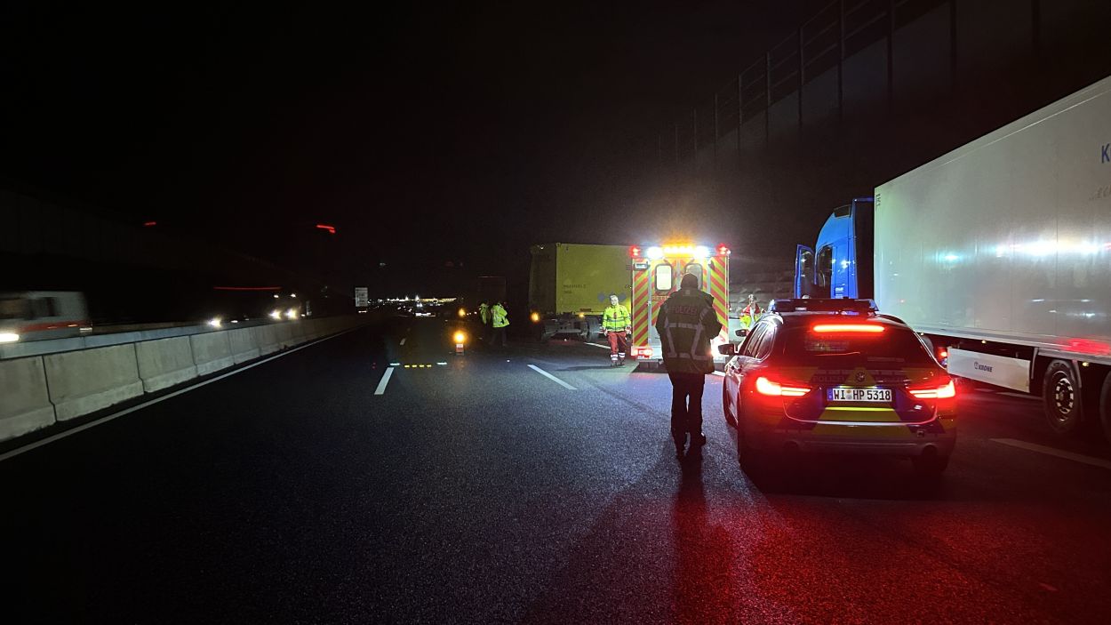Kassel – Auf der A7 zwischen Kassel Ost und Kassel Mitte kam es am Dienstagabend zu einem schweren LKW-Unfall. Nach derzeitigem Ermittlungsstand war ein 57-jährige Mann mit seinem Gliederzug gegen 21.30 Uhr auf der Autobahn in Fahrtrichtung Süd mit einer Panne auf dem zweiten von vier Fahrstreifen liegengeblieben und offenbar in der Absicht ausgestiegen, seinen Lkw durch Aufstellen von Warnmaterial abzusichern. Ein nachfolgender 52-jähriger Gliederzug-Fahrer erkannte den Pannen-Lkw nicht rechtzeitig und wich noch nach rechts aus, stieß aber gegen den stehenden Lkw-Anhänger. Durch den Aufprall wurde der auffahrende Gliederzug auf die rechte Betonschutzwand geschoben und der Auflieger stürzte um. Der 57-Jährige wurde mutmaßlich von den umher schleudernden Fahrzeugen getroffen und erlitt dabei so schwere Verletzungen, dass für ihn jede Hilfe zu spät kam. Ein nachfolgender 50-jähriger Wohnmobilfahrer aus Witzenhausen konnten nicht mehr ausweichen und stieß an der Unfallstelle mit einem der Lkw zusammen. Aufgrund der Rettungs- und Bergungsarbeiten war die A 7 in Richtung Süd bis 3:30 Uhr voll gesperrt. Gegen 9:00 Uhr konnten nach den letzten Aufräumarbeiten alle Fahrstreifen wieder für den Verkehr freigegeben werden.