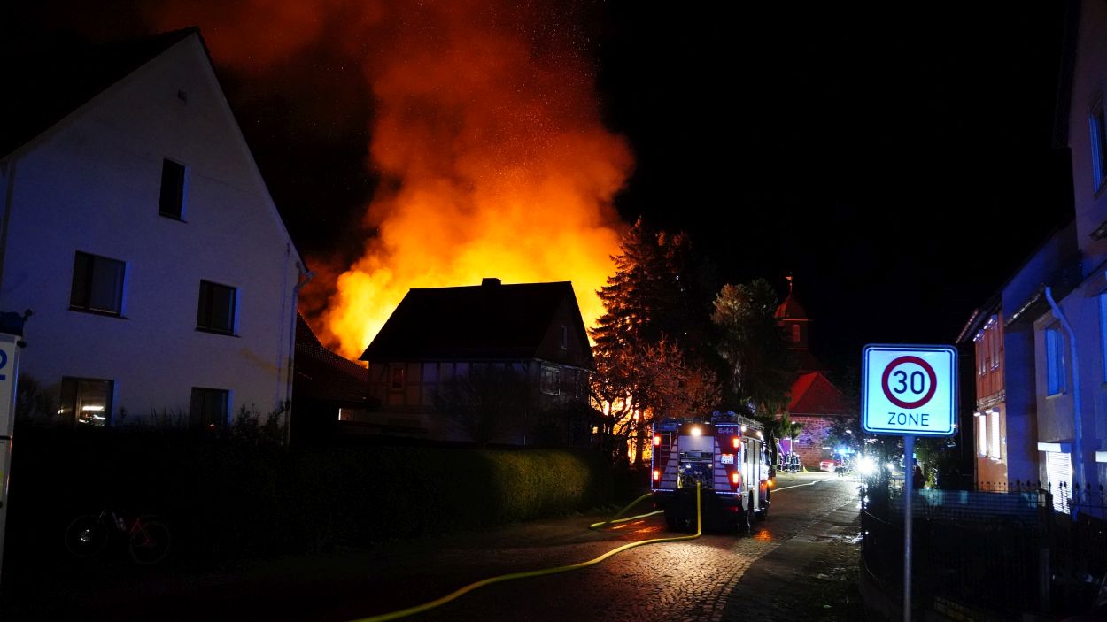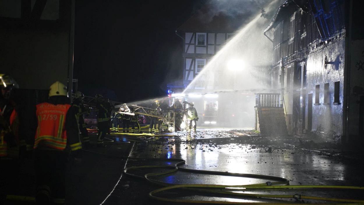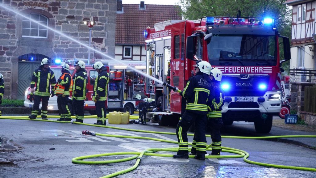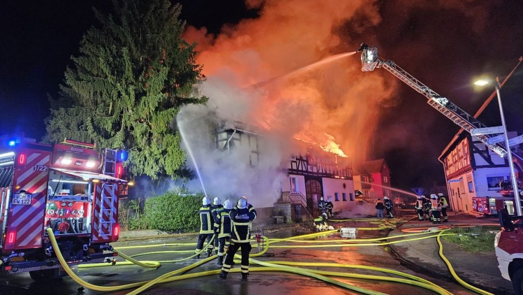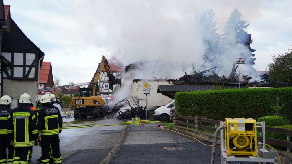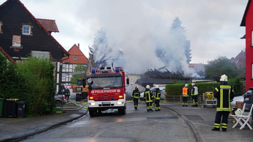 Wolfhagen – Zu einem Großbrand kam es in der Nacht auf Mittwoch im Wolfhager Ortsteil Nothfelden. Als die ersten Einsatzkräfte um kurz nach 3 Uhr eintrafen, stand das Fachwerkhaus mit einer Drechslerei im Vollbrand. Der starke Funkenflug sorgte am Anfang für eine Gefahr für umliegende Gebäude. Zur Unterstützung wurde die Feuerwehr Bad Arolsen mit einer zweiten Drehleiter dazu alarmiert. Zusätzlich wurden mehrere Riegelstellungen aufgebaut, um ein Ausbreiten der Flammen zu verhindern. Durch die massive Brandausbreitung war ein Innenangriff im Gebäude nicht mehr möglich. Ein Übergreifen der Flammen auf weitere Gebäude konnte trotz der engen Bebauung verhindert werden. Bei den Nachlöscharbeiten kam auch ein Bagger zu Hilfe, um das Gebäude nach und nach abzutragen. So konnten die Feuerwehr auch die Glutnester im Gebäude bekämpfen. Rund 140 Einsatzkräfte sind im Einsatz. Laut Einsatzleiter Sebastian Swoboda werden die Nachlöscharbeiten noch den ganzen Tag andauern. Verletzt wurde niemand. Wie es zum Brand kommen konnte, ist derzeit noch unklar. Es wird nach berichtet.