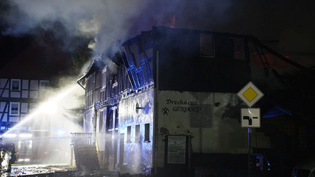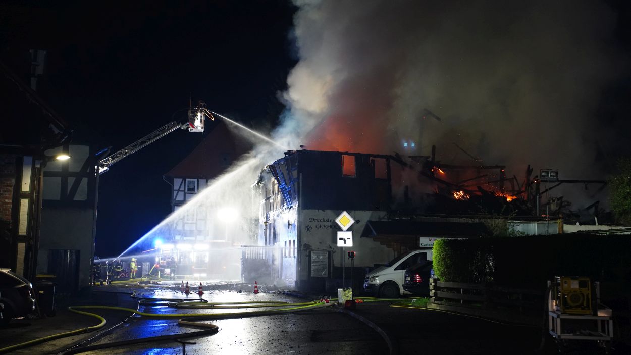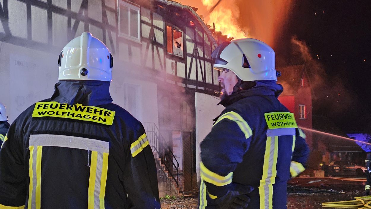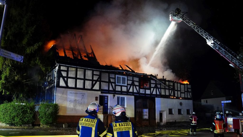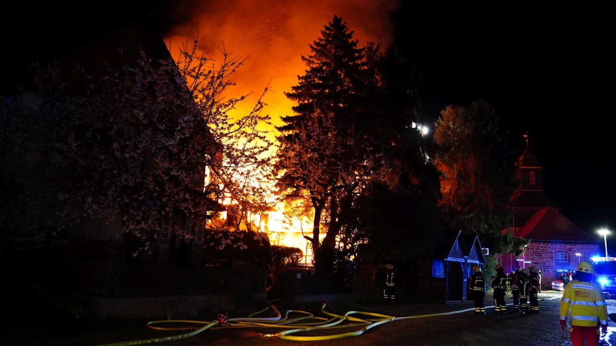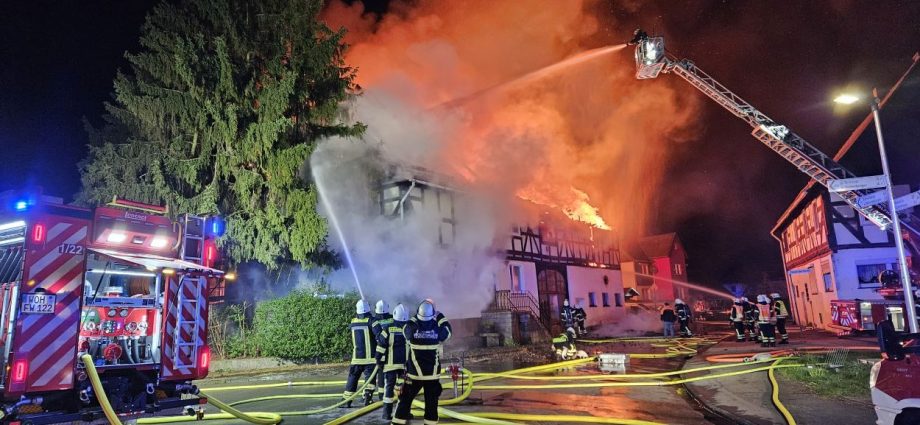 Wolfhagen – Zu einem Großbrand kam es in der Nacht auf Mittwoch im Wolfhager Ortsteil Nothfelden. Als die ersten Einsatzkräfte um kurz nach 3 Uhr eintrafen, stand das Fachwerkhaus mit einer Drechslerei im Vollbrand. Der starke Funkenflug sorgte am Anfang für eine Gefahr für umliegende Gebäude. Zur Unterstützung wurde die Feuerwehr Bad Arolsen mit einer zweiten Drehleiter dazu alarmiert. Zusätzlich wurden mehrere Riegelstellungen aufgebaut, um ein Ausbreiten der Flammen zu verhindern. Durch die massive Brandausbreitung war ein Innenangriff im Gebäude nicht mehr möglich. Ein Übergreifen der Flammen auf weitere Gebäude konnte trotz der engen Bebauung verhindert werden. Bei den Nachlöscharbeiten kam auch ein Bagger zu Hilfe, um das Gebäude nach und nach abzutragen. So konnten die Feuerwehr auch die Glutnester im Gebäude bekämpfen. Rund 140 Einsatzkräfte sind im Einsatz. Laut Einsatzleiter Sebastian Swoboda werden die Nachlöscharbeiten noch den ganzen Tag andauern. Verletzt wurde niemand. Wie es zum Brand kommen konnte, ist derzeit noch unklar. Es wird nach berichtet.