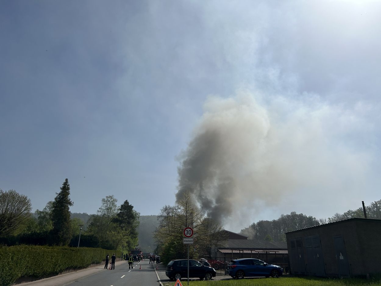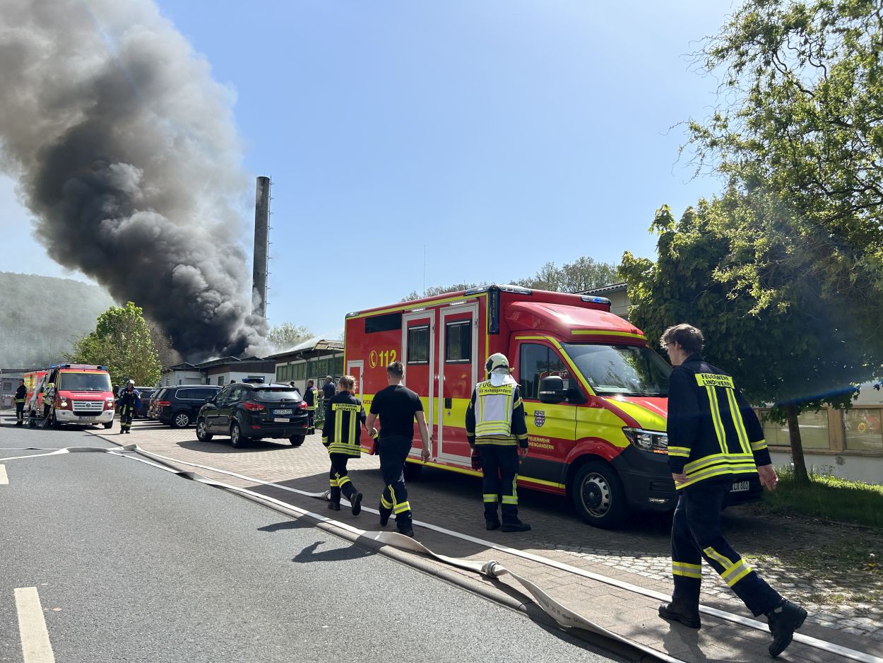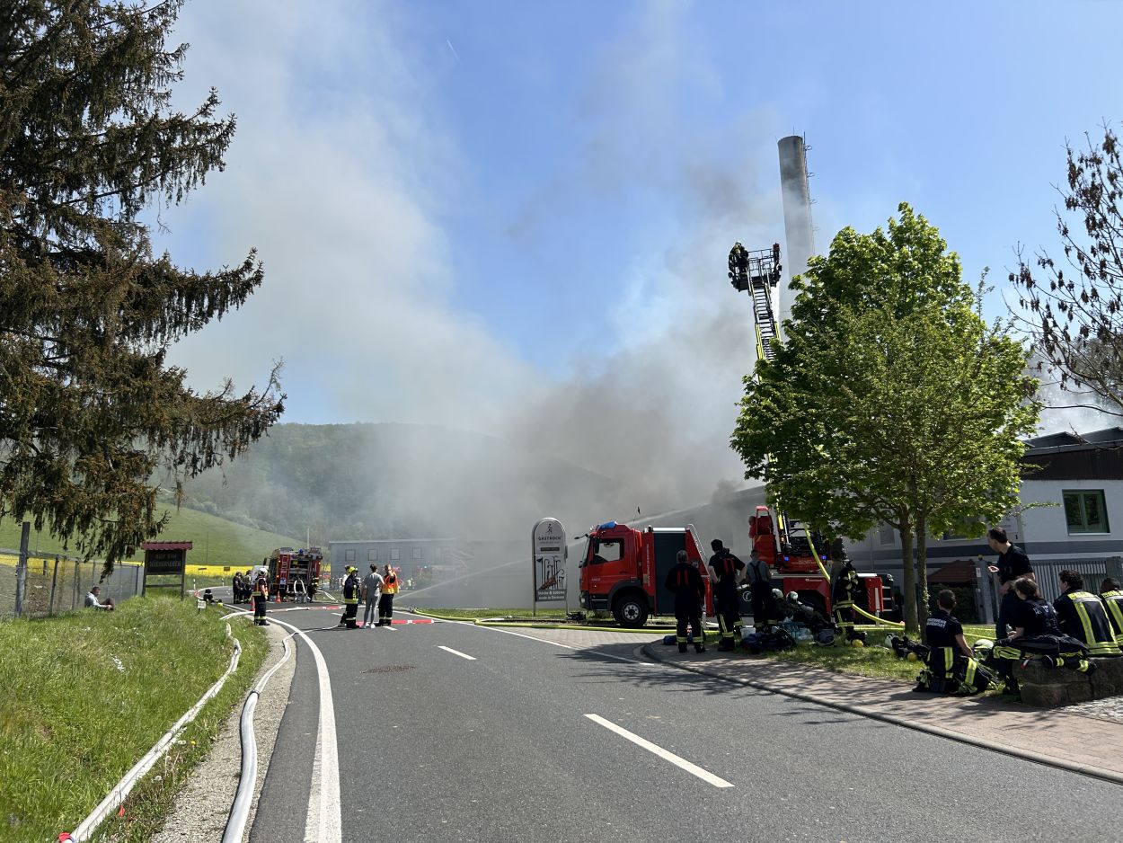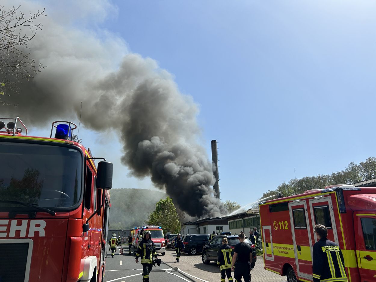 Wahlhausen – Am Dienstagmorgen gegen 08:30 Uhr brach in einem Spänebunker Betrieb in Wahlhausen an der thüringischen/hessischen Landesgrenze ein Feuer aus. Beim Eintreffen der ersten Einsatzkräfte war schon eine starke Verrauchung sowie Flammen sichtbar. Die Flammen griffen auf den Dachstuhl des Gebäudes über. Im ersten Verlauf wurde eine Wasserversorgung sowie eine Riegelstellung am Gebäude aufgebaut, weitere Kräfte wurden mittels Einsatzstichworterhöhung nachalarmiert. Probleme bei der Brandbekämpfung gab es, da das Dach nicht betreten werden konnte, da es sich um ein umgebautes Heizhaus handelt. Der Innenangriff der zum Anfang vorgenommen wurde, musste im weiteren Einsatzverlauf aus Sicherheitsgründen abgebrochen werden, da die Decke instabil wurde. Im Verlauf des Einsatzes wurde ein Fachberater des THW beauftragt, die Struktur des Gebäudes zu kontrollieren, um weitere Vorgehensweisen festlegen zu können. Im weiteren Verlauf wird geschaut, wie der Brand komplett erstickt werden kann, dafür kommt im Nachgang der Löschschaum zum Einsatz. Der Gesamtschaden beläuft sich laut Polizei auf mehrere Hunderttausend Euro. Insgesamt waren von Feuerwehr, THW, Roten Kreuz, Fachbehörden, untere Wasserbehörde und Energie Versorger mit rund 200 Kräften vor Ort. Rund 50 Fahrzeuge befanden sich bei dem Großbrand. Zum aktuellen Stand ist noch nicht absehbar, wie lange der Einsatz noch dauert.