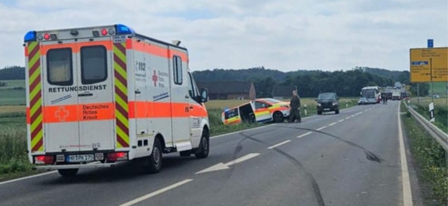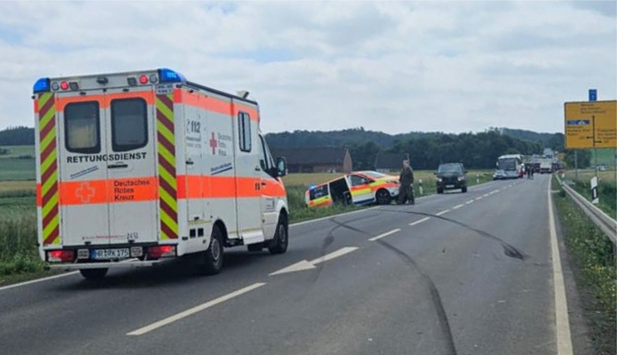 Fritzlar – Zu einem Verkehrsunfall mit einem eines Notarzteinsatzfahrzeug (NEF) kam es am Montagnachmittag auf der B450 zwischen Fritzlar und Borken. Gegen 13:31 Uhr befuhr ein Lkw (3,5 t.) sowie ein VW-Polo hintereinander die B450 aus Borken kommend in Fahrtrichtung Fritzlar. Auf Höhe des Flugplatzes kam im Begegnungsverkehr ein im Einsatz befindliches Notarzteinsatzfahrzeug unter der Nutzung von Sonderrechten entgegen. Der Lkw verlangsamte seine Geschwindigkeit und fuhr an den rechten Fahrbahnrand und machte somit die Fahrbahn frei. Aus noch ungeklärter Ursache fuhr die nachfolgende Polo-Fahrerin an dem Lkw vorbei und kollidierte hierbei mit dem entgegenkommenden Notarzteinsatzfahrzeug. Durch die Kollision dreht sich das Notarzteinsatzfahrzeug und wurde in den angrenzenden Straßengraben geschleudert. Der Polo wurde nach rechts gegen den Lkw geschleudert. Die 45-jährige Polo-Fahrerin aus Frielendorf wurde hierbei leicht verletzt und wurde zur weiteren Versorgung in ein Krankenhaus eingeliefert. Die Besatzung des Notarzteinsatzfahrzeug, eine 49-Jährige aus Fritzlar sowie ein 25-Jähriger aus Borken, blieben unverletzt. Auch der 46-jährige Lkw-Fahrer blieb unverletzt. An allen drei Fahrzeugen entstand Sachschaden. An dem Notarzteinsatzfahrzeug sowie an dem Polo entstand Totalschaden. Insgesamt wird die Schadenshöhe auf 90.000 Euro geschätzt.