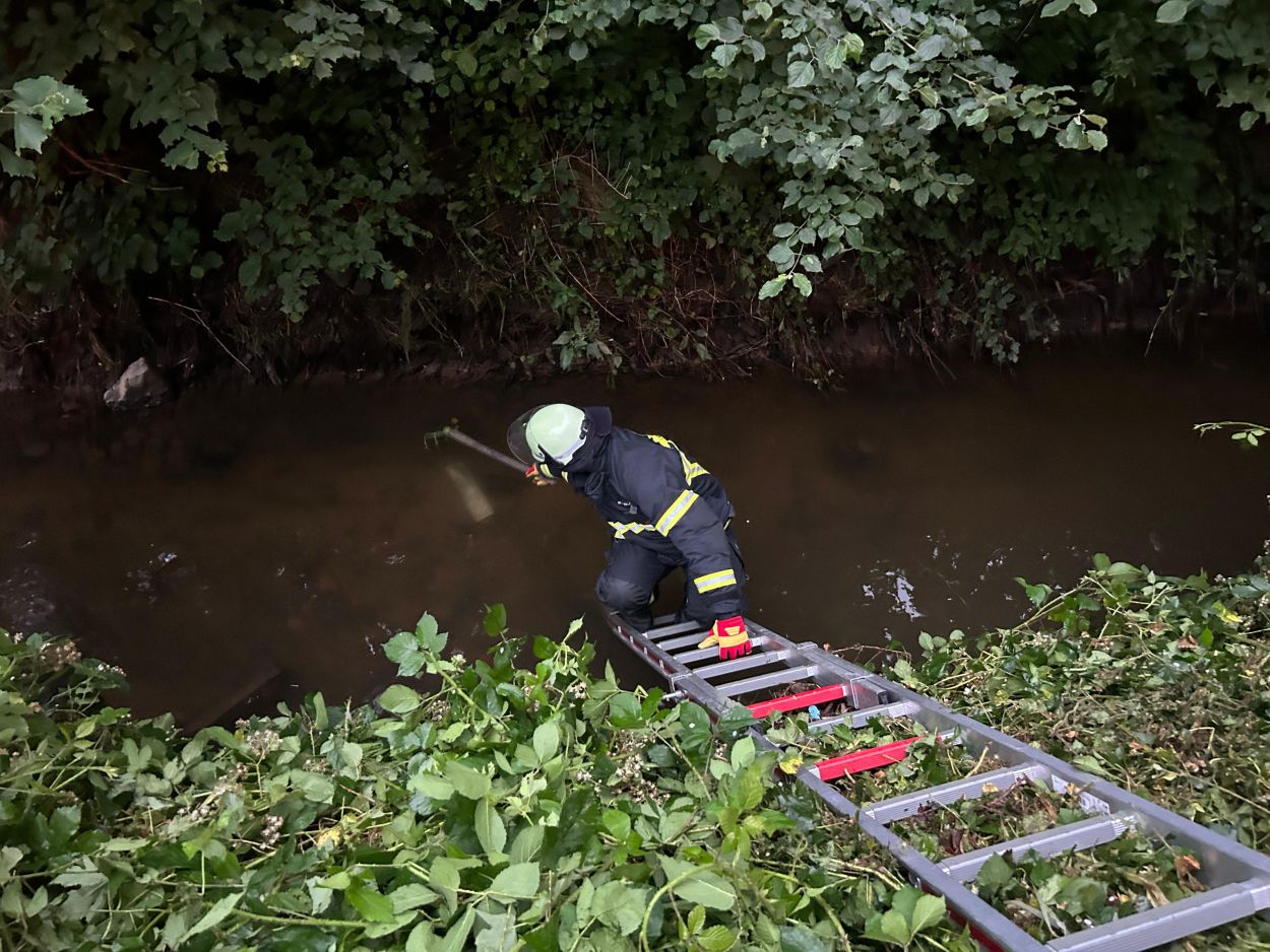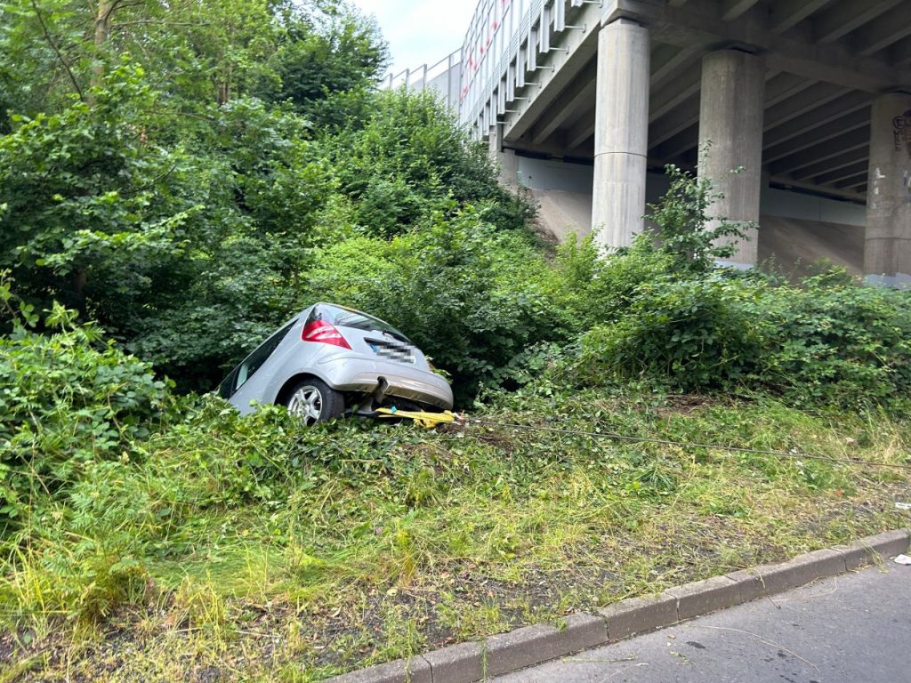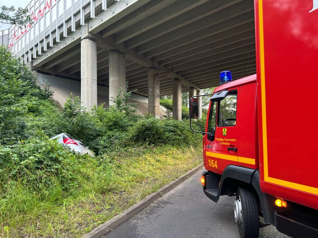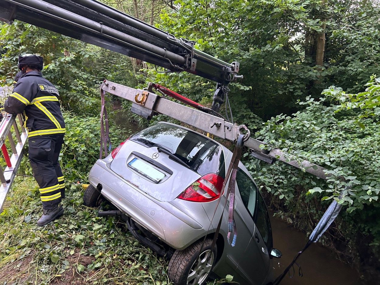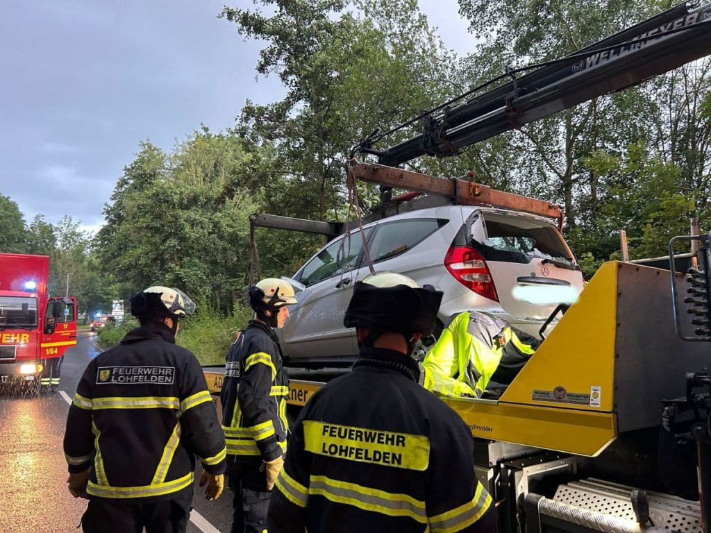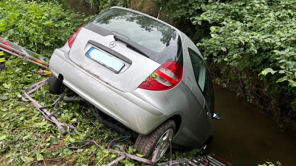 Lohfelden – Zu einem Verkehrsunfall kam es am Montagabend auf der Ochshäuser Dorfstraße in Lohfelden. Gegen 18 Uhr befuhr ein 27-Jähriger mit seinen Ford die Straße von Kassel kommend in Fahrtrichtung Lohfelden. In Höhe der Autobahnbrücke musste der 27-Jährige verkehrsbedingt bremsen. Das erkannte ein 22-Jähriger wohl zu spät, versuchte noch nach rechts auszuweichen, touchierte noch den Ford und fuhr dann in den Wahlebach, der parallel zur Straße fließt. Der 22-Jährige wurde leicht verletzt und kam in ein Krankenhaus. Für die aufwendige Bergung musste die Straße Teilwiese komplett gesperrt werden. Die Polizei schätzt den Schaden am Mercedes auf rund 2000 Euro, der Schaden am Ford wird auf 500 Euro geschätzt. Gegen 21 Uhr waren die Bergungsarbeiten abgeschlossen. Neben Rettungsdienst und Polizei war auch die Feuerwehr Lohfelden im Einsatz und sicherte das Fahrzeug im Wahlebach.