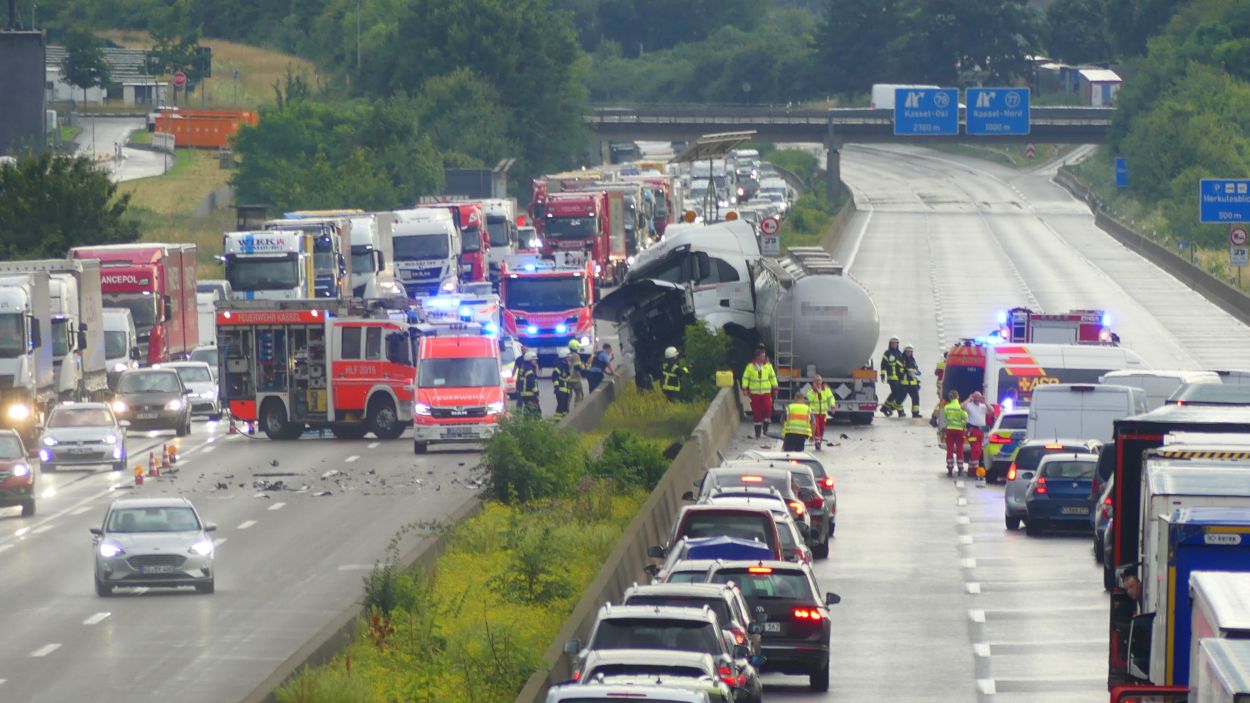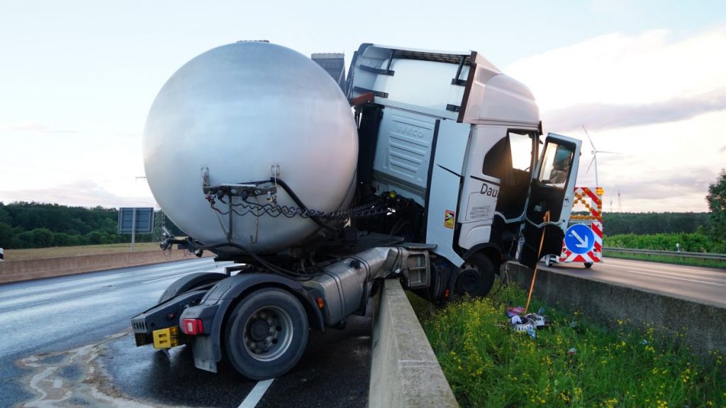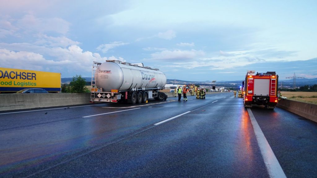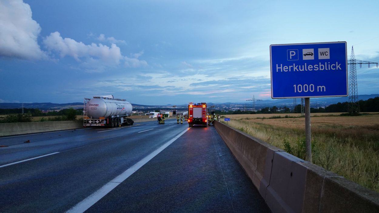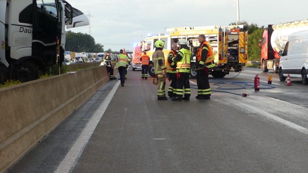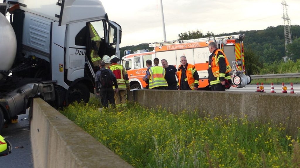 Kassel – Zu einem LKW-Unfall kam es am Mittwochabend auf der A7 zwischen der Anschlussstelle Lutterberg und Kassel-Nord. Der Fahrer eines Silo-LKW befuhr die Autobahn in Fahrtrichtung Süd. Rund 1000 Meter vor dem Parkplatz Herkulesblick verlor der Fahrer gegen 20 Uhr die Kontrolle über seinen LKW, durchbrach die mittlere Betonleitwand und kam auf diese einige Meter weiter mit dem Fahrerhaus zum Stehen. Wie durch ein Wunder wurde der Fahrer nicht verletzt. Allerdings riss der Tank auf und rund 300 bis 400 Liter Diesel verteilten sich auf die Fahrbahn. Zunächst ist man davon ausgegangen, dass der Silotank, beladen mit mehreren tausend Liter Mineralöl auch beschädigt wurde, woraufhin der Gefahrstoffzug alarmiert wurde. Bei der Erkundung stellte sich allerdings keine Beschädigung heraus. Daraufhin wurde die Einsatzstelle an die Polizei und dem Bergungsdienst übergeben. Neben den Feuerwehren aus dem Landkreis Niedersachsen war auch die Berufsfeuerwehr Kassel im Einsatz. Sie sicherten zunächst die Unfallstelle in Fahrtrichtung Nord ab. Die A7 bleibt in Fahrtrichtung Kassel für die Reinigungs- und Bergungsarbeiten bis spät in die Nacht voll gesperrt.