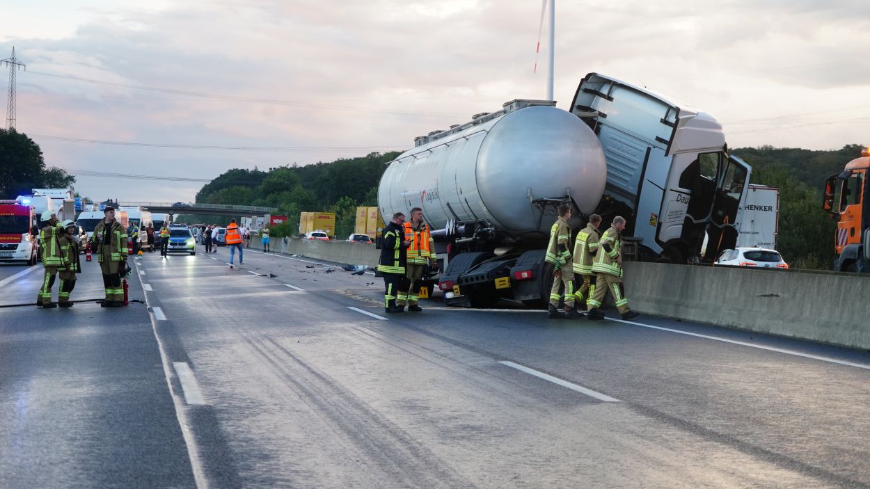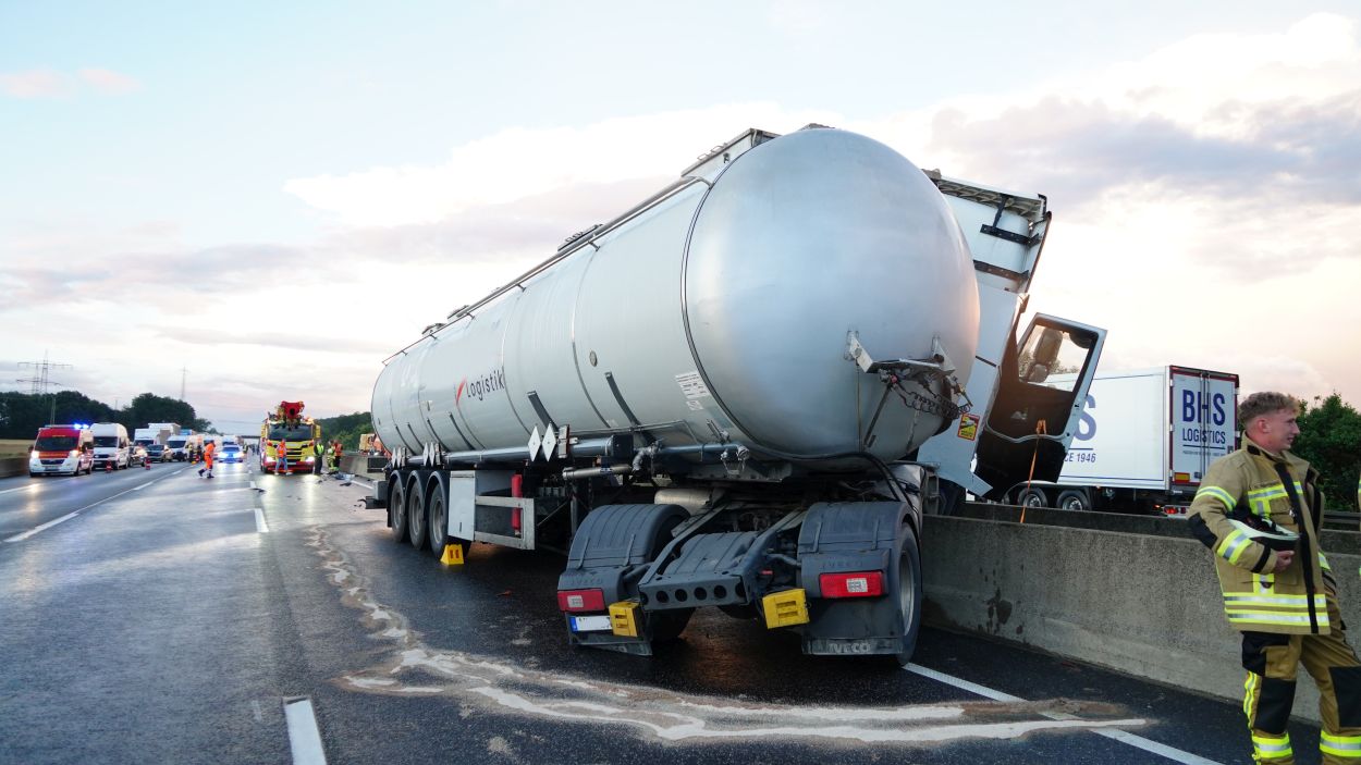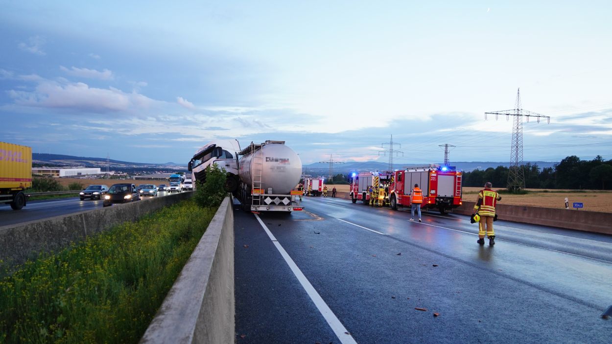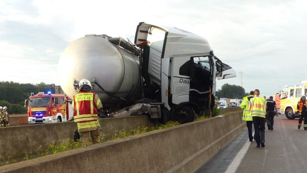 Kassel – Zu einem LKW-Unfall kam es am Mittwochabend auf der A7 zwischen der Anschlussstelle Lutterberg und Kassel-Nord. Der Fahrer eines Silo-LKW befuhr die Autobahn in Fahrtrichtung Süd. Rund 1000 Meter vor dem Parkplatz Herkulesblick verlor der Fahrer gegen 20 Uhr die Kontrolle über seinen LKW, durchbrach die mittlere Betonleitwand und kam auf diese einige Meter weiter mit dem Fahrerhaus zum Stehen. Wie durch ein Wunder wurde der Fahrer nicht verletzt. Allerdings riss der Tank auf und rund 300 bis 400 Liter Diesel verteilten sich auf die Fahrbahn. Zunächst ist man davon ausgegangen, dass der Silotank, beladen mit mehreren tausend Liter Mineralöl auch beschädigt wurde, woraufhin der Gefahrstoffzug alarmiert wurde. Bei der Erkundung stellte sich allerdings keine Beschädigung heraus. Daraufhin wurde die Einsatzstelle an die Polizei und dem Bergungsdienst übergeben. Neben den Feuerwehren aus dem Landkreis Niedersachsen war auch die Berufsfeuerwehr Kassel im Einsatz. Sie sicherten zunächst die Unfallstelle in Fahrtrichtung Nord ab. Die A7 bleibt in Fahrtrichtung Kassel für die Reinigungs- und Bergungsarbeiten bis spät in die Nacht voll gesperrt.