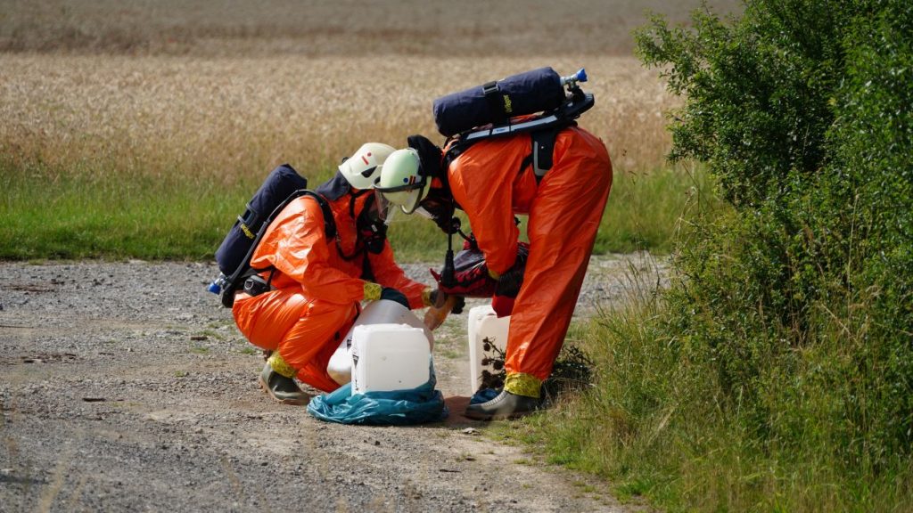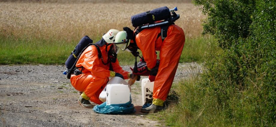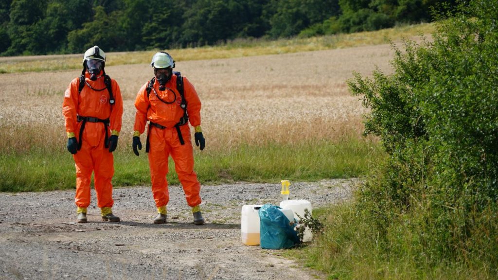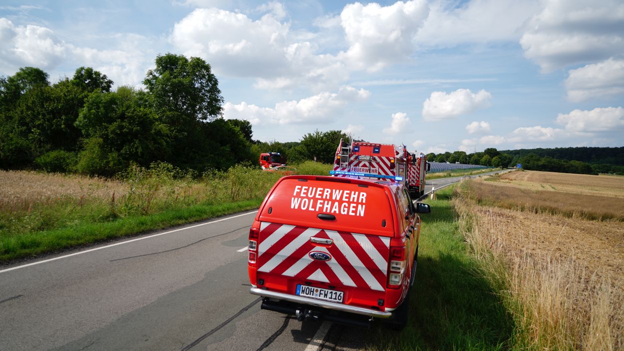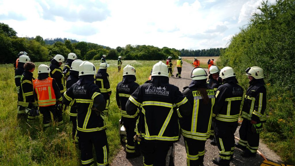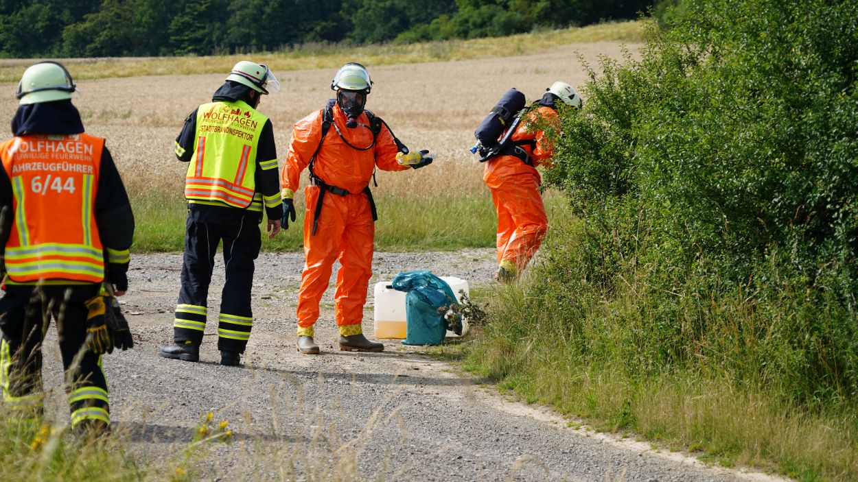 Wolfhagen – Zu einem Gefahrguteinsatz wurde die Feuerwehr Wolfhagen am Donnerstagnachmittag gegen 16 Uhr alarmiert. Auf einen Feldweg zwischen Niederelsungen und Breuna unterhalb eines Solarparks, entdeckte ein LKW-Fahrer bei einer Rastpause mehrere Behälter. Da die Behälter als ätzend gekennzeichnet sind, alarmierte der LKW-Fahrer die Feuerwehr. Rund 40 Einsatzkräfte aus Wolfhagen, Nothfelden und Niederelsungen trafen kurz danach am Einsatzort ein. Mit CSA (Chemikalien-Schutz-Anzug) wurden die Gebinde gegen auslaufen gesichert. Im weiteren Verlauf wurde ein Bindemittel für Chemikalien aufgetragen. Eine Fachfirma wurde mit der Entsorgung beauftragt. Gegen 17.30 Uhr war der Einsatz beendet. Der LKW-Fahrer wurde vorsichtshalber vom Rettungsdienst kontrolliert. Um was es sich für einen Stoff gehandelt hat, war abschließen aufgrund der geringen Menge nicht eindeutig bestimmbar. Die Polizei ermittelt nun wegen illegaler Müllentsorgung.