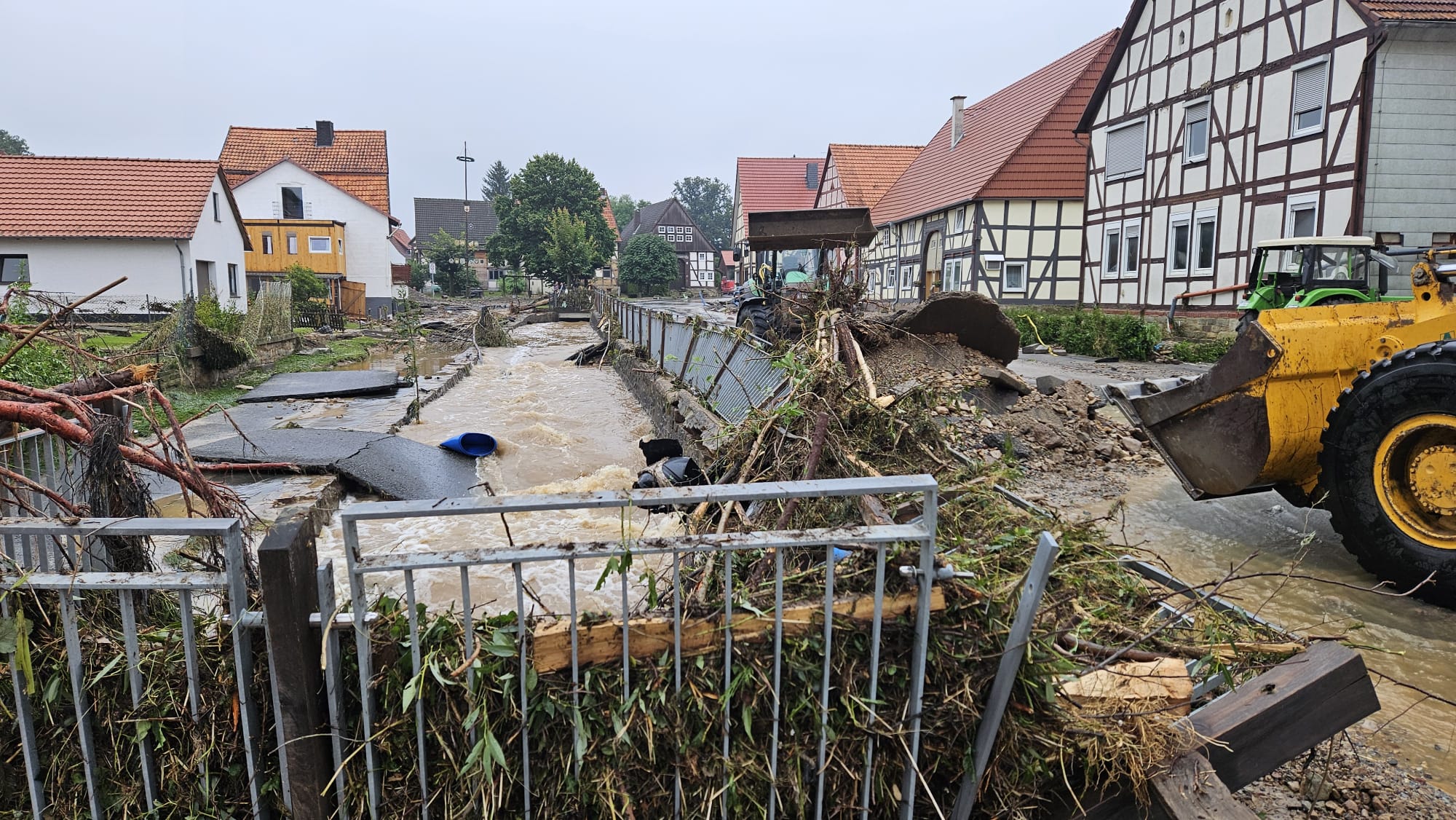 Trendelburg – Im Norden des Landkreises Kassel kam es zu stundenlangem Starkregen, der Mengen von bis zu 170 Litern pro Quadratmeter brachte und zu erheblichen Überschwemmungen führte. Die Feuerwehr war in Großalarmbereitschaft und führte umfangreiche Rettungseinsätze durch. Besonders betroffen waren die Städte Trendelburg und Hofgeismar, wo zahlreiche Straßen überflutet wurden. Die Einsatzkräfte mussten teilweise Boote nutzen, um Menschen aus ihren Häusern zu retten. Nach ersten Informationen gab es keine Verletzten. Viele Keller liefen voll Wasser, wodurch erheblicher Sachschaden entstand. In einigen Straßen wurden Heizöltanks angehoben und trieben durch die Fluten. In Trendelburg-Gottsbüren standen die Straßen bis zu zwei Meter unter Wasser. Autos wurden von den Wassermassen mitgerissen und türmen sich nun im Ortsgebiet. Neben dem Wasser verursachte auch der mitgeführte Schlamm erhebliche Schwierigkeiten bei den Aufräumarbeiten. Zusätzlich fielen teilweise der Strom und das Mobilfunknetz aus, was die Lage weiter erschwerte.