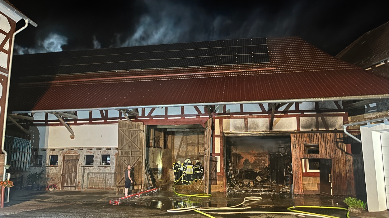 Jesberg – Zu einem Brand innerhalb einer Scheune kam es am Donnerstagabend in der Ortslage von Jesberg-Densberg. Knapp 100 Einsatzkräfte waren vor Ort im Einsatz. Ein Feuerwehrmann erlitt vor Ort einen medizinischen Notfall.