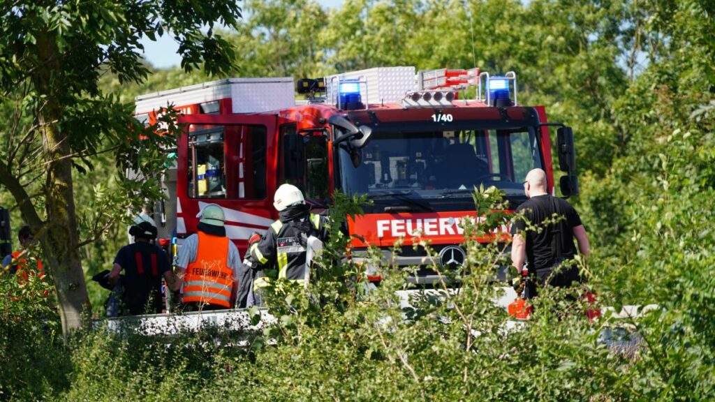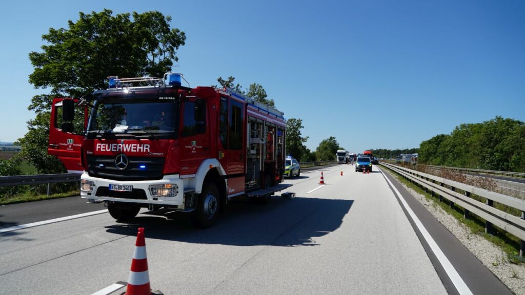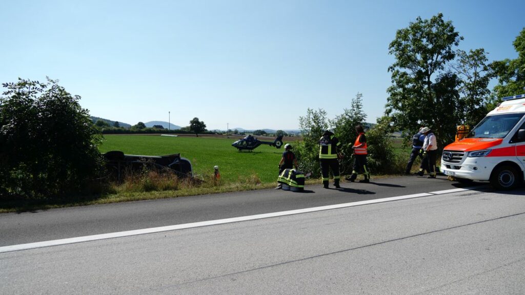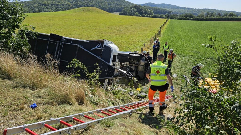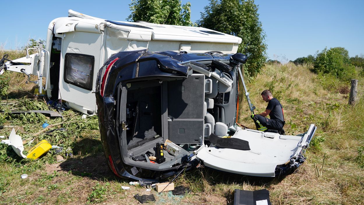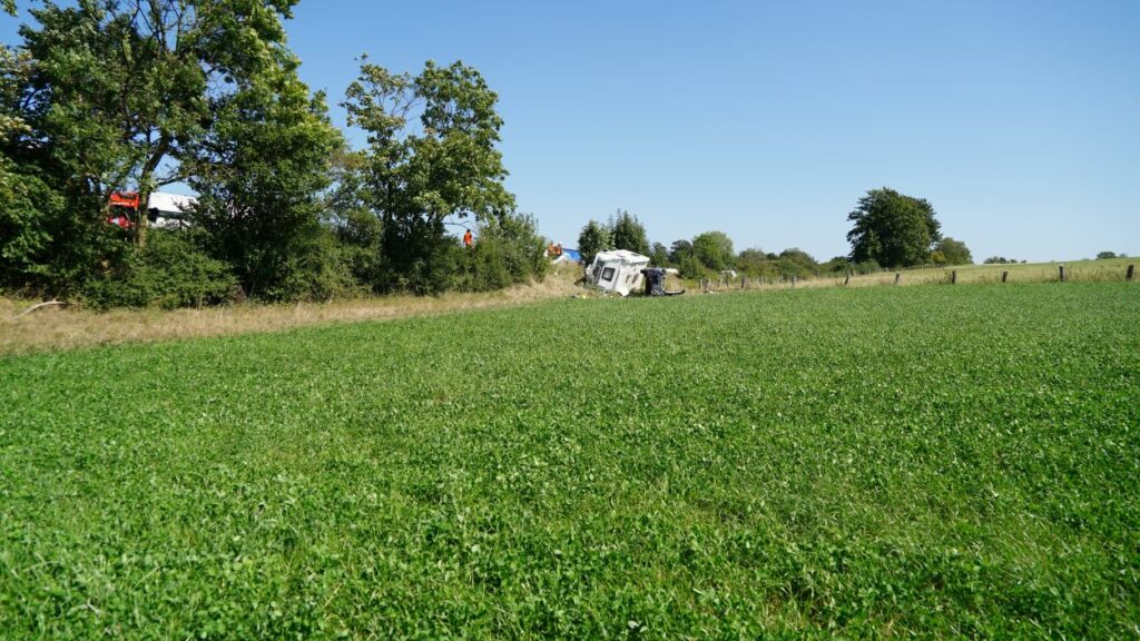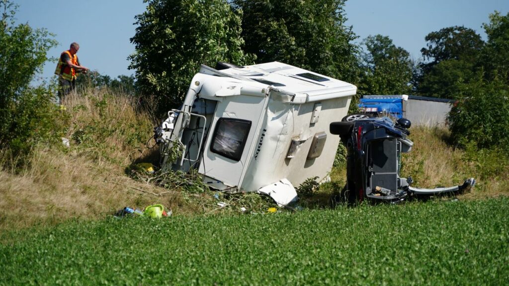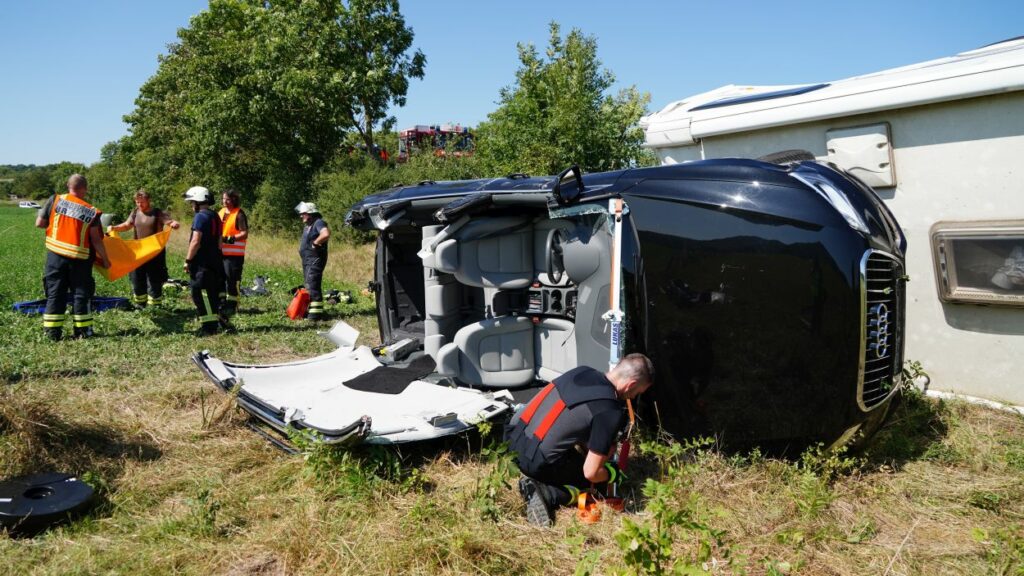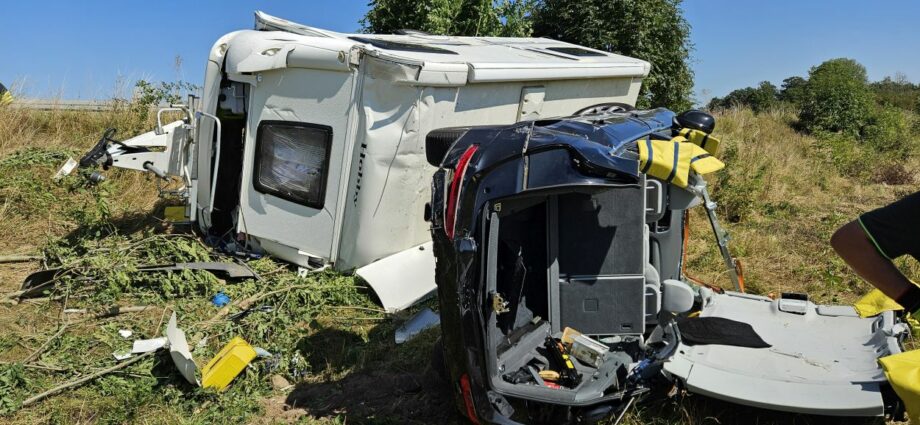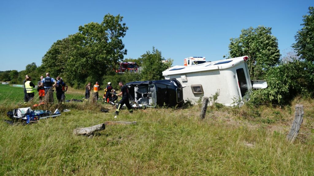Breuna – Zu einem schweren Verkehrsunfall mit einem Wohnwagengespann kam es am Mittwochnachmittag auf der A44 zwischen Breuna und Zierenberg. Das Fahrzeug besetzt mit zwei Personen befuhr die Autobahn gegen 12.30 Uhr in Fahrtrichtung Kassel. Kurz nach der Rastanlage Bühleck kam das Gespann ins Schleudern und fuhr nach rechts eine Böschung herunter. Das Gespann verkeilte in sich und die Insassen wurden in ihrem Fahrzeug eingeschlossen. Die alarmierte Feuerwehr aus Breuna nahm eine Patientengerechte Rettung vor und musste dafür das Dach aufschneiden. Um mehr Platz an der Unfallstelle zu schaffen, musste auch ein Pfosten von einer Rinderweide entfernt werden. Die Tiere verhielten sich Ruhig und waren im hinteren Bereich der Weide. Nach einer Erstversorgung an der Unfallstelle kamen die Verletzten in ein Krankenhaus nach Kassel. Neben der Feuerwehr und Polizei kam auch der Christoph 7 (Ersatzmaschine) zum Einsatz. Er brachte den Notarzt zur Einsatzstelle. Für den Rettungseinsatz musste die Autobahn voll gesperrt werden. Die Vollsperrung konnte gegen 13.45 Uhr aufgehoben werden.