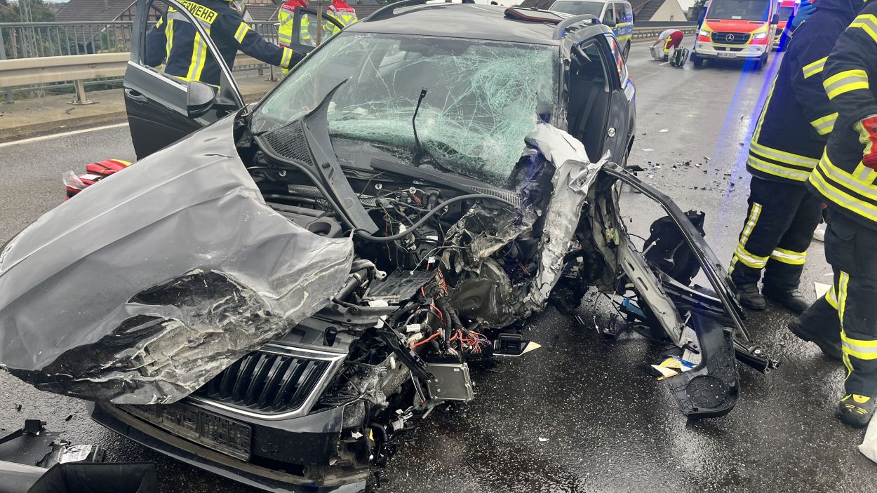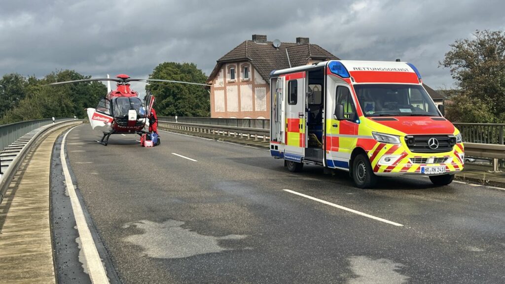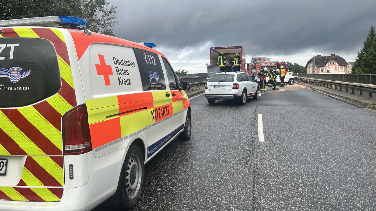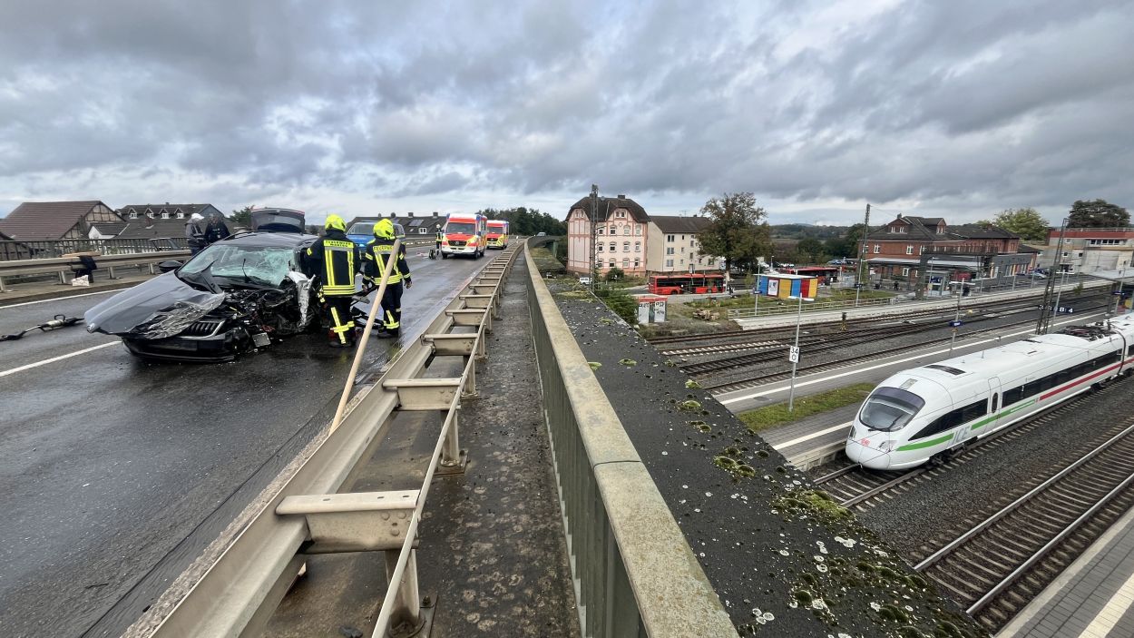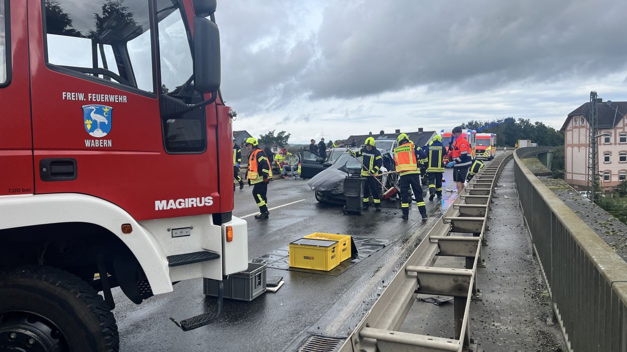 Ein 55-jähriger Mann war zunächst mit seinem Skoda auf der Bundesstraße 254 aus Richtung Homberg in Richtung Niedermöllrich unterwegs. Aus bislang ungeklärten Umständen kam es zunächst auf der Brücke, die den Bahnhof Wabern überführt, zu einer seitlichen Kollision mit einem entgegenkommenden Cupra. Nach dem Zusammenprall kollidierte der 55 Jährige im Verlauf frontal mit einem entgegenkommenden Jeep. Dadurch drehte sich der Skoda um 180 Grad. Der Fahrer eines aus Richtung Niedermöllrich kommenden Mercedes hatte kaum eine Chance zu bremsen und krachte in das Heck des Skoda. Durch die Mehrfachkollisionen zog sich der 55-jährige schwere Verletzungen zu. Der Mann wurde im Fußraum eingeklemmt und musste nach Rücksprache mit dem Rettungsdienst zügig von der Feuerwehr Wabern mit hydraulischen Geräten aus seinem Fahrzeug befreit werden. Nach seiner notärztlichen Versorgung wurde der Mann durch die Besatzung des Rettungshubschrauber Christoph 44 in ein Krankenhaus nach Kassel geflogen. Insgesamt wurden bei dem Unfall drei Personen leicht und eine Person schwer Verletzt. Drei der vier Fahrzeuge erlitten einen Totalschaden. Den Gesamtschaden beziffert die Polizei auf 80.000 Euro. Neben zwei Streifenwagenbesatzungen der Polizei waren zwei Rettungswagen, ein Notarzt aus Fritzlar, der Rettungshubschrauber Christoph 44 aus Göttingen, ein Helfer-vor-Ort der Malteser, sowie die Feuerwehren Wabern mit insgesamt 30 Einsatzkräften vor Ort im Einsatz. Die Bundesstraße 254 war für rund eineinhalb Stunden für den Verkehr voll gesperrt. (mpu)
