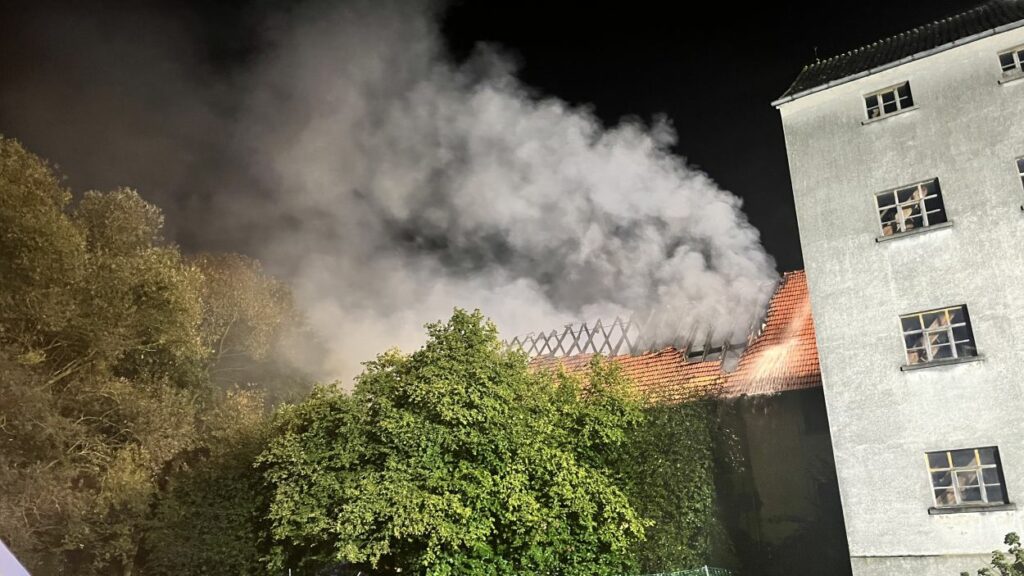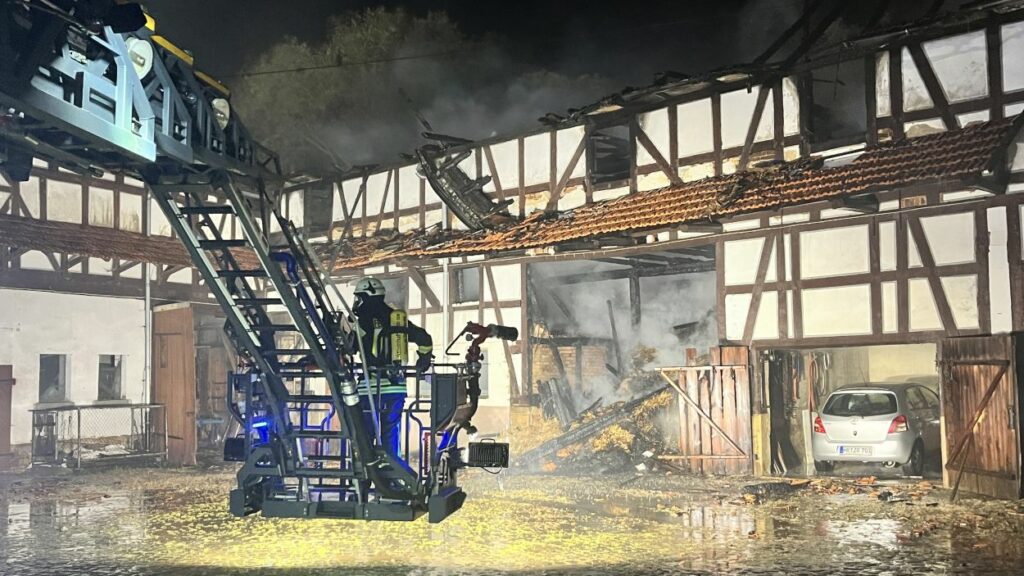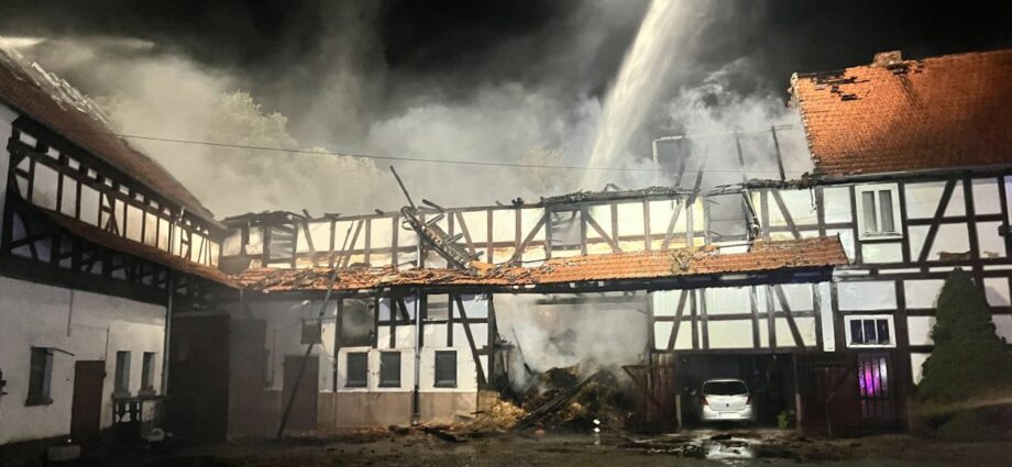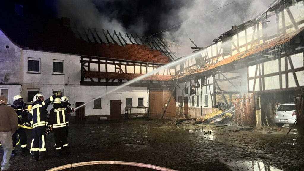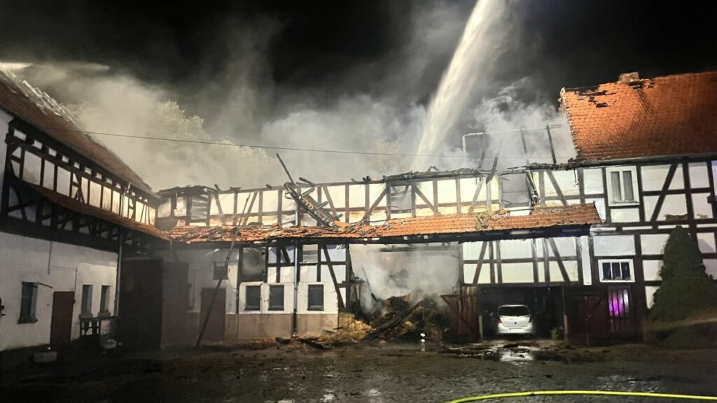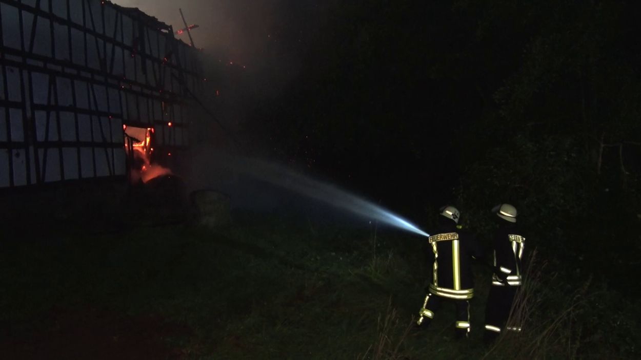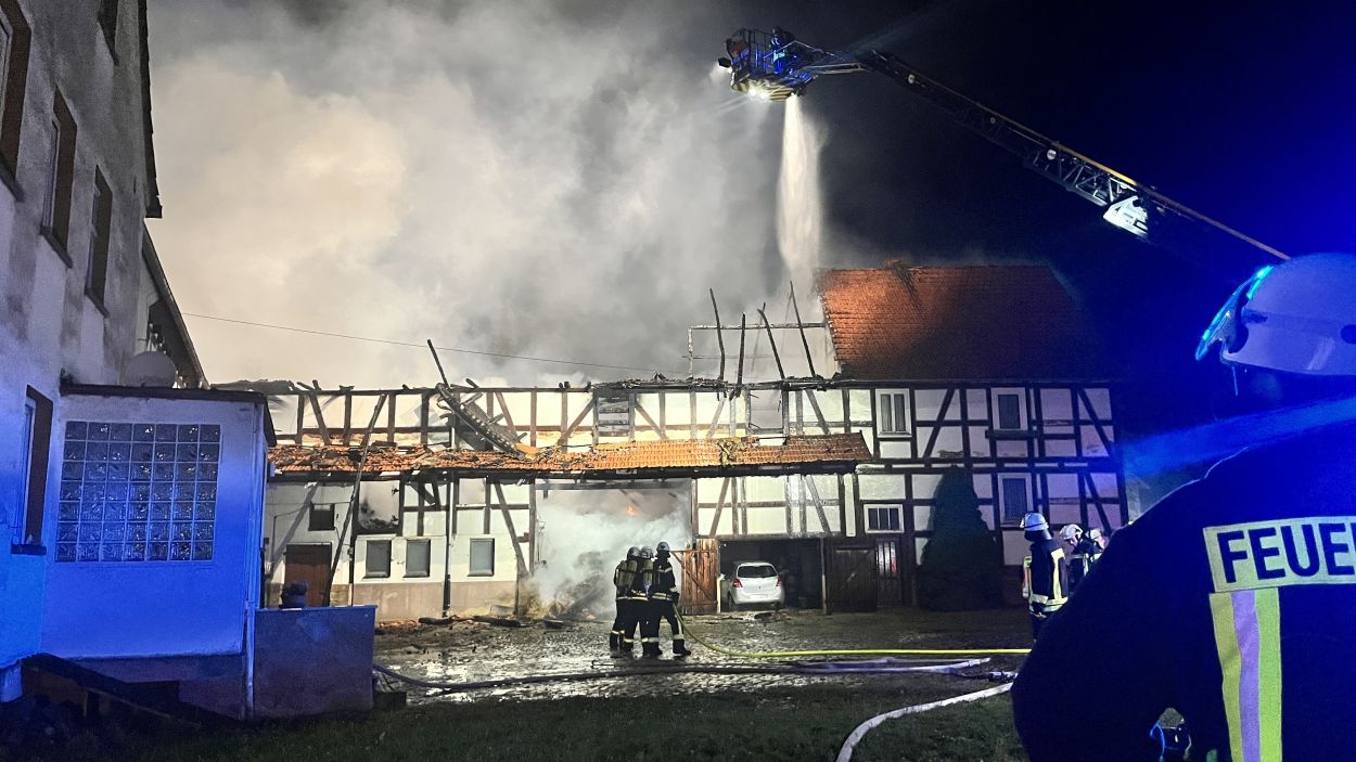 Bereits auf der Anfahrt zur Einsatzstelle konnten die Brandschützer den durch Flammen erleuchteten Himmel und den dichten Rauch wahrnehmen. Bei der Ankunft an der Einsatzstelle stand der Scheunenkomplex der alten Mühle bereits lichterloh in Vollbrand. Der Feuerwehr gelang es ein angrenzendes und zum Teil bewohntes Gebäude vor dem Feuer zu schützen. Der einzige Bewohner der Mühle wurde zuvor durch Nachbarn auf den Brand aufmerksam gemacht und umgehend evakuiert. Ob der Wohntrakt weiterhin bewohnbar ist, oder ob dieser ebenfalls in Mitleidenschaft gezogen wurde, konnte vor Ort nicht geklärt werden. Die Scheune ist hingegen vollständig abgebrannt und Teile davon eingestürzt. Darin gelagerte Maschinen und Strohballen konnten nicht mehr gerettet werden. Im Einsatz waren die Feuerwehren Neukirchen und Schwalmstadt, ein Rettungswagen sowie die Polizei Schwalmstadt. Neukirchen Bürgermeister Marian Knauf machte sich vor Ort ebenfalls ein Bild der Lage. Der Gesamtschaden liegt im Sechstelligen Bereich. Die Brandursache ist unklar. (mpu)