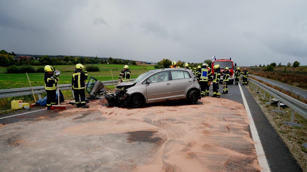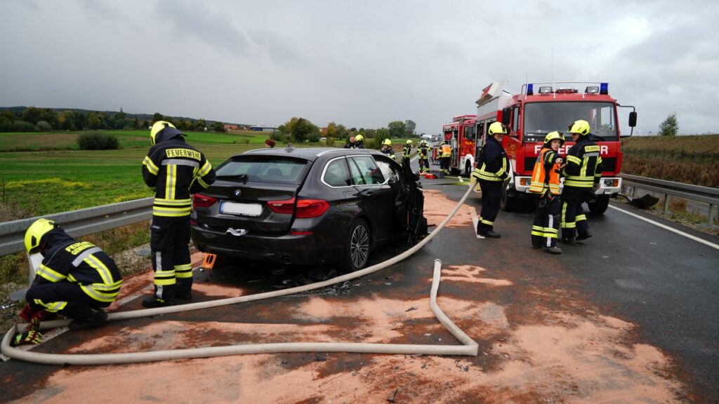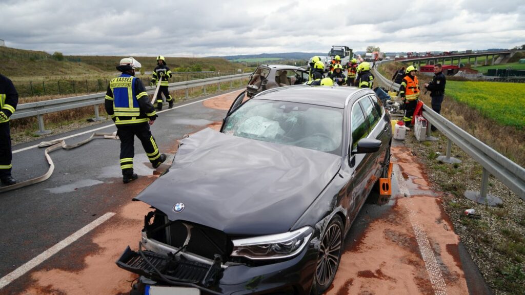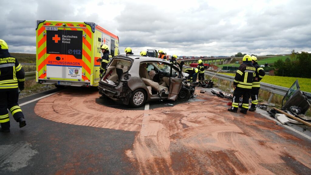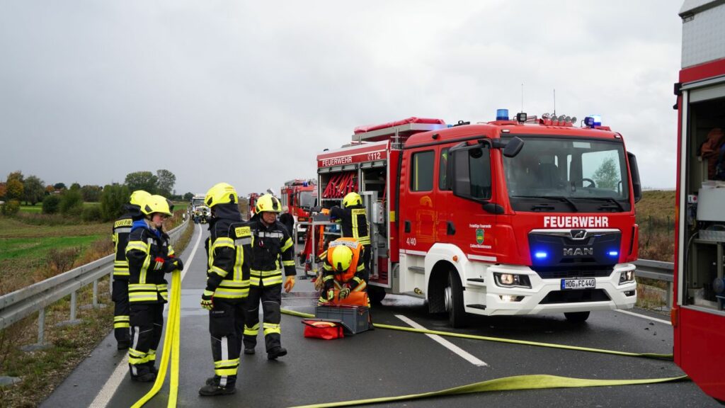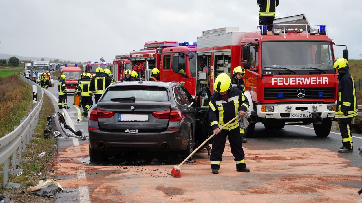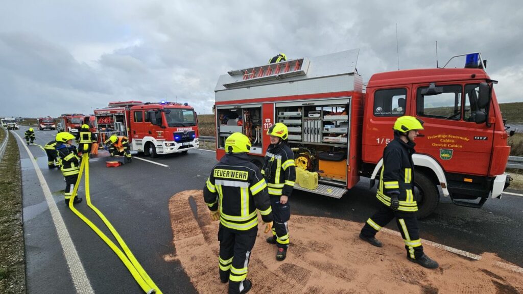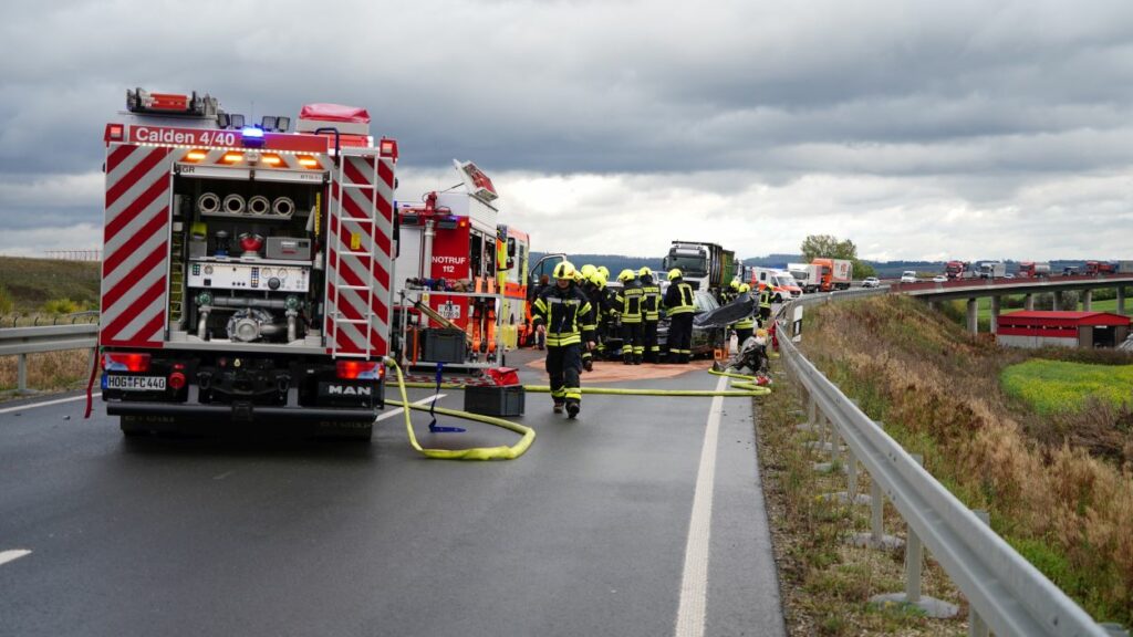 Calden – Auf der neuen Umgehungsstraße B7 von Calden kam es am Donnerstagmittag zu einem schweren Verkehrsunfall. Ein LKW sowie ein 54-jähriger Fahrer eines BMW befuhren gegen 12 Uhr die B7 von Kassel in Fahrtrichtung Warburg. Auf der Umgehungsstraße in Höhe Calden wollte der 54-Jährige den LKW überholen und übersah dann ein entgegen kommendes Fahrzeug was mit zwei Personen besetzt war. Bei dem Frontalzusammenstoß wurde der VW auch gegen den LKW geschleudert, der zuvor vom BMW überholt wurde. Der 54-Jährige sowie der 89-jährige Fahrer vom VW wurden schwer verletzt. Die 88-jährige Beifahrerin vom VW wurde im Fahrzeug eingeschlossen und musste von der Feuerwehr befreit werden. Alle drei Verletzten kamen mit dem Rettungswagen in ein Krankenhaus. Lebensgefahr wird derzeit ausgeschlossen. Der LKW-Fahrer blieb unverletzt und konnte nach der Unfallaufnahme die Unfallstelle wieder verlassen. Neben der Feuerwehr Calden, Polizei und vier Rettungswagen war auch der Rettungshubschrauber Christoph 7 im Einsatz. Die B7 war rund drei Stunden voll gesperrt.