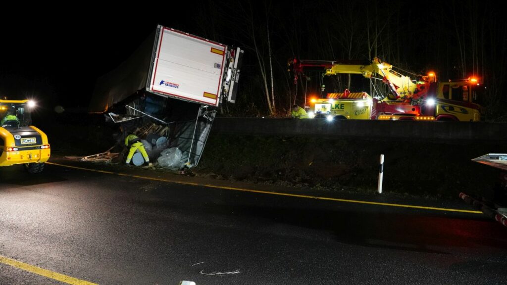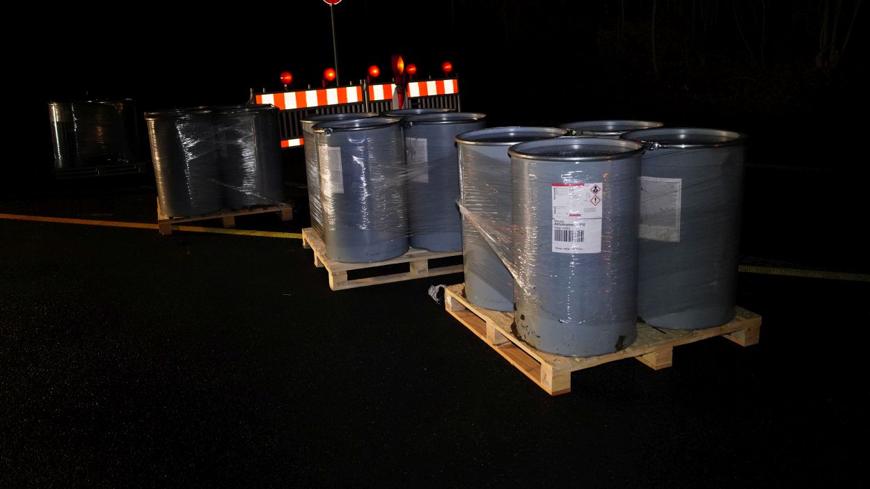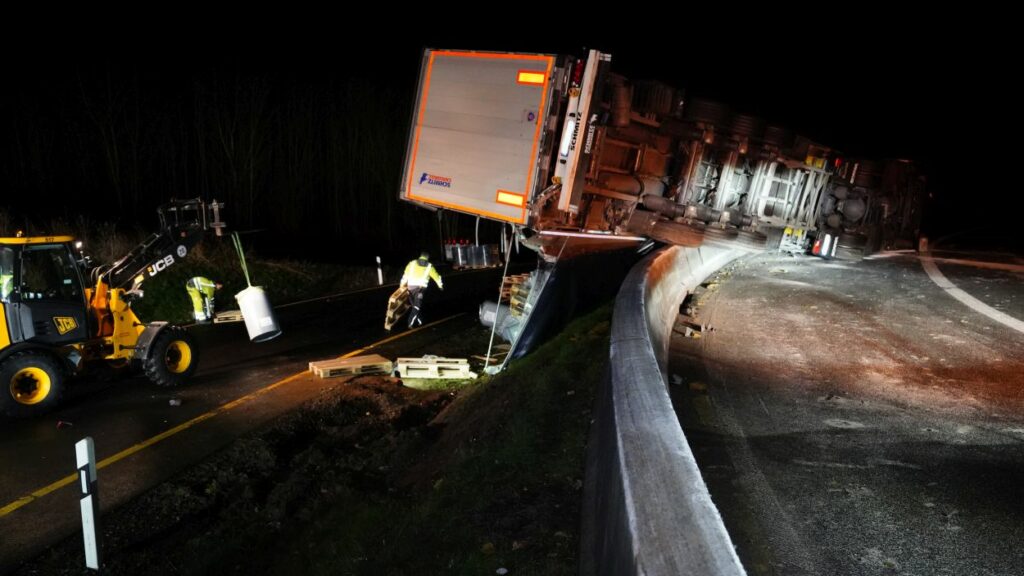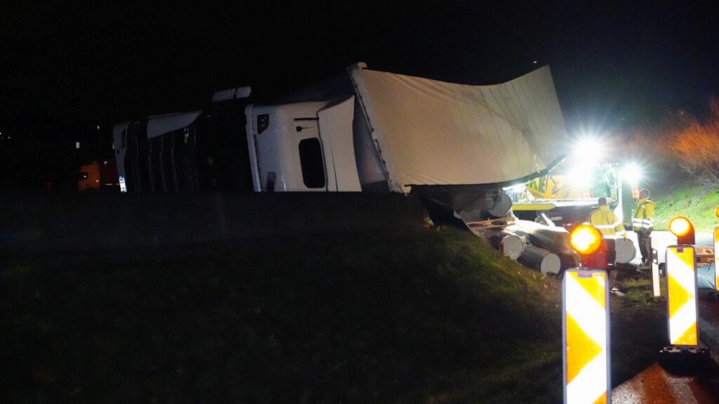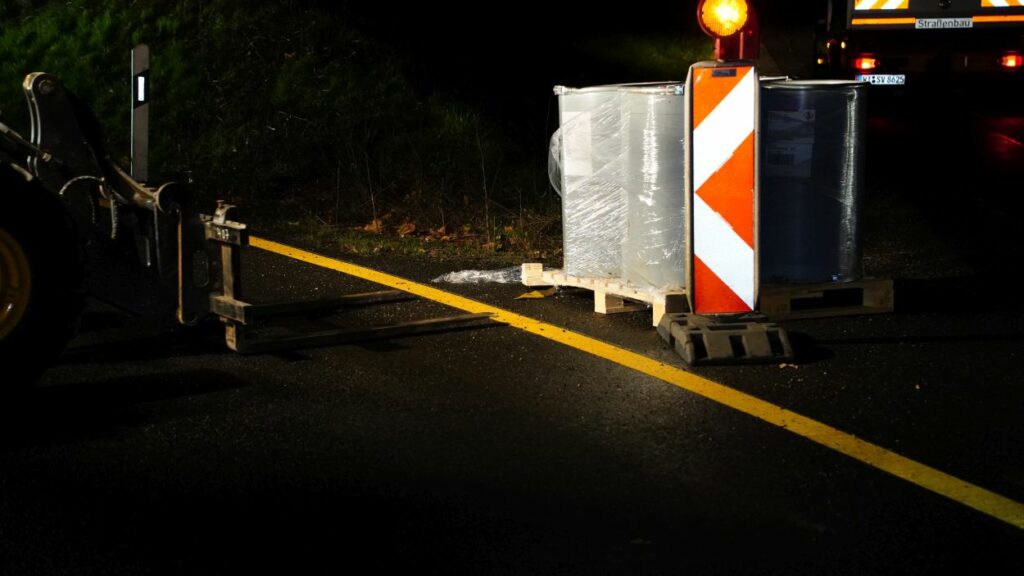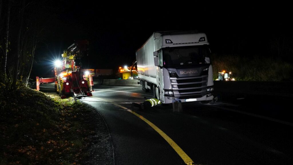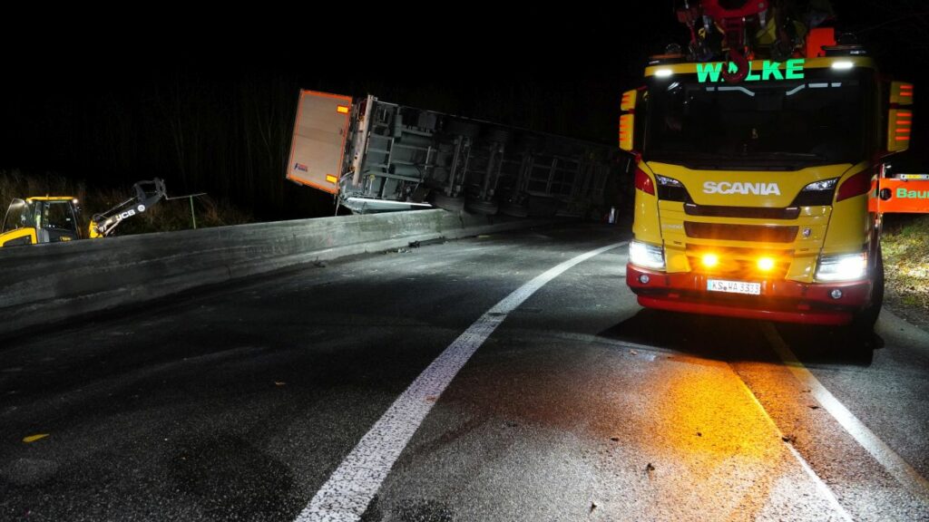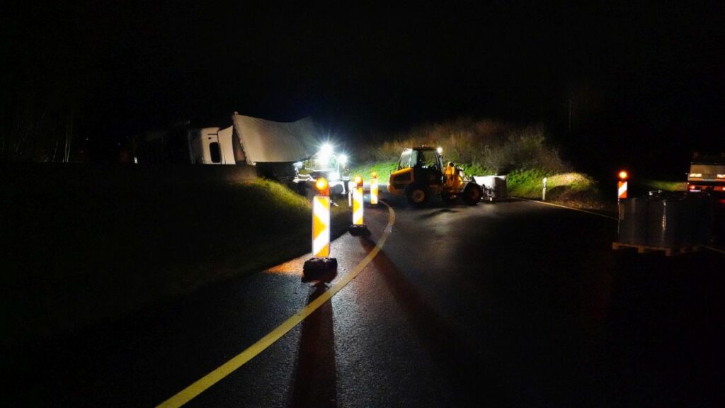 Kassel – Erneut kam es in der Nacht auf Donnerstag zu einem LKW-Unfall am Kasseler Westkreuz. Der Fahrer eines Sattelzuges befuhr gegen 20 Uhr die A44 von Dortmund kommen in Fahrtrichtung Kassel. Am Westkreuz wollte er dann von der A44 auf die A49. Vermutlich aufgrund nicht angepasste Geschwindigkeit kippte er in der Kurve auf die Fahrerseite um. Der mit rund 100 Fässern Schmelzklebstoff beladene Anhänger kippte teilweise über die Betonleitplanke und entlud sich. Der Fahrer blieb unverletzt. Die Bergungsarbeiten waren sehr aufwendig und zogen sich bis in die Morgenstunden. Die Auffahrt A44 auf die A49 in Fahrtrichtung Kassel sowie A49 auf die A44 in Fahrtrichtung Dortmund war für mehrere Stunden voll gesperrt.