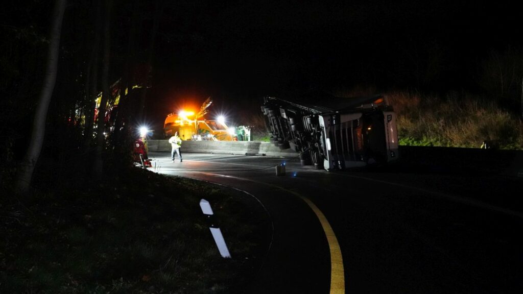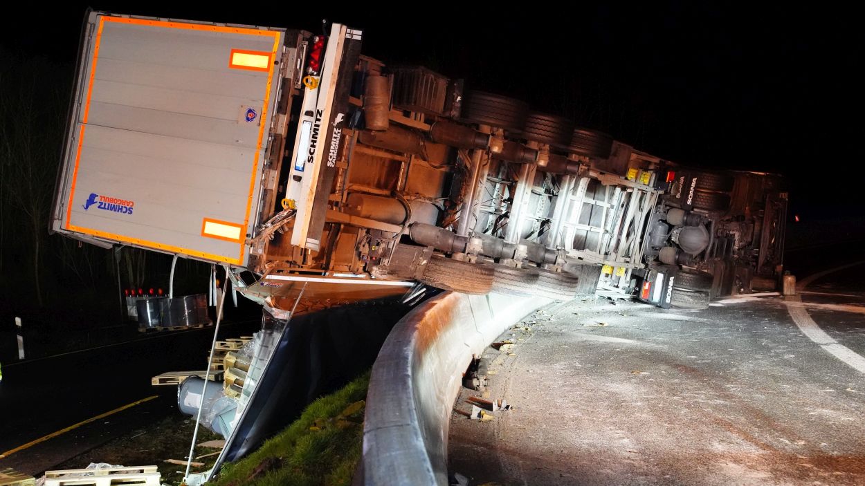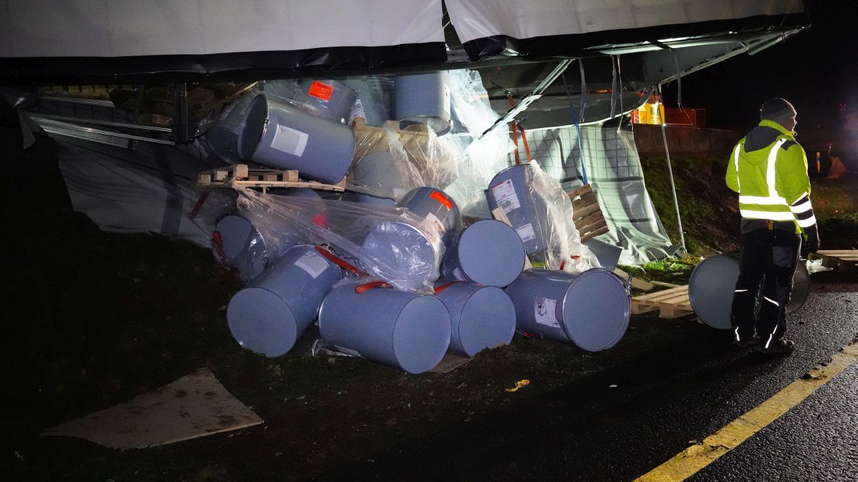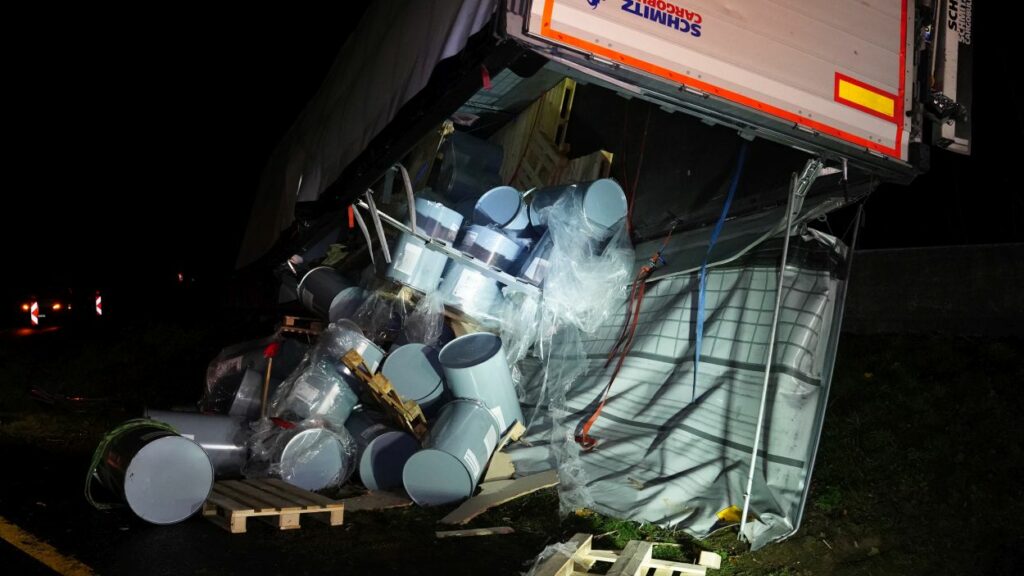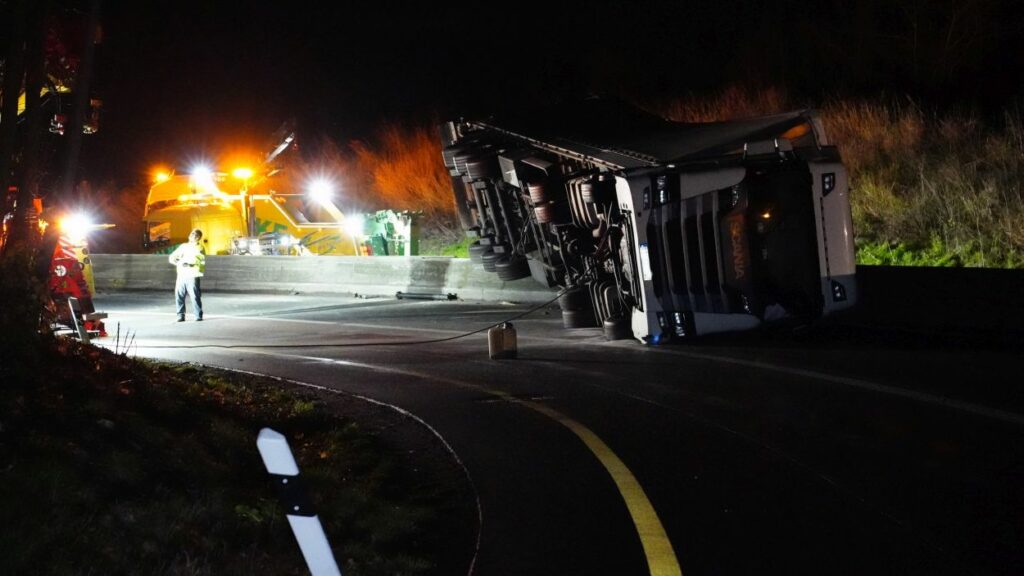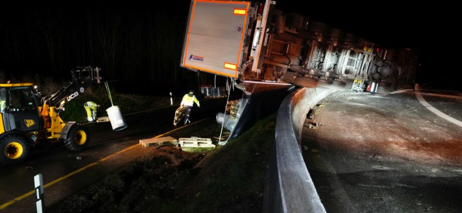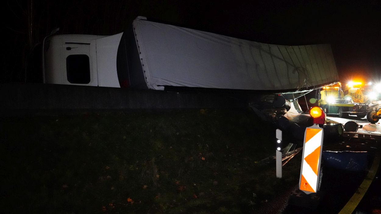 Kassel – Erneut kam es in der Nacht auf Donnerstag zu einem LKW-Unfall am Kasseler Westkreuz. Der Fahrer eines Sattelzuges befuhr gegen 20 Uhr die A44 von Dortmund kommen in Fahrtrichtung Kassel. Am Westkreuz wollte er dann von der A44 auf die A49. Vermutlich aufgrund nicht angepasste Geschwindigkeit kippte er in der Kurve auf die Fahrerseite um. Der mit rund 100 Fässern Schmelzklebstoff beladene Anhänger kippte teilweise über die Betonleitplanke und entlud sich. Der Fahrer blieb unverletzt. Die Bergungsarbeiten waren sehr aufwendig und zogen sich bis in die Morgenstunden. Die Auffahrt A44 auf die A49 in Fahrtrichtung Kassel sowie A49 auf die A44 in Fahrtrichtung Dortmund war für mehrere Stunden voll gesperrt.