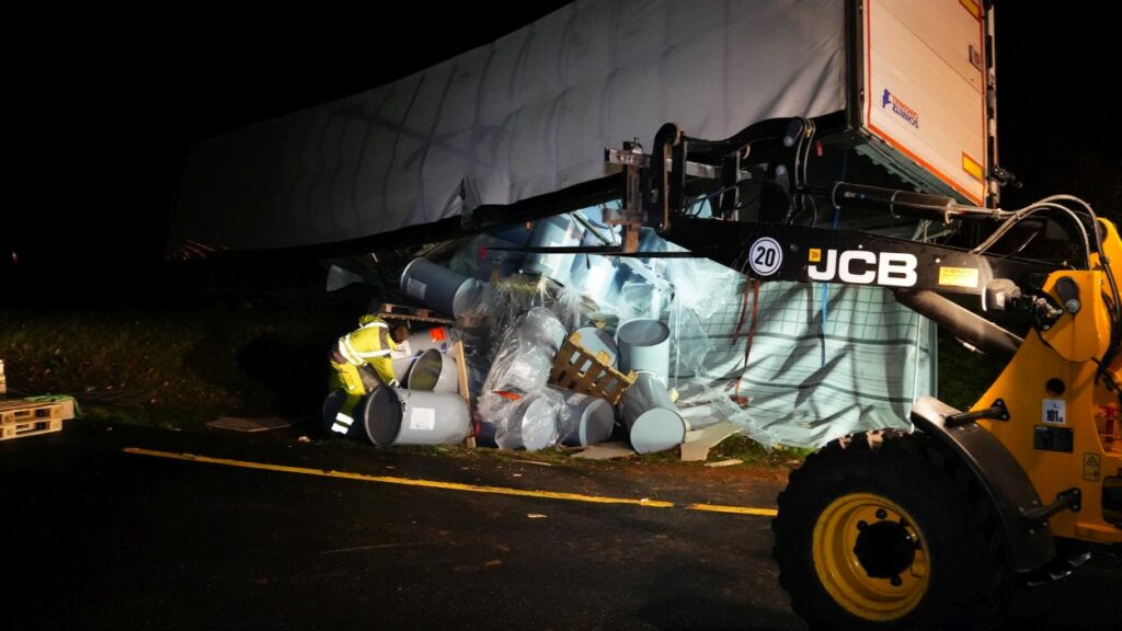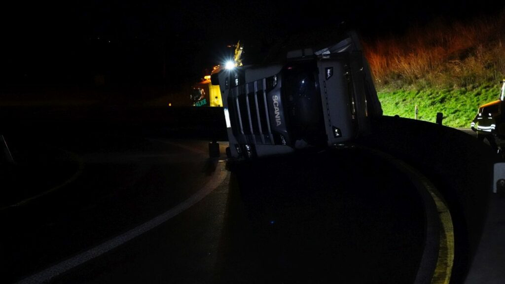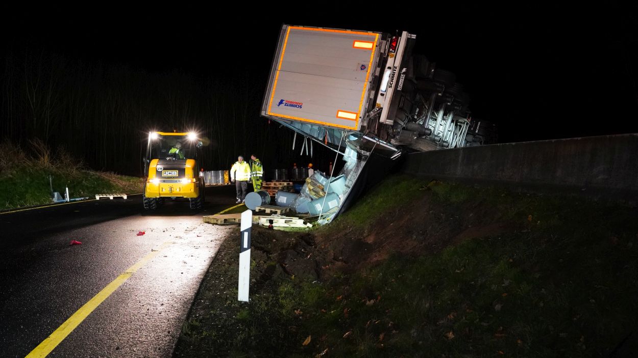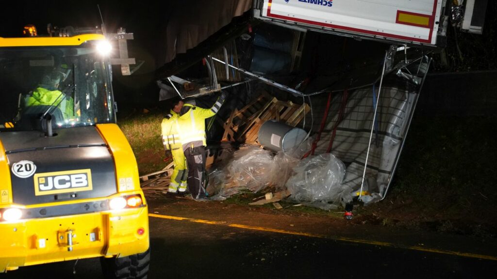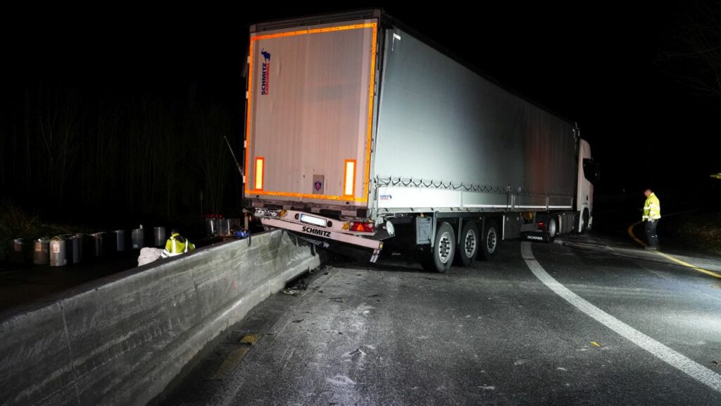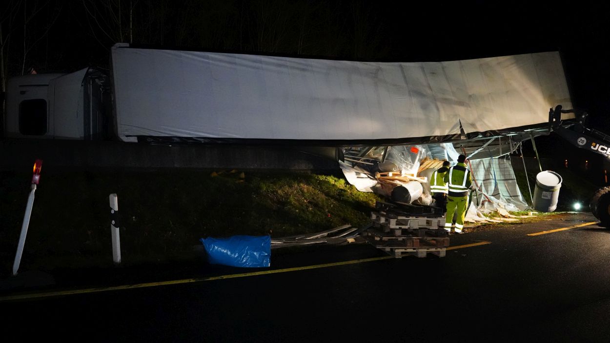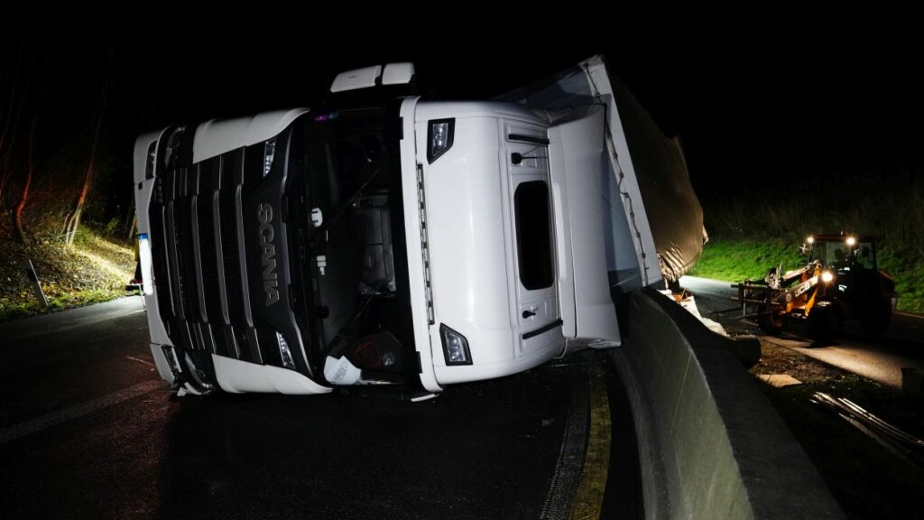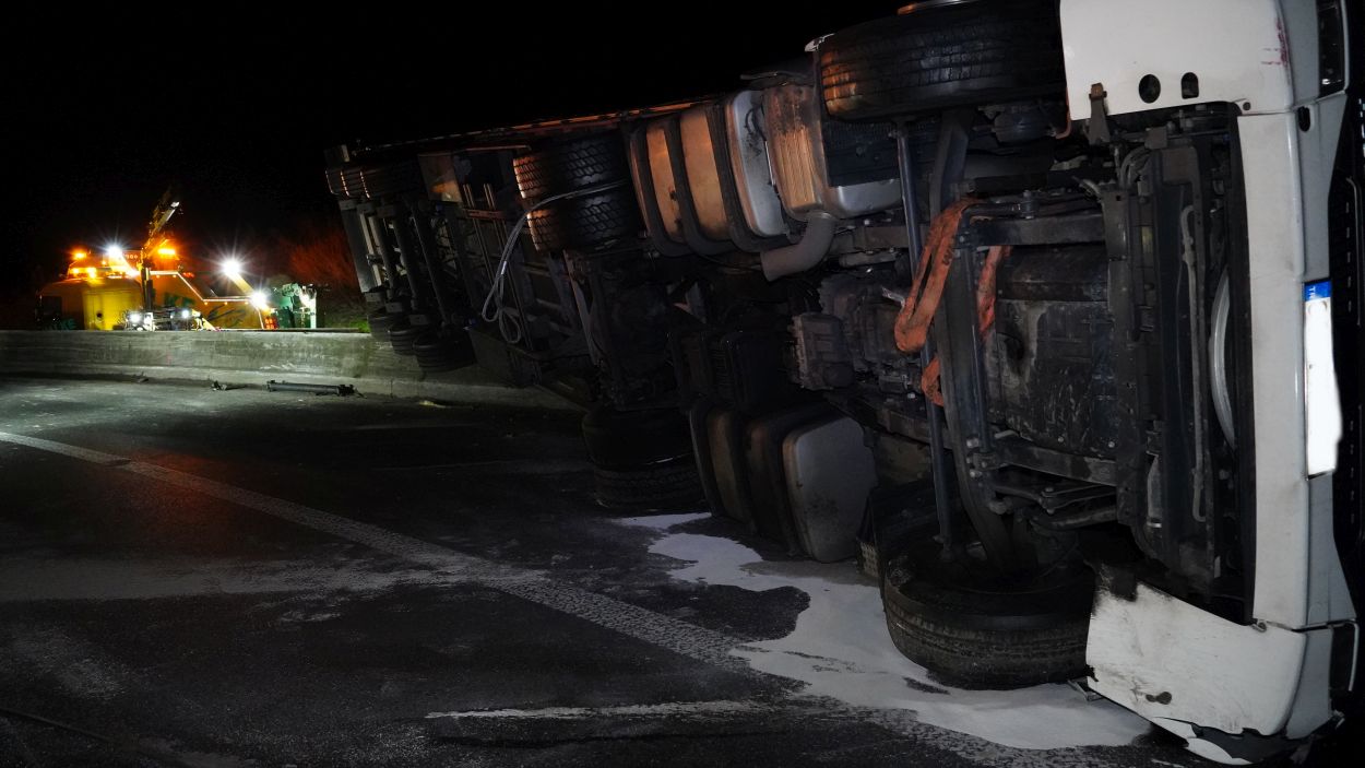 Kassel – Erneut kam es in der Nacht auf Donnerstag zu einem LKW-Unfall am Kasseler Westkreuz. Der Fahrer eines Sattelzuges befuhr gegen 20 Uhr die A44 von Dortmund kommen in Fahrtrichtung Kassel. Am Westkreuz wollte er dann von der A44 auf die A49. Vermutlich aufgrund nicht angepasste Geschwindigkeit kippte er in der Kurve auf die Fahrerseite um. Der mit rund 100 Fässern Schmelzklebstoff beladene Anhänger kippte teilweise über die Betonleitplanke und entlud sich. Der Fahrer blieb unverletzt. Die Bergungsarbeiten waren sehr aufwendig und zogen sich bis in die Morgenstunden. Die Auffahrt A44 auf die A49 in Fahrtrichtung Kassel sowie A49 auf die A44 in Fahrtrichtung Dortmund war für mehrere Stunden voll gesperrt.