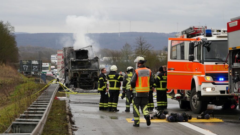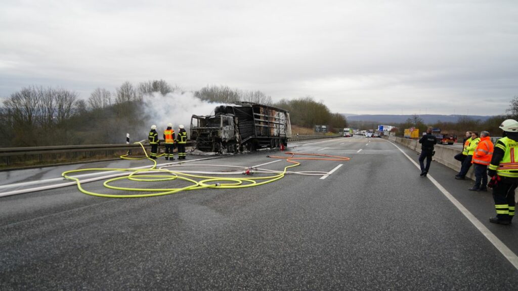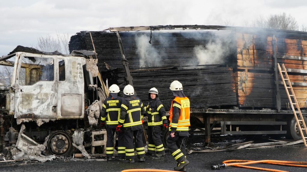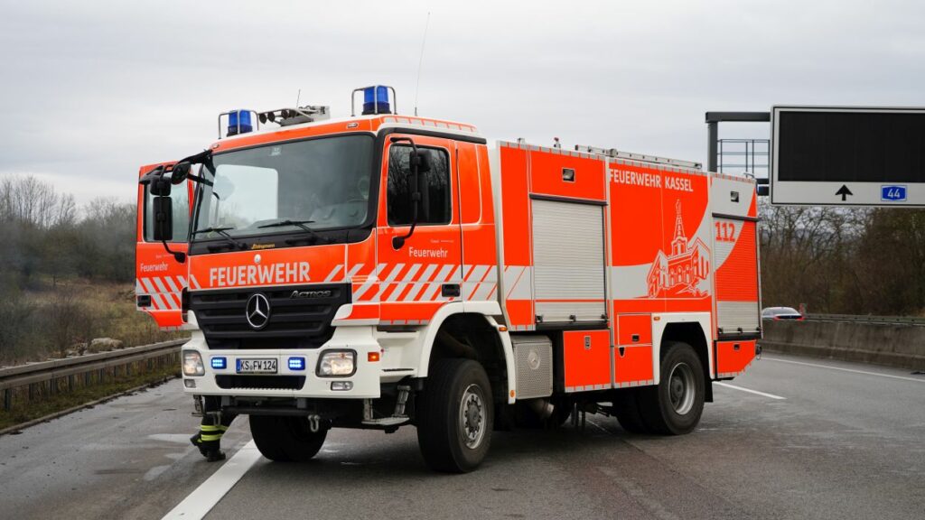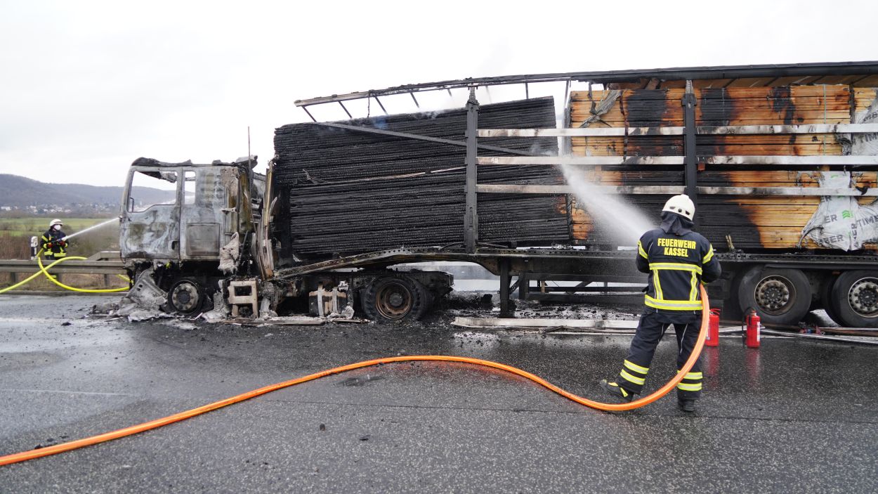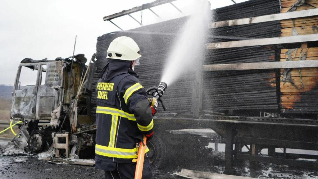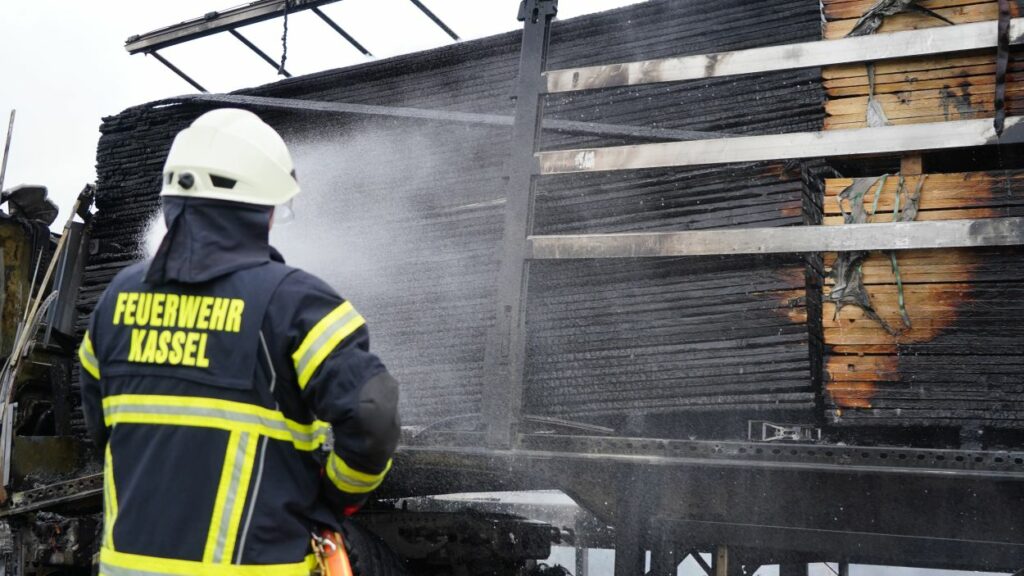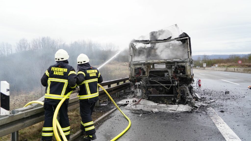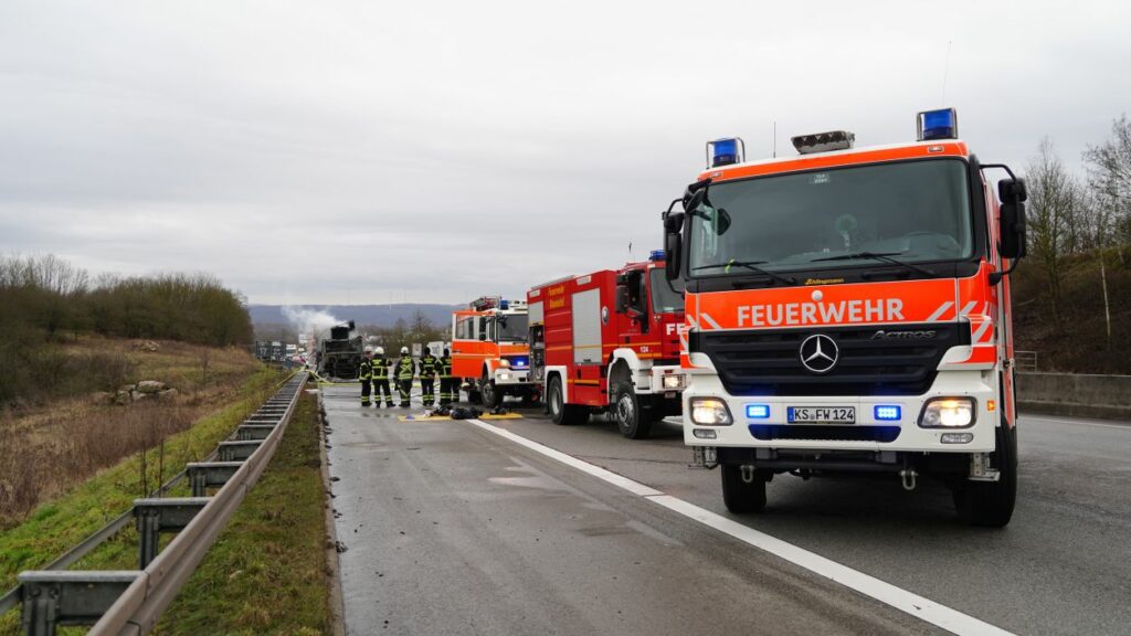 Kassel – Am Donnerstag gegen 12 Uhr brach auf der A44 ein Brand in einem Lkw aus. Zwischen den Anschlussstellen Kassel West und Bad Wilhelmshöhe konnte der Fahrer eines mit Dachlatten beladenen Sattelzug noch rechtzeitig auf den Standstreifen fahren, bevor es Feuer fing. Erste Löschversuche scheiterten. Aufgrund der Baustellensituation am Westkreuz hatte die alarmierte Feuerwehr zunächst Schwierigkeiten, die Einsatzstelle zu erreichen. Als die Einsatzkräfte schließlich eintrafen, brannte die Zugmaschine sowie ein Teil der Ladung bereits lichterloh. Mit Unterstützung von drei Tanklöschfahrzeugen konnte die Wasserversorgung für die Löscharbeiten sichergestellt werden. Um die letzten Glutnester zu erreichen, wurde ein Teleskoplader angefordert, um die Holzlatten abzuladen. Neben der Berufsfeuerwehr Kassel war auch die Feuerwehr Baunatal mit einem Tanklöschfahrzeug im Einsatz. Die A44 in Fahrtrichtung Dortmund blieb für mehrere Stunden voll gesperrt, was zu erheblichen Verkehrsbehinderungen rund um Kassel führte.