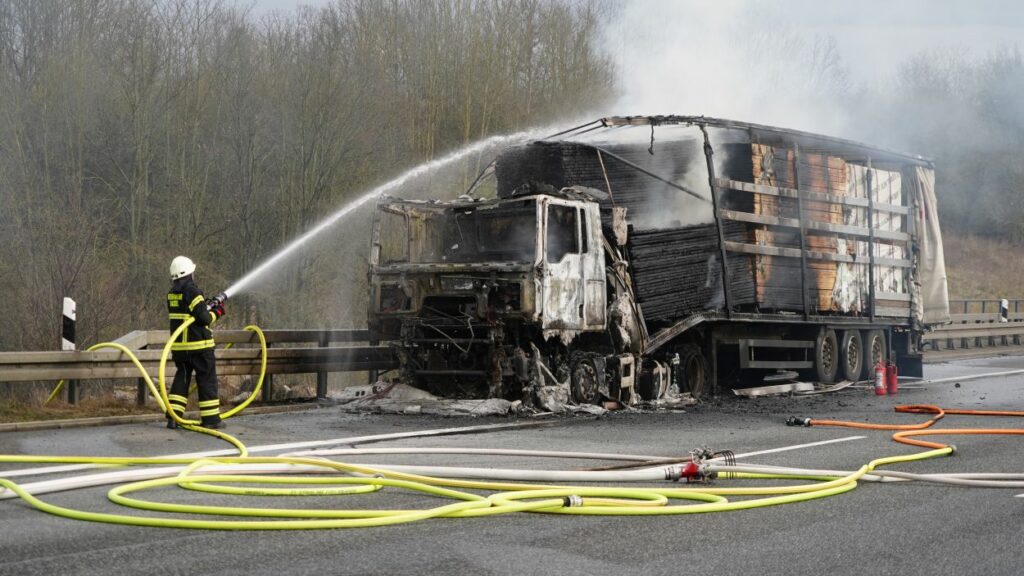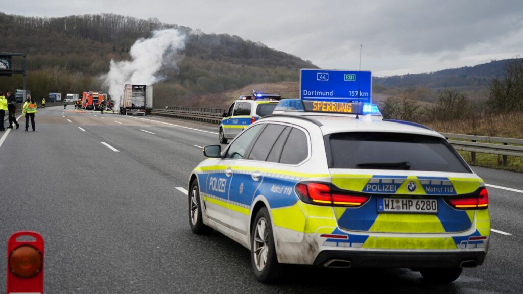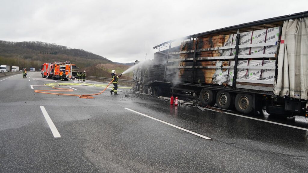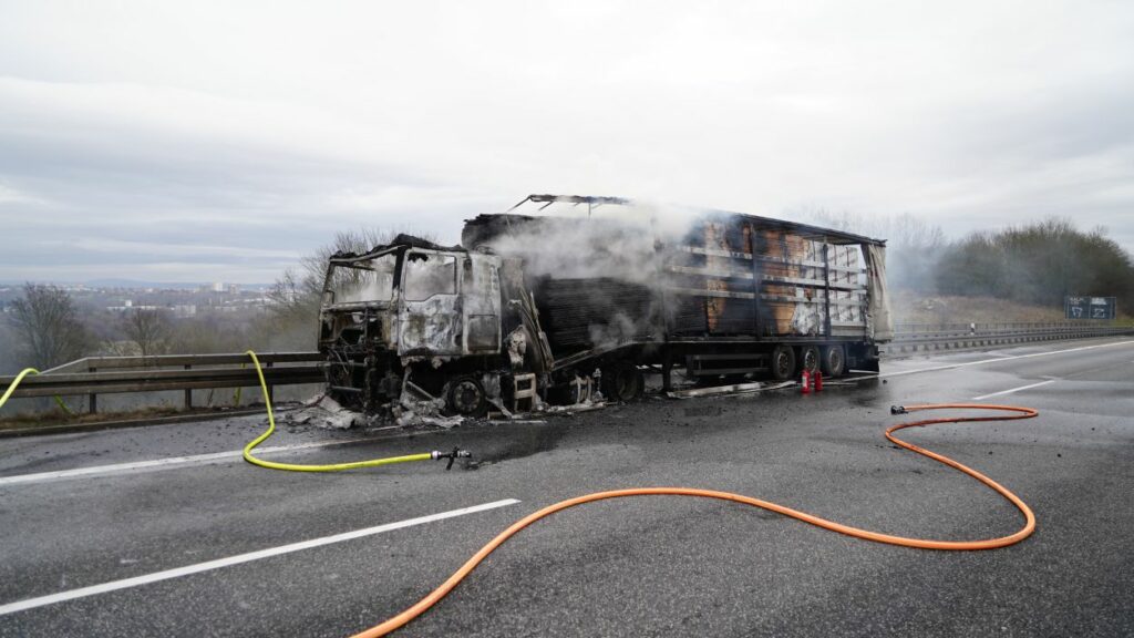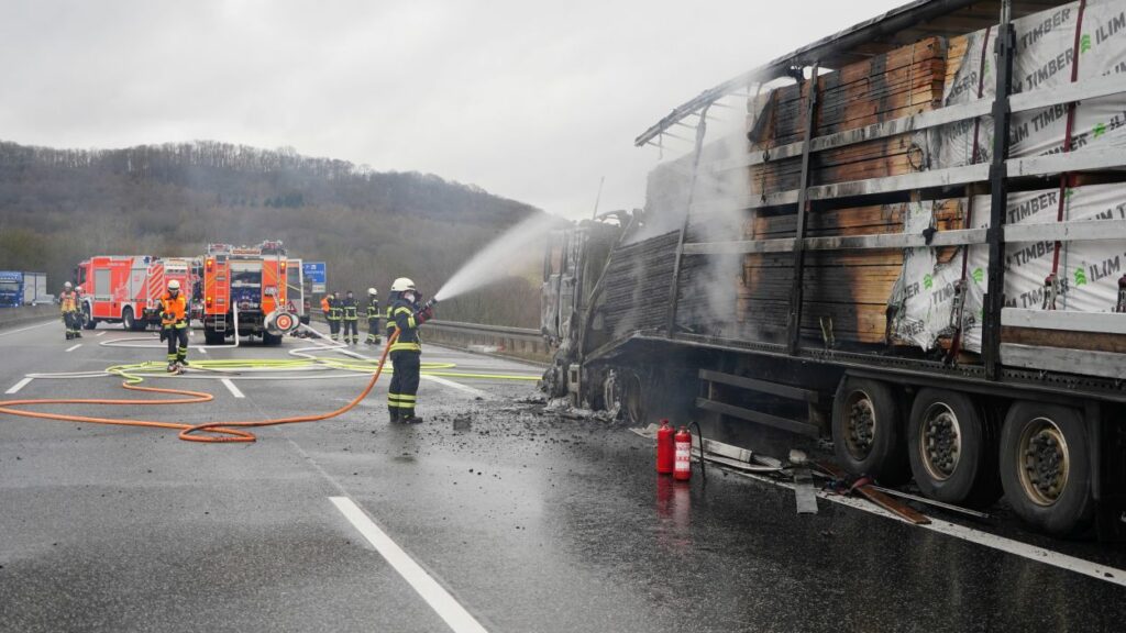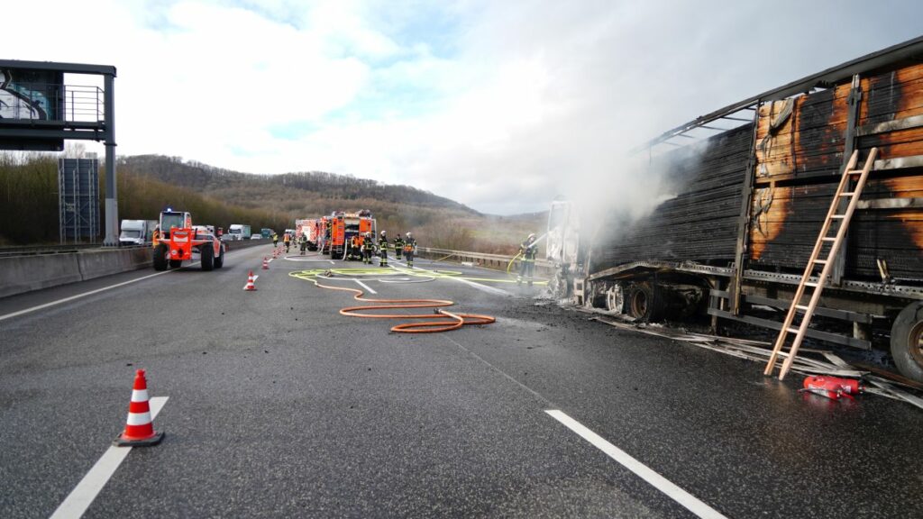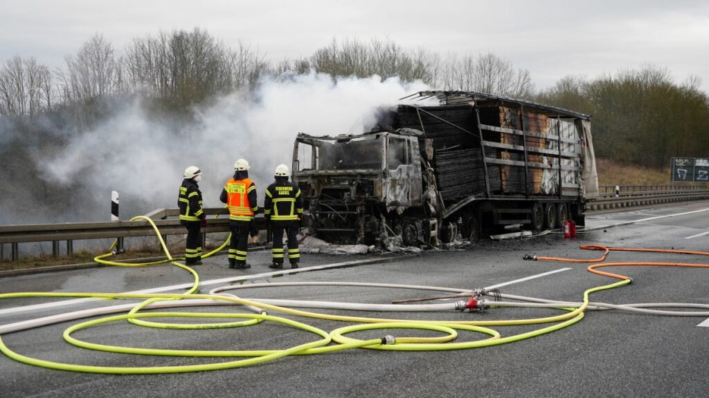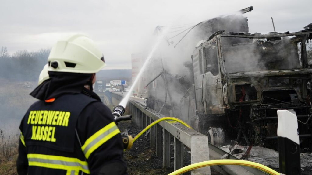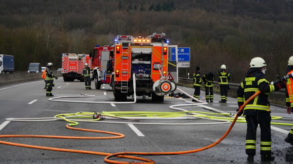 Kassel – Am Donnerstag gegen 12 Uhr brach auf der A44 ein Brand in einem Lkw aus. Zwischen den Anschlussstellen Kassel West und Bad Wilhelmshöhe konnte der Fahrer eines mit Dachlatten beladenen Sattelzug noch rechtzeitig auf den Standstreifen fahren, bevor es Feuer fing. Erste Löschversuche scheiterten. Aufgrund der Baustellensituation am Westkreuz hatte die alarmierte Feuerwehr zunächst Schwierigkeiten, die Einsatzstelle zu erreichen. Als die Einsatzkräfte schließlich eintrafen, brannte die Zugmaschine sowie ein Teil der Ladung bereits lichterloh. Mit Unterstützung von drei Tanklöschfahrzeugen konnte die Wasserversorgung für die Löscharbeiten sichergestellt werden. Um die letzten Glutnester zu erreichen, wurde ein Teleskoplader angefordert, um die Holzlatten abzuladen. Neben der Berufsfeuerwehr Kassel war auch die Feuerwehr Baunatal mit einem Tanklöschfahrzeug im Einsatz. Die A44 in Fahrtrichtung Dortmund blieb für mehrere Stunden voll gesperrt, was zu erheblichen Verkehrsbehinderungen rund um Kassel führte.