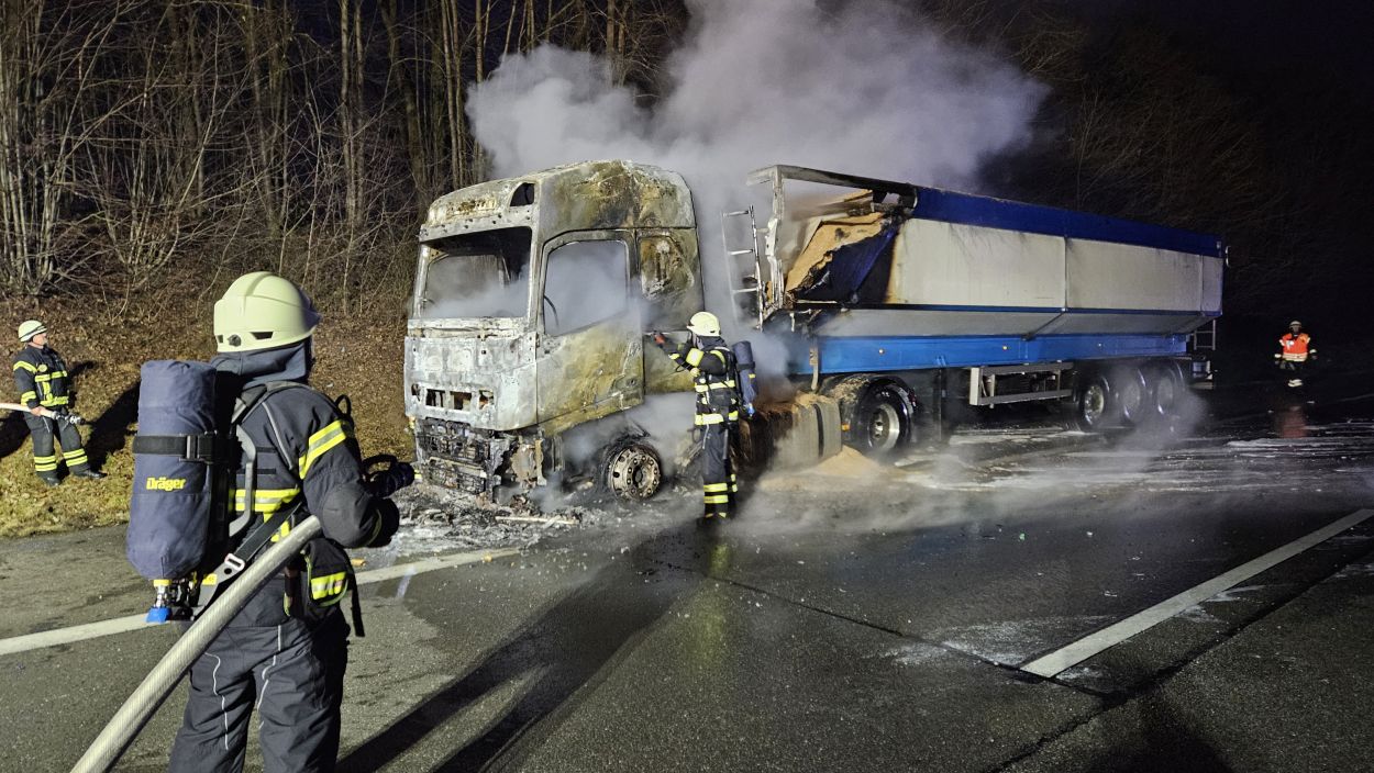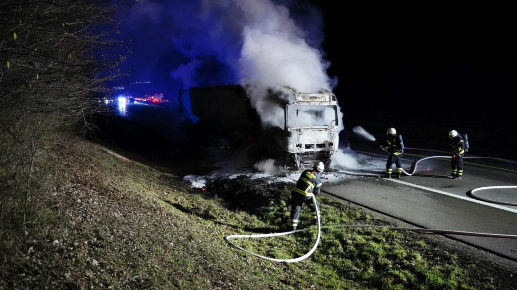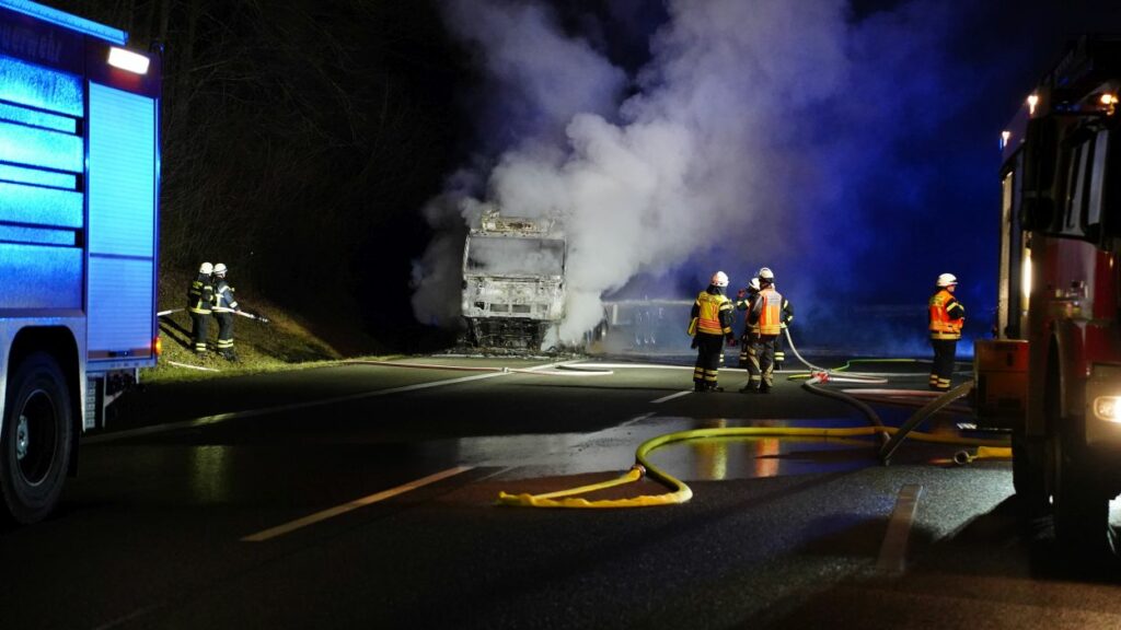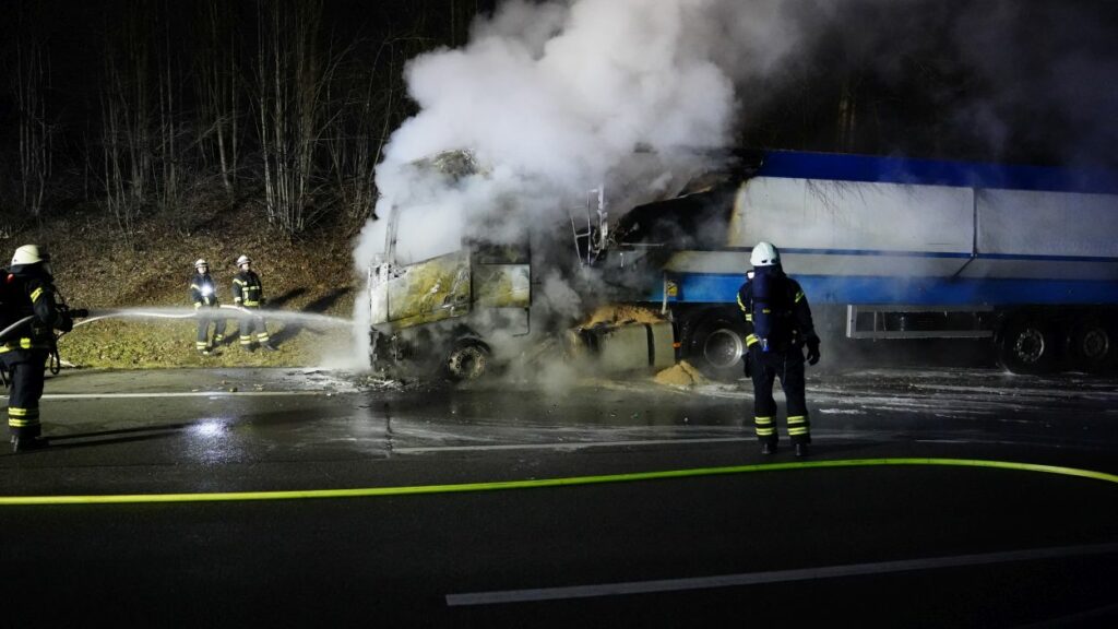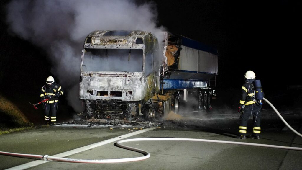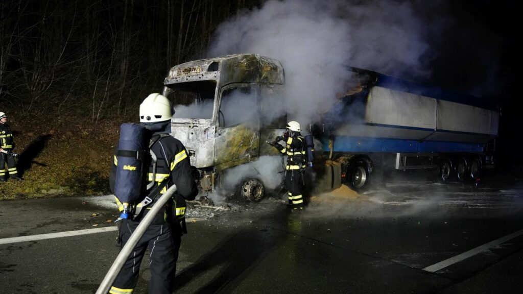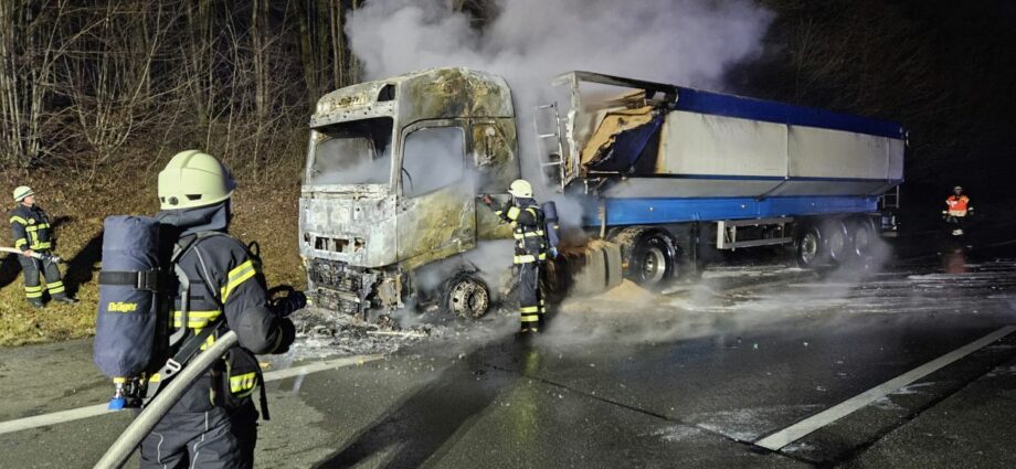 KS: Holzpellets-LKW geriet auf A44 in Brand