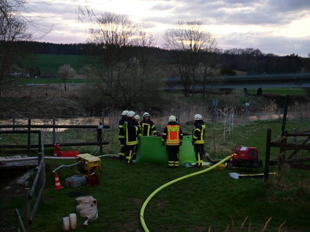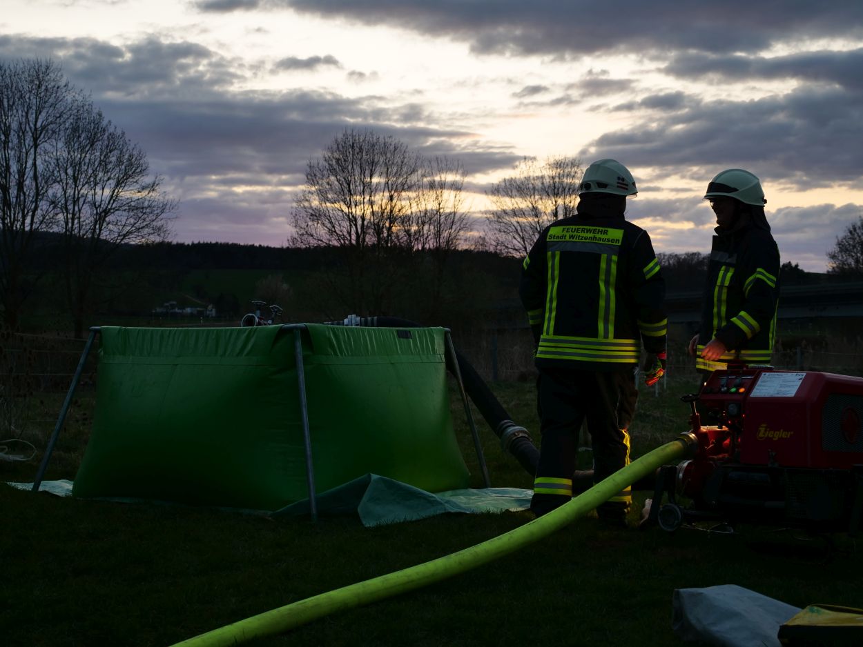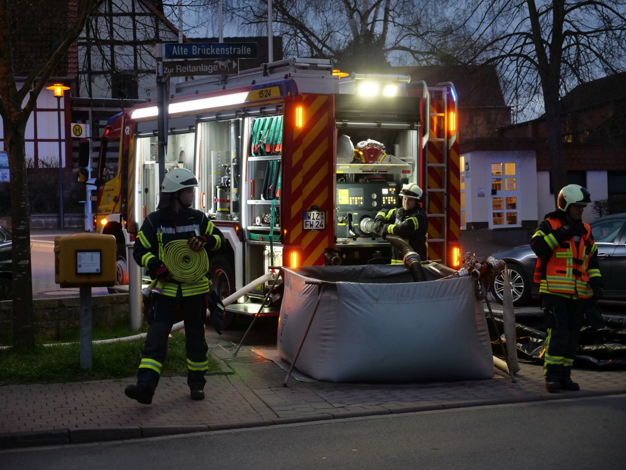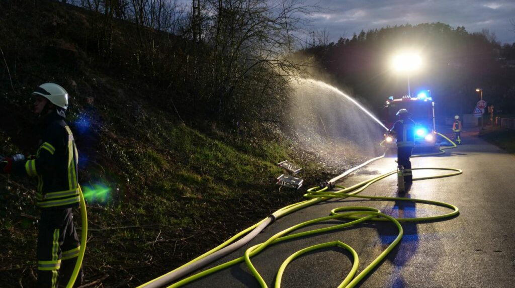 Witzenhausen – Am Dienstagabend stellten sich 70 Feuerwehrkräfte in Gertenbach einer anspruchsvollen Katastrophenschutzübung. Zwei Stunden lang trainierten sie den Ernstfall – von der Brandbekämpfung bis zum Hochwasserschutz. Zunächst wurde Löschwasser per Tauchpumpe aus der Werra entnommen und über 700 Meter zur Einsatzstelle transportiert. Anschließend galt es, zwei Brandherde am Bahndamm trotz schwieriger Geländeverhältnisse effektiv zu löschen. Gleichzeitig errichteten Einsatzkräfte mit Sandsäcken, Paletten und dem neuen Boxwall-System Schutzbarrieren gegen Hochwasser, um Gebäude zu sichern.
