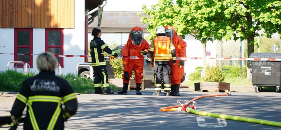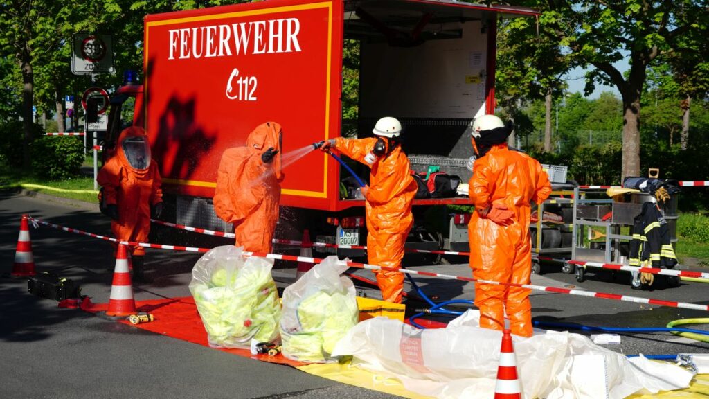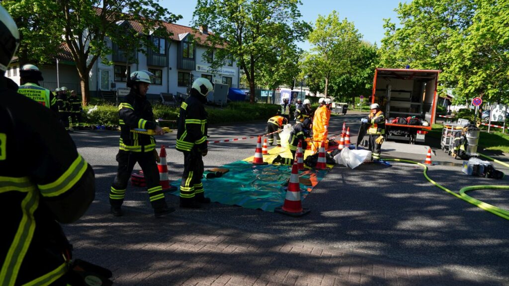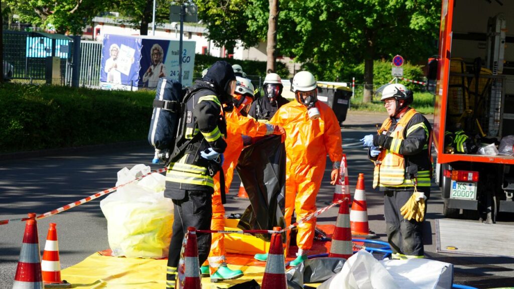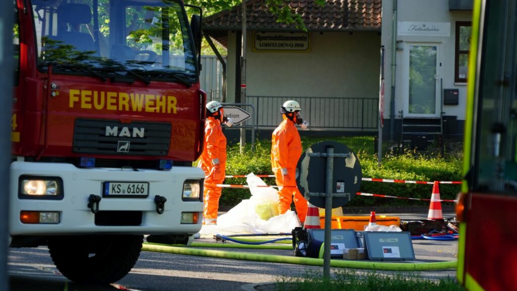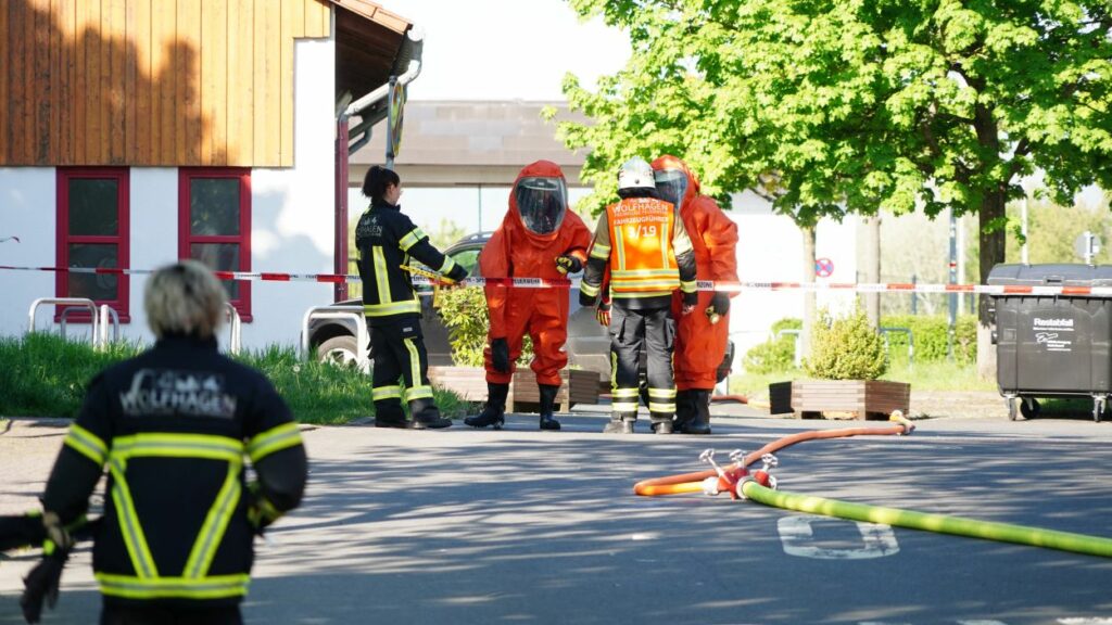 Lohfelden – Am frühen Montagmorgen kam es im Freibad Lohfelden zu einem gefährlichen Chlorgasaustritt. Gegen kurz nach 7 Uhr wurden die Einsatzkräfte alarmiert. Bereits beim Eintreffen der Feuerwehr war das austretende Chlorgas deutlich bis zur nahegelegenen Hauptstraße wahrnehmbar. Ein Trupp unter Chemikalienschutzanzügen (CSA) wurde zur Lageerkundung in das Gebäude geschickt. Im Technikraum konnte eine undichte Chlorgasflasche als Ursache ausgemacht werden. Diese war vermutlich durch einen technischen Defekt beschädigt worden, konnte jedoch zügig abgedreht werden. Im Außenbereich gelang es den Einsatzkräften, die ausgetretene Chlorgaswolke mittels eines Wassernebels zu binden.