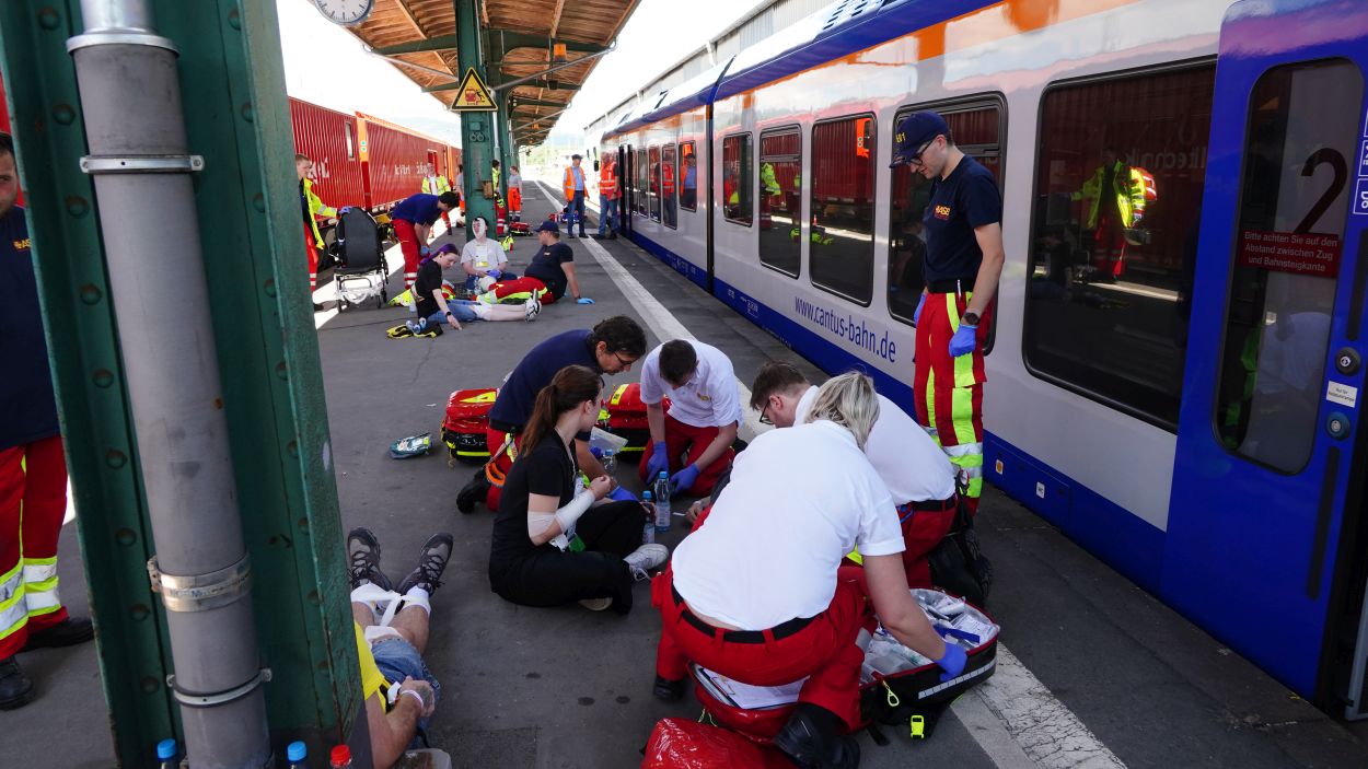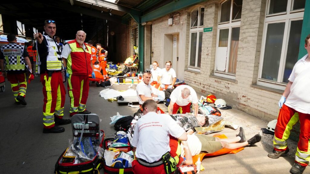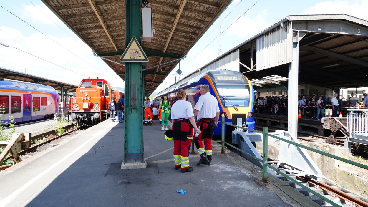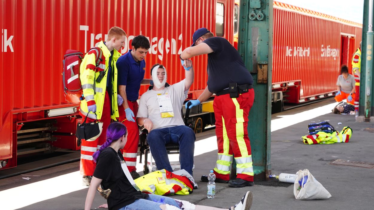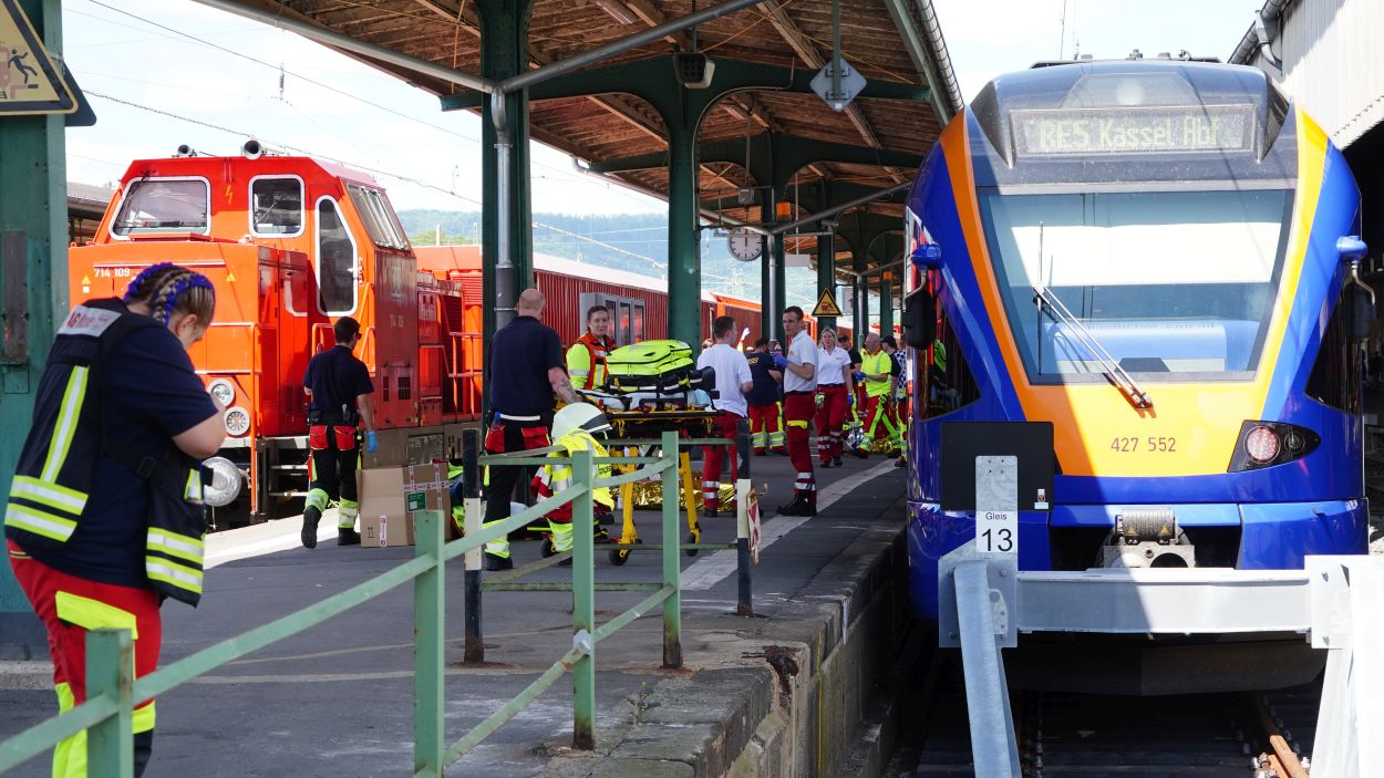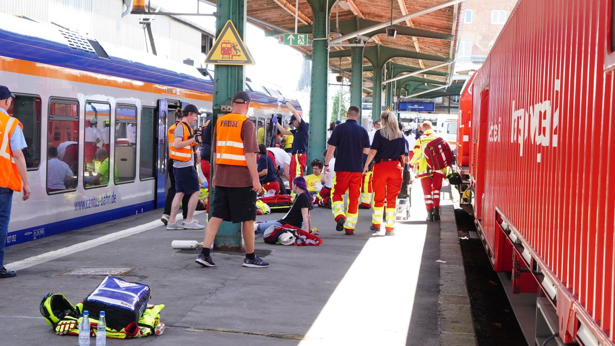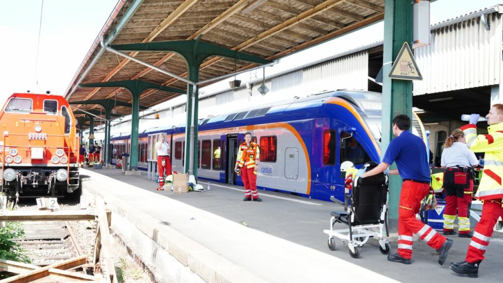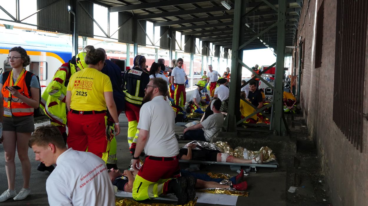 Kassel – Mit Blaulicht und Sirenen probte der Arbeiter-Samariter-Bund (ASB) am Samstag in Kassel den Ernstfall. Im Zentrum der bundesweiten Katastrophenschutzübung stand ein inszeniertes Zugunglück am Hauptbahnhof: Ein entgleister Regionalzug, viele Verletzte, Chaos auf dem Bahnsteig. Rund 100 Statisten mit täuschend echten Wunden stellten die Einsatzkräfte vor große Herausforderungen. Geübt wurde an einem gesperrten Gleis – der Bahnverkehr lief weiter. Doch das war nur eines von drei Szenarien. Nahe dem Herkules suchten Rettungshunde in einem Waldgebiet nach vermissten Personen nach einem angenommenen Ballonabsturz. Auf der Fulda wurde der Einsatz nach einem gekenterten Boot mit mehreren Verletzten im Wasser geübt. Insgesamt beteiligten sich rund 900 Personen an der Übung, darunter 650 Einsatzkräfte mit 250 Fahrzeugen aus dem gesamten Bundesgebiet und dem europäischen Ausland.