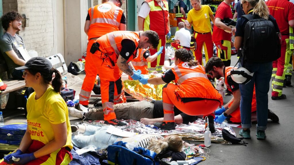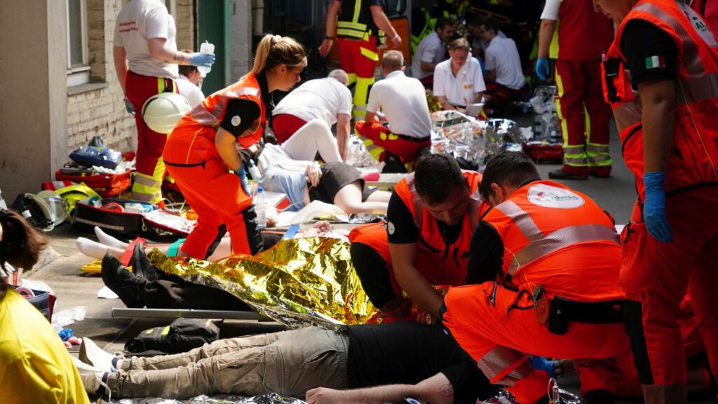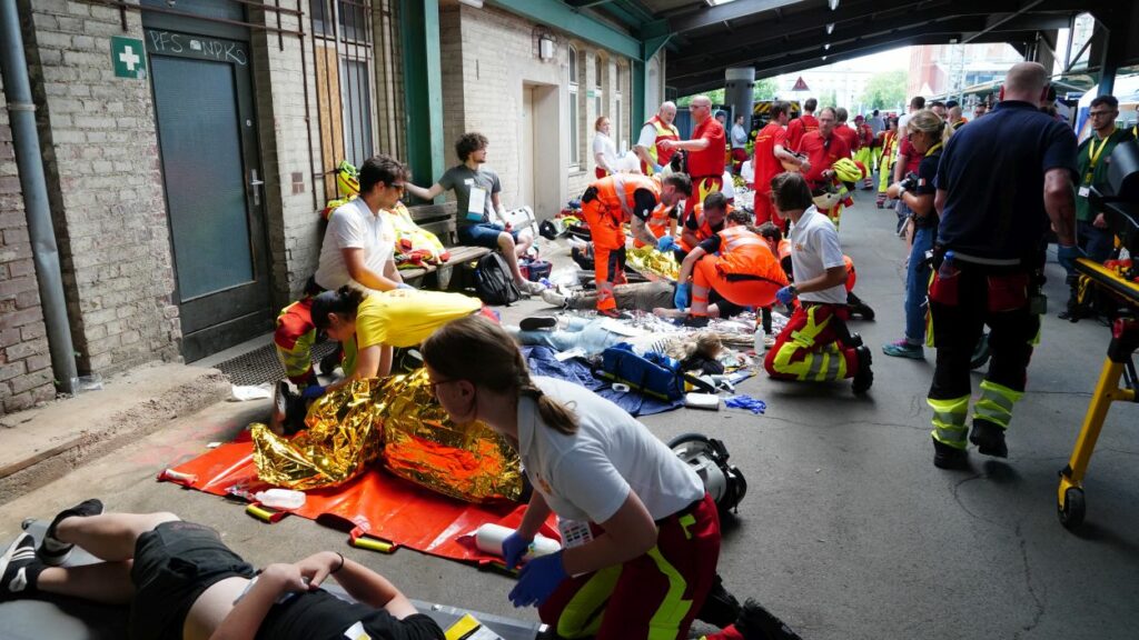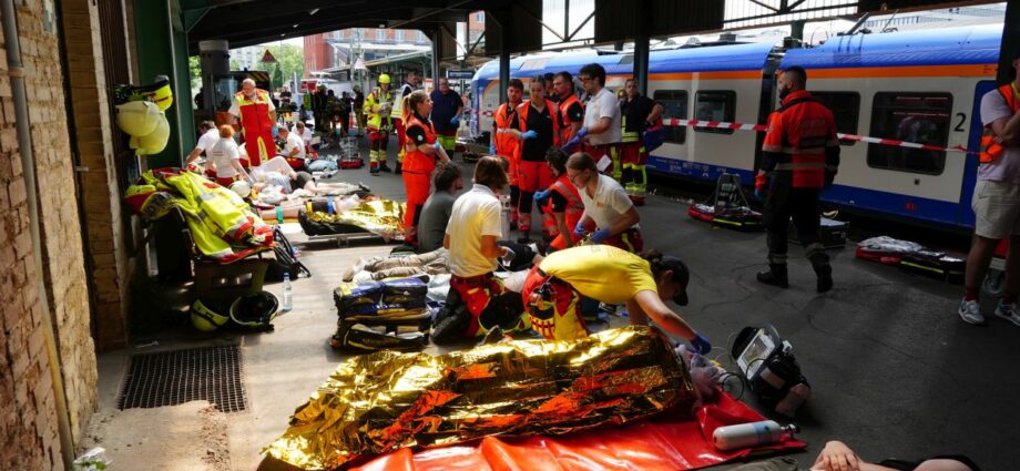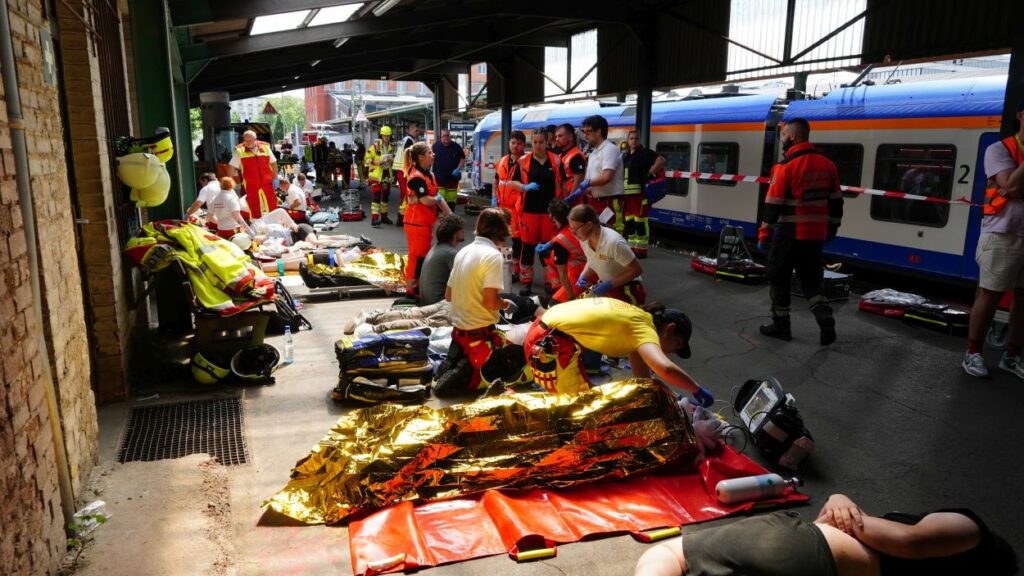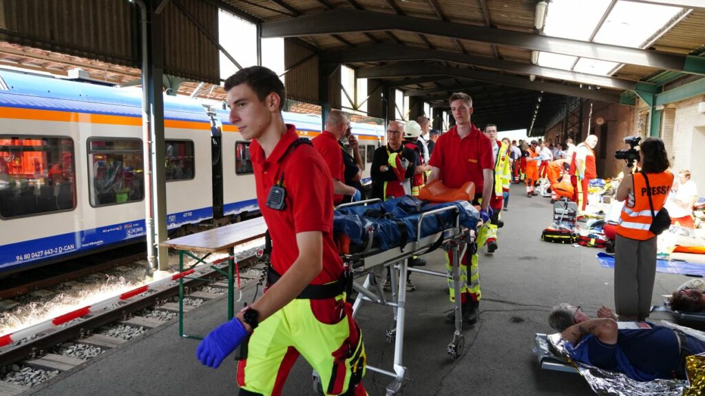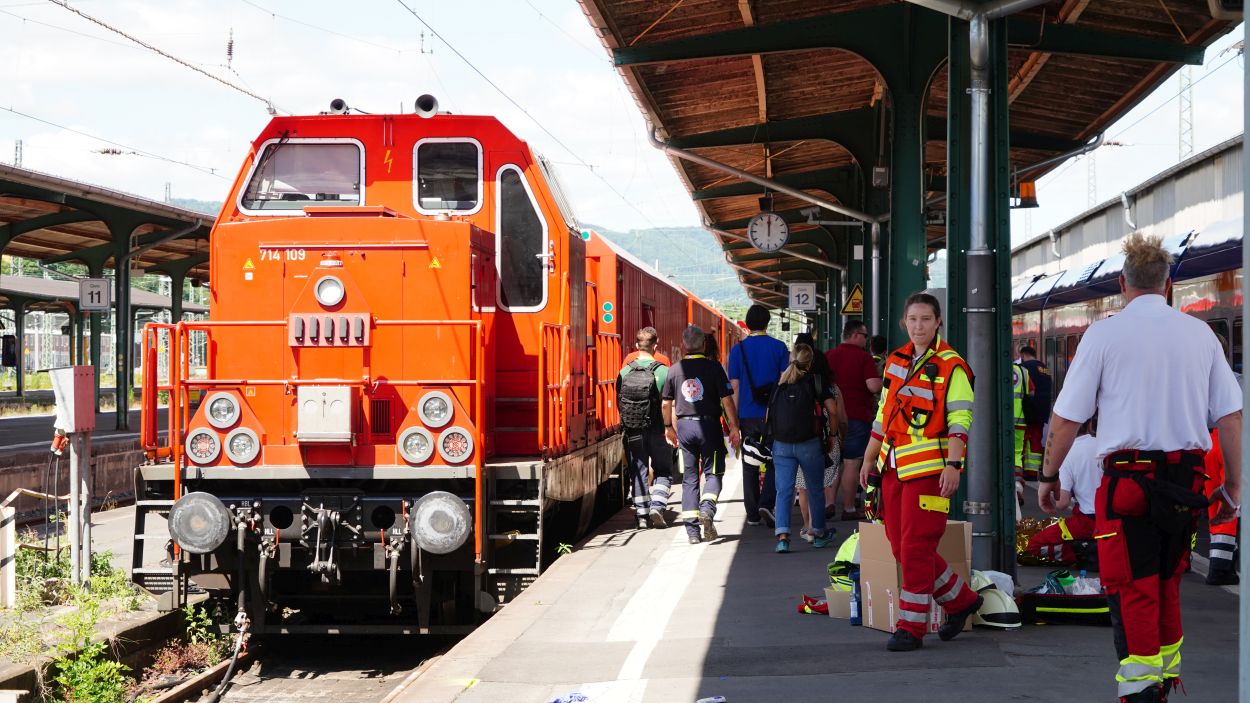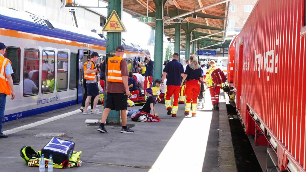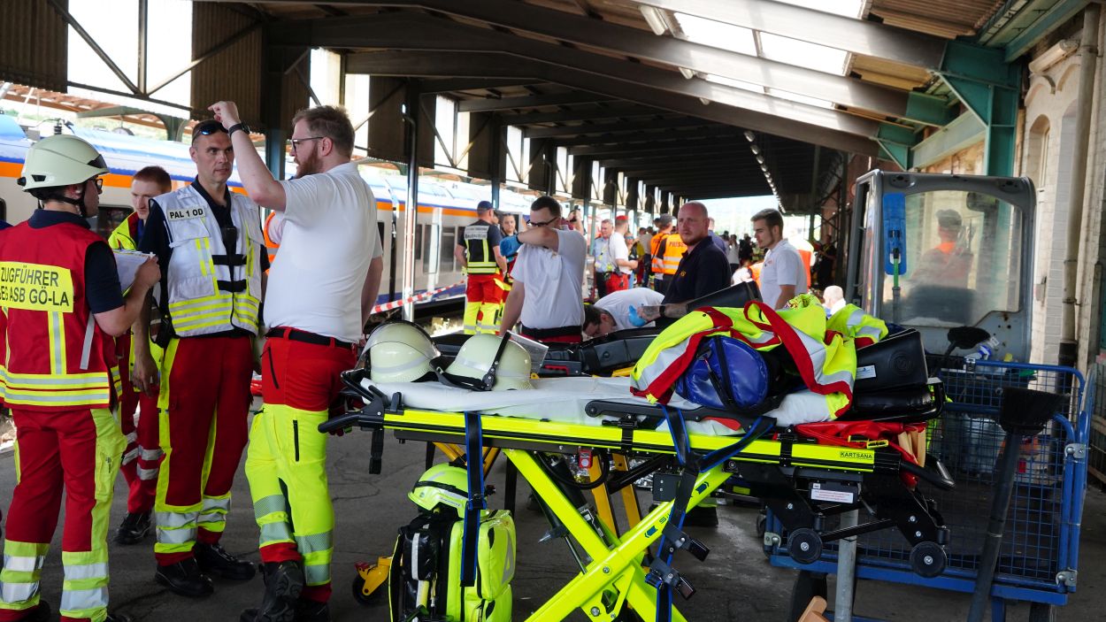 Kassel – Mit Blaulicht und Sirenen probte der Arbeiter-Samariter-Bund (ASB) am Samstag in Kassel den Ernstfall. Im Zentrum der bundesweiten Katastrophenschutzübung stand ein inszeniertes Zugunglück am Hauptbahnhof: Ein entgleister Regionalzug, viele Verletzte, Chaos auf dem Bahnsteig. Rund 100 Statisten mit täuschend echten Wunden stellten die Einsatzkräfte vor große Herausforderungen. Geübt wurde an einem gesperrten Gleis – der Bahnverkehr lief weiter. Doch das war nur eines von drei Szenarien. Nahe dem Herkules suchten Rettungshunde in einem Waldgebiet nach vermissten Personen nach einem angenommenen Ballonabsturz. Auf der Fulda wurde der Einsatz nach einem gekenterten Boot mit mehreren Verletzten im Wasser geübt. Insgesamt beteiligten sich rund 900 Personen an der Übung, darunter 650 Einsatzkräfte mit 250 Fahrzeugen aus dem gesamten Bundesgebiet und dem europäischen Ausland.