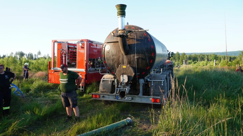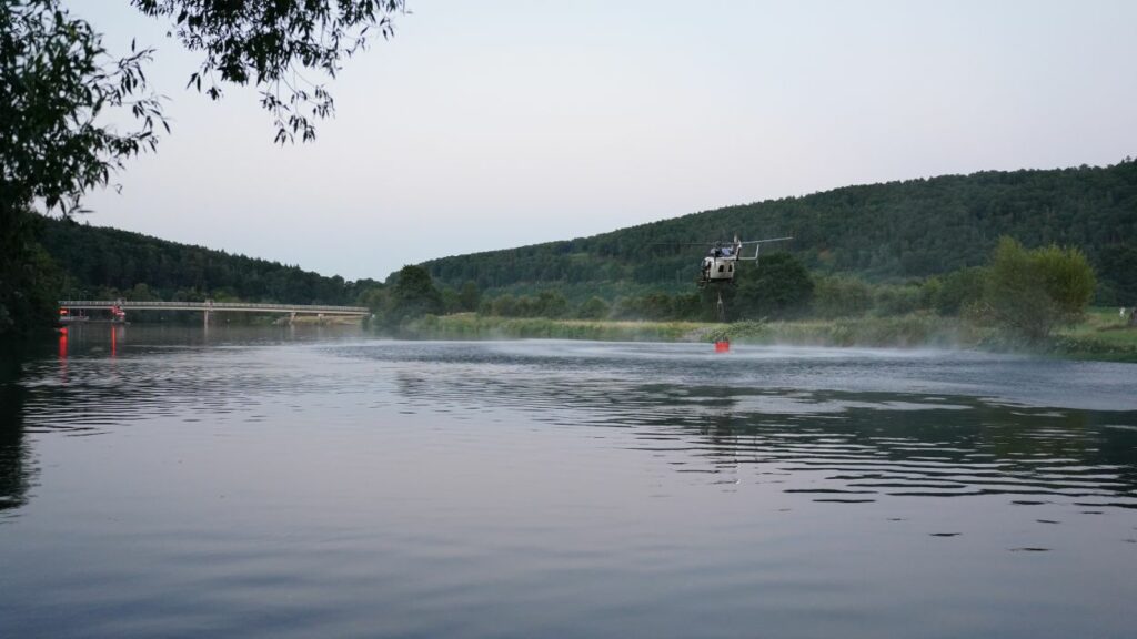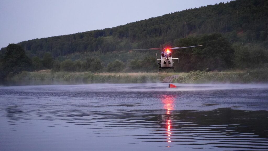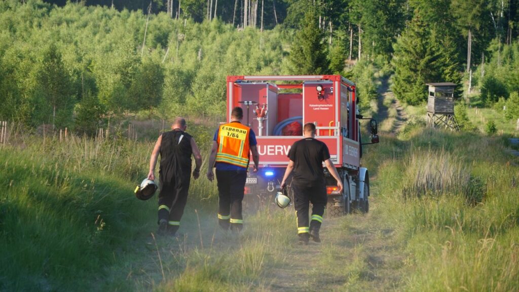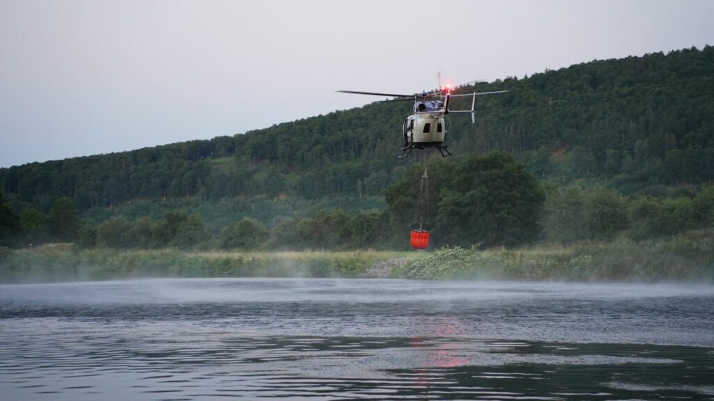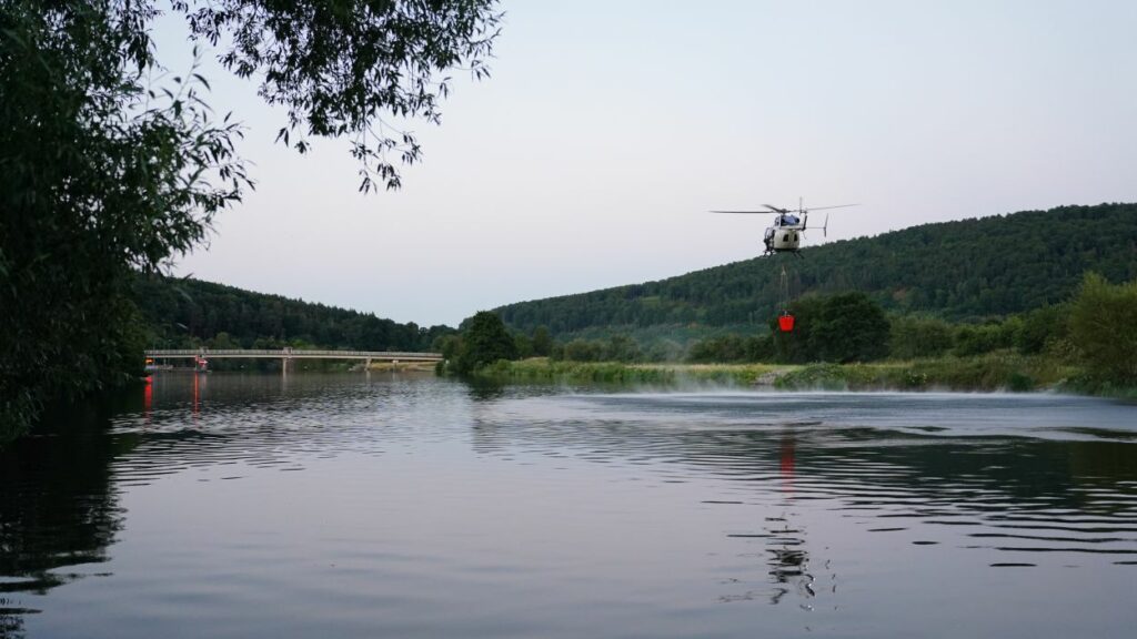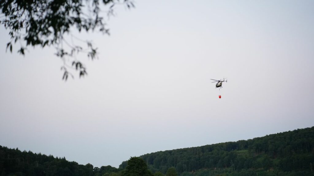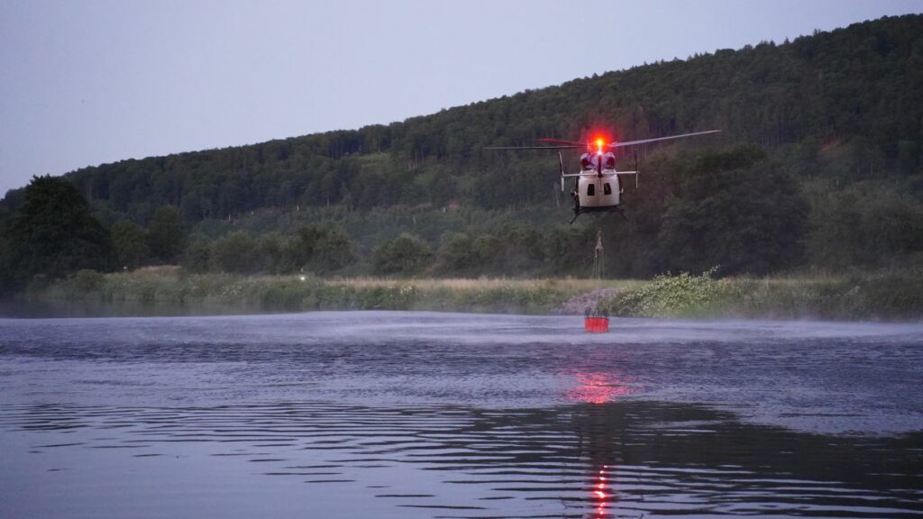 Am Abend wurde zusätzlich ein Löschhubschrauber von der Landespolizei aus Egelsbach (Südhessen) angefordert. Mit einem sogenannten Bambi-Bucket entnahm er Wasser aus der nahegelegenen Fulda bei Wilhelmshausen und warf es gezielt über die Brandfläche ab. Auch der Wasserversorgungzug der Kreisfeuerwehrbereitschaft Göttingen sowie die GFFF-V Einheit aus den Landkreisen Göttingen und Goslar (Niedersachsen) kamen zum Einsatz. Der Brandschutzaufsichtsdienst des Landkreis Kassel überwachte die Einsatzstelle. Die Löscharbeiten gestalteten sich als äußerst schwierig: Die Brandstelle lag etwa 80 Meter abseits geschotterter Wege, zudem erschwerten Temperaturen jenseits der 30 Grad die Arbeiten erheblich. Auch HessenForst war vor Ort und unterstützte die Feuerwehr mit wertvoller Ortskenntnis, um die Einsatzkräfte schnell zur Brandstelle zu lotsen. Erst tief in der Nacht konnten die Flammen unter Kontrolle gebracht werden. Um letzte Glutnester wirksam zu bekämpfen, wurde dem Löschwasser ein Netzmittel (Schaum) zugesetzt. Die Brandursache ist derzeit noch unklar – die Polizei hat die Ermittlungen aufgenommen.