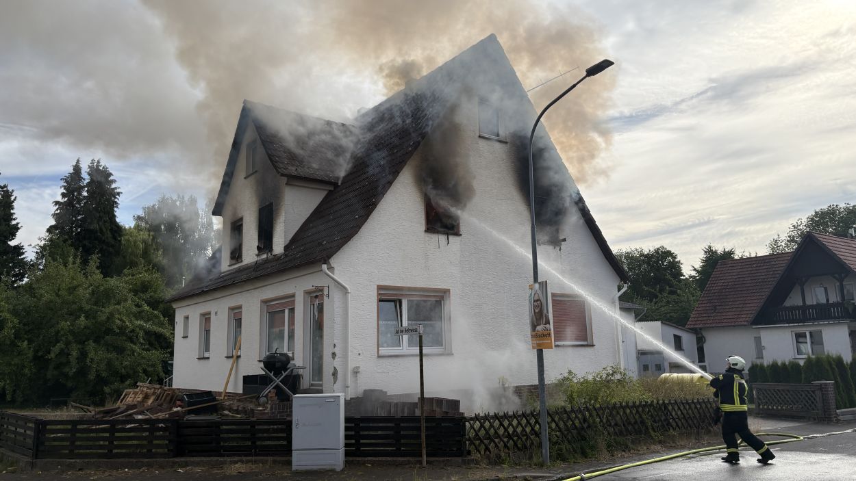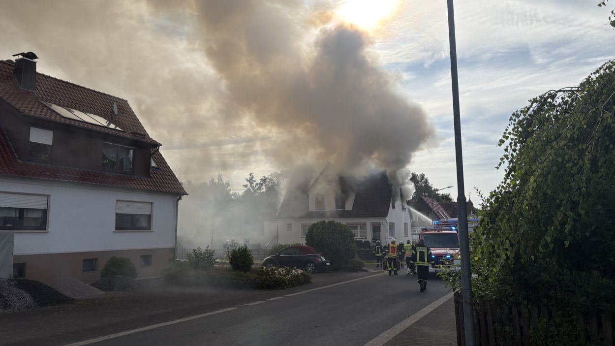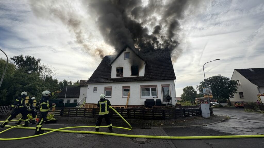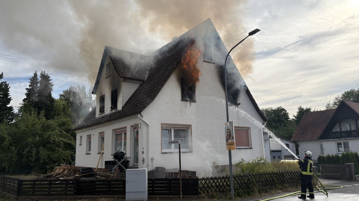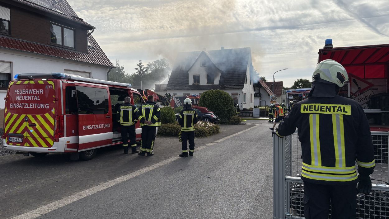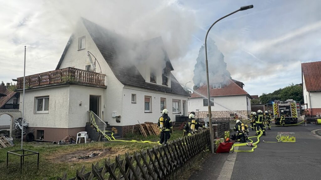 Neuental – Zu einem Wohnhausbrand mit zwei verletzten Person kam es am Samstag Vormittag in Zimmersrode in der Straße „Auf der Heilswiese“. Bei Eintreffen der ersten Einsatzkräfte schlugen bereits die Flammen aus den Fenstern des Obergeschosses. Die Rauchsäule war Kilometerweit zu sehen. Da für die Brandschützer zunächst ein Innenangriff nicht möglich war, gingen man mit fünf C-Strahlrohren von Außen durch die Fenster vor. Erst im Verlauf konnten im mInneren des Gebäudes alle Räume auf weitere Brandherde und Glutnester kontrolliert werden. Später wurde zudem mit Hilfe der Drehleiter das Dach geöffnet und die Löschmaßnahmen intensiviert. Die anfänglichen Schwierigkeiten mit dem Aufbau der Löschwasserversorgung konnte schnell abgestellt werden. In dem Bereich der Einsatzstelle standen mehrere Hydranten zur Verfügung und nach kurzer Zeit waren über 60 Einsatzkräfte der Neuentaler Wehren vor Ort.