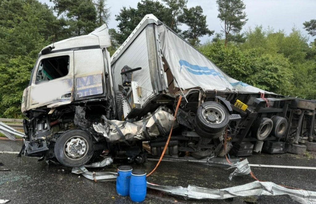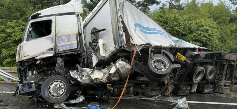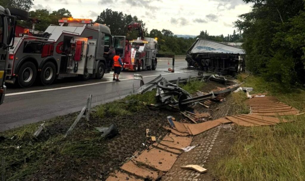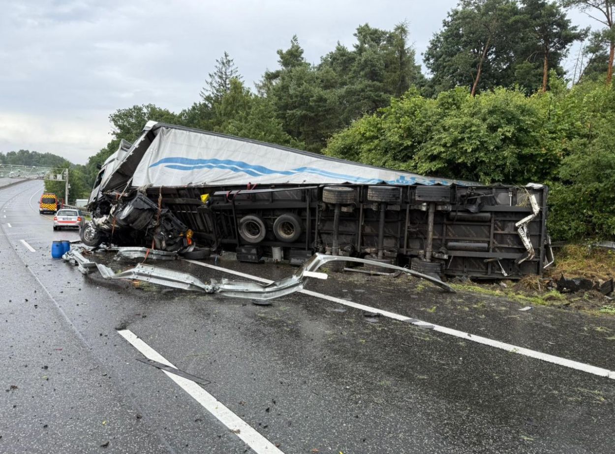 Melsungen – Am Montagnachmittag kam es gegen 16.40 Uhr auf der A7 zwischen Melsungen und Guxhagen zu einem schweren Lkw-Unfall. Ein 47-jähriger Fahrer verlor bei starkem Regen die Kontrolle über seinen Sattelzug einer tschechischen Spedition. Das Fahrzeug kam von der Fahrbahn ab, beschädigte rund 70 Meter Schutzplanke und kippte um. Aus dem Motorraum trat Rauch aus – Ersthelfer versuchten den entstehenden Brand mit Feuerlöschern zu bekämpfen. Die Feuerwehr Melsungen löschte das Feuer unter Atemschutz. Der Fahrer konnte sich selbst befreien und wurde ambulant behandelt. Laut Notarzt blieb er unverletzt. Der Lkw hatte Dämmmaterial geladen, ein Teil davon verteilte sich neben der Fahrbahn im Graben. Feuerwehr und Polizei sicherten die Unfallstelle und streuten ausgelaufene Betriebsstoffe ab. Die Polizei schätzt den Schaden auf mindestens 50.000 Euro. Als Unfallursache gilt nicht angepasste Geschwindigkeit bei nasser Fahrbahn. Die A7 Richtung Norden war während der Bergungsarbeiten voll gesperrt.