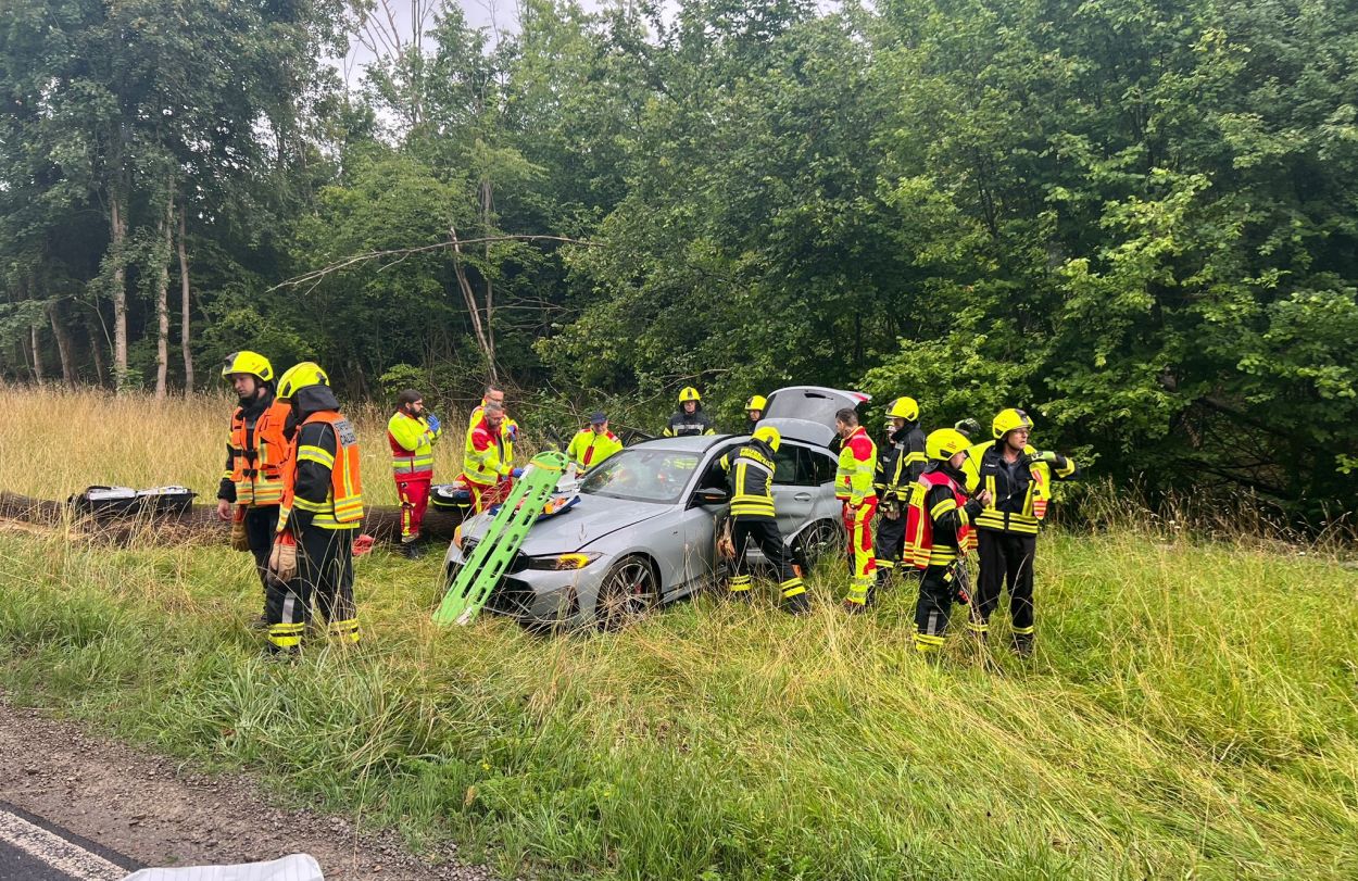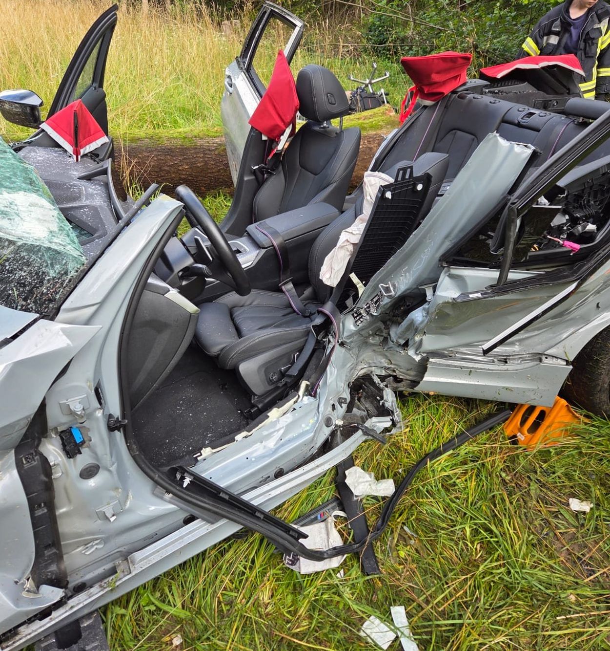 Calden – Am Samstagnachmittag kam es gegen 17:10 Uhr auf der Kreisstraße 32 zwischen Meimbressen und der Bundesstraße 7 zu einem schweren Verkehrsunfall. Ein BMW M340i mit Mild-Hybrid-Antrieb kam aus bislang ungeklärter Ursache alleinbeteiligt nach rechts von der Fahrbahn ab und prallte gegen mehrere am Straßenrand gelagerte Baumstämme. Durch die Wucht des Aufpralls wurde die Fahrerseite des Fahrzeugs massiv deformiert, wodurch der Fahrer im Bereich der Hüfte und Beine eingeklemmt wurde. In enger Abstimmung mit dem Rettungsdienst leitete die Feuerwehr der Gemeinde Calden eine patientenschonende Rettung ein.