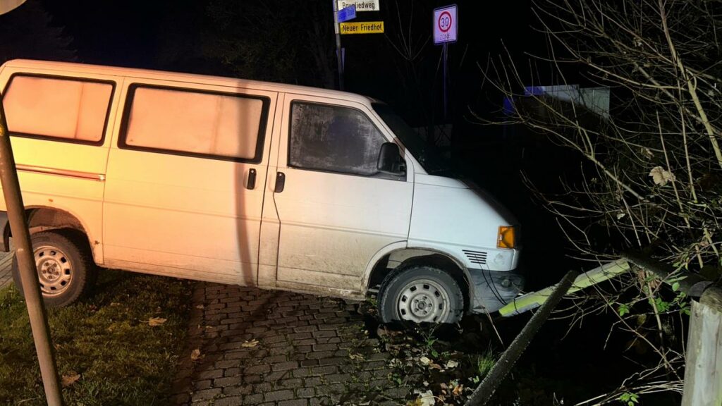 Beim Abbiegen in den Bovelidweg kam das Auto schließlich von der Fahrbahn ab, durchbrach ein Holzgeländer und blieb mit dem Motorblock in einem Graben stecken. Als der Unfallfahrer bemerkte, dass ein Zeuge den Notruf wählte, setzte er zur Flucht an – zu Fuß.